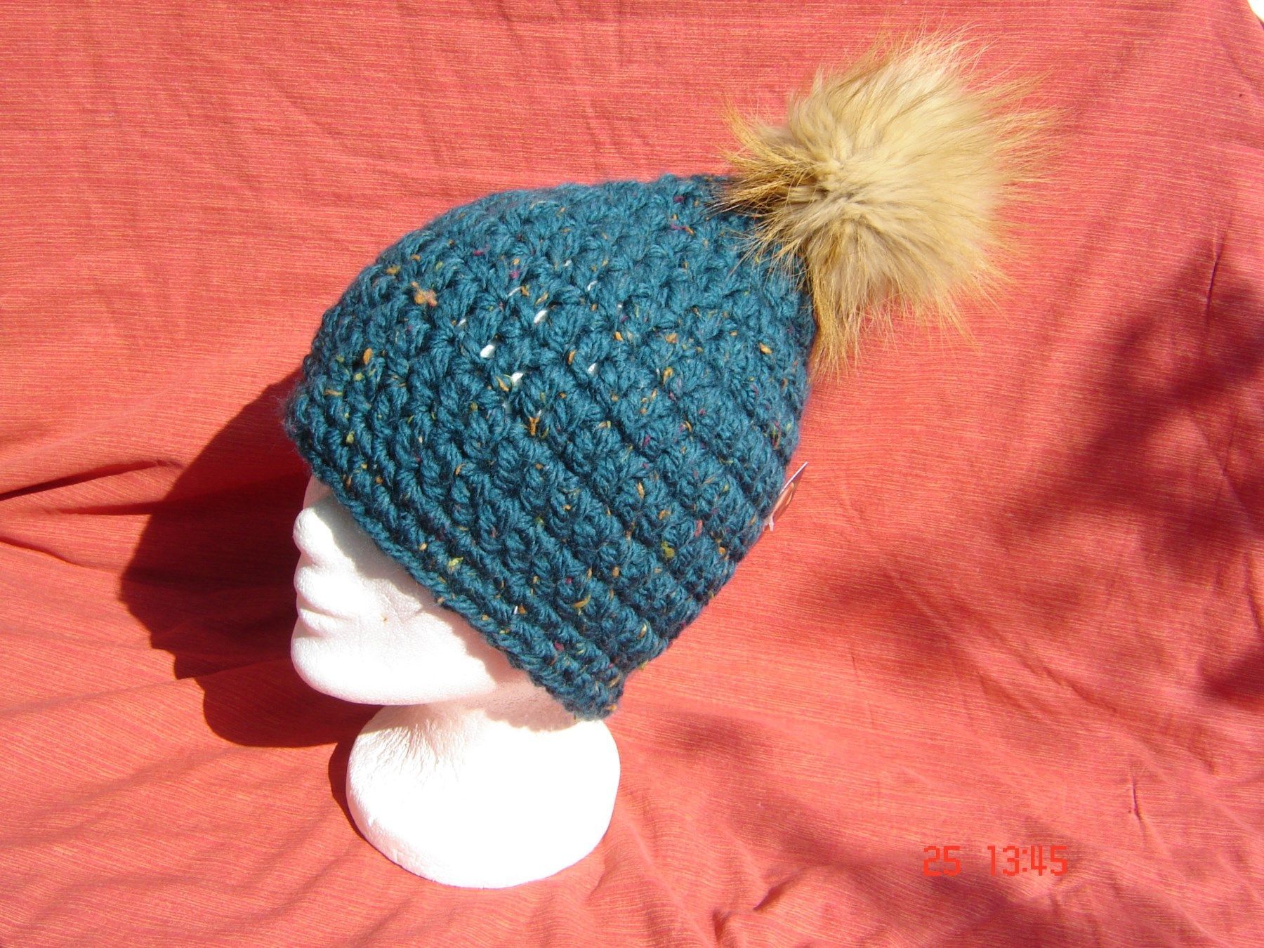Häkelmütze m Pelzbommel handgehäkelt petrolgrün Strickmütze Handarbeit p B9 Z