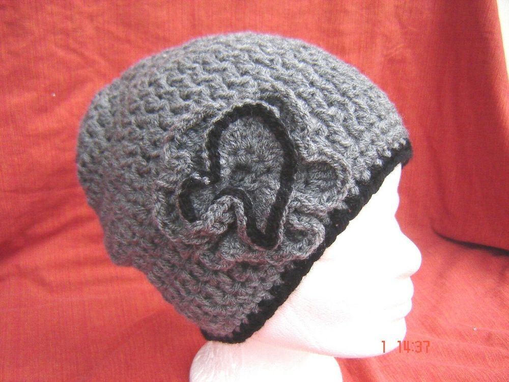 Häkelmütze topaktuell mit Blume handgehäkelt Strickmütze schwarz grau Handarbeit B10Z