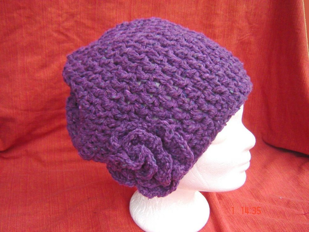 Häkelmütze topaktuelle große Form handgehäkelt mit Häkelblume lila Handarbeit p B10 Z