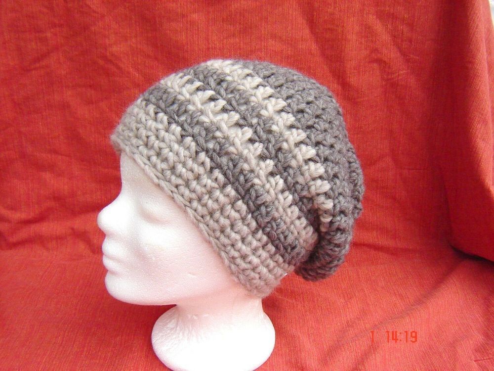. wunderbare große Strickmütze Häkelmütze toller geräumiger Schnitt lange Form die nach hinten runter hängt , auch mit Bommel zu tragen oder man steckt alle Haare mit rein 2farbig in braun und helltaupe die Mützen werden in Deutschland handgehäkelt , deutsche Handarbeit aus wunderbar weichem Garn ge