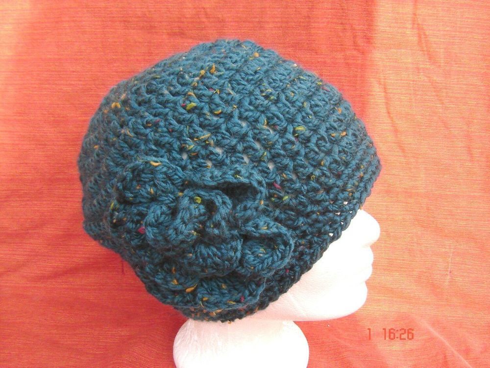 . wunderbare runde Häkelmütze mit großer Häkelblume toller geräumiger Schnitt in Farbe dunkelgrün die Mützen werden in Deutschland handgehäkelt , deutsche Handarbeit aus wunderbarem TweedGarn gehäkelt 75 % Polyacryl 25 % Wolle die Größe passt von 57 bis 60 cm Kopfumfang , . Bitte sehen Sie sich hier