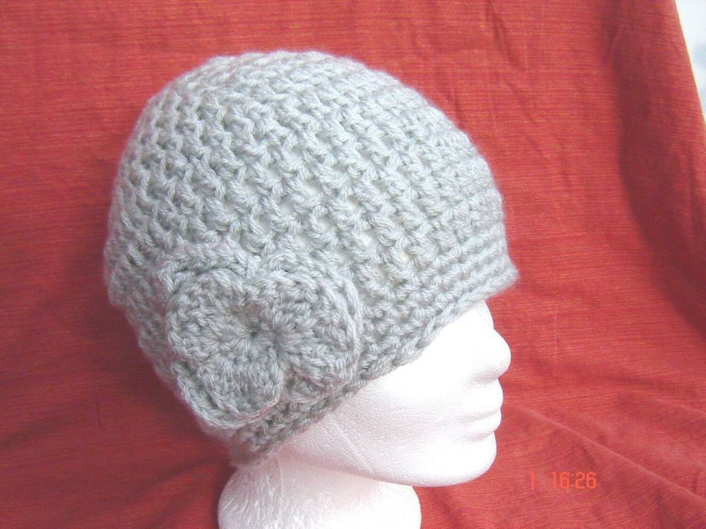 . topaktuelle Strickmütze Häkelmütze runde Form die am Kopf anliegt mit einer großen Häkelblume in Farbe hellgrau die Mützen werden in Deutschland handgehäkelt , deutsche Handarbeit aus babyweichem 100% Polyacryl die Größe passt von 55 bis 58 cm Kopfumfang , . Bitte sehen Sie sich hier alle meine me