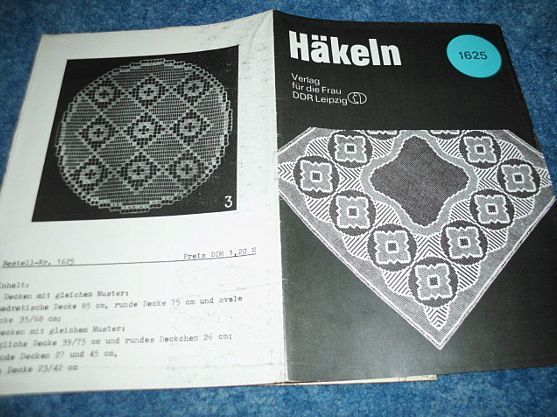 Handarbeitsheft aus der DDR Häkeln aus dem Verlag für die Frau Bestellnummer 1625 Format 14,5 x 21 cm Das Heft besteht aus einen Umschlag und aus Bögen Inhalt: 3 Decken mit gleichem Muster-quadratische Decke 85cm, runde Decke 75cm, und ovale Decke 35 68cm, 2 Decken mit gleichen Muster -längliche Dec
