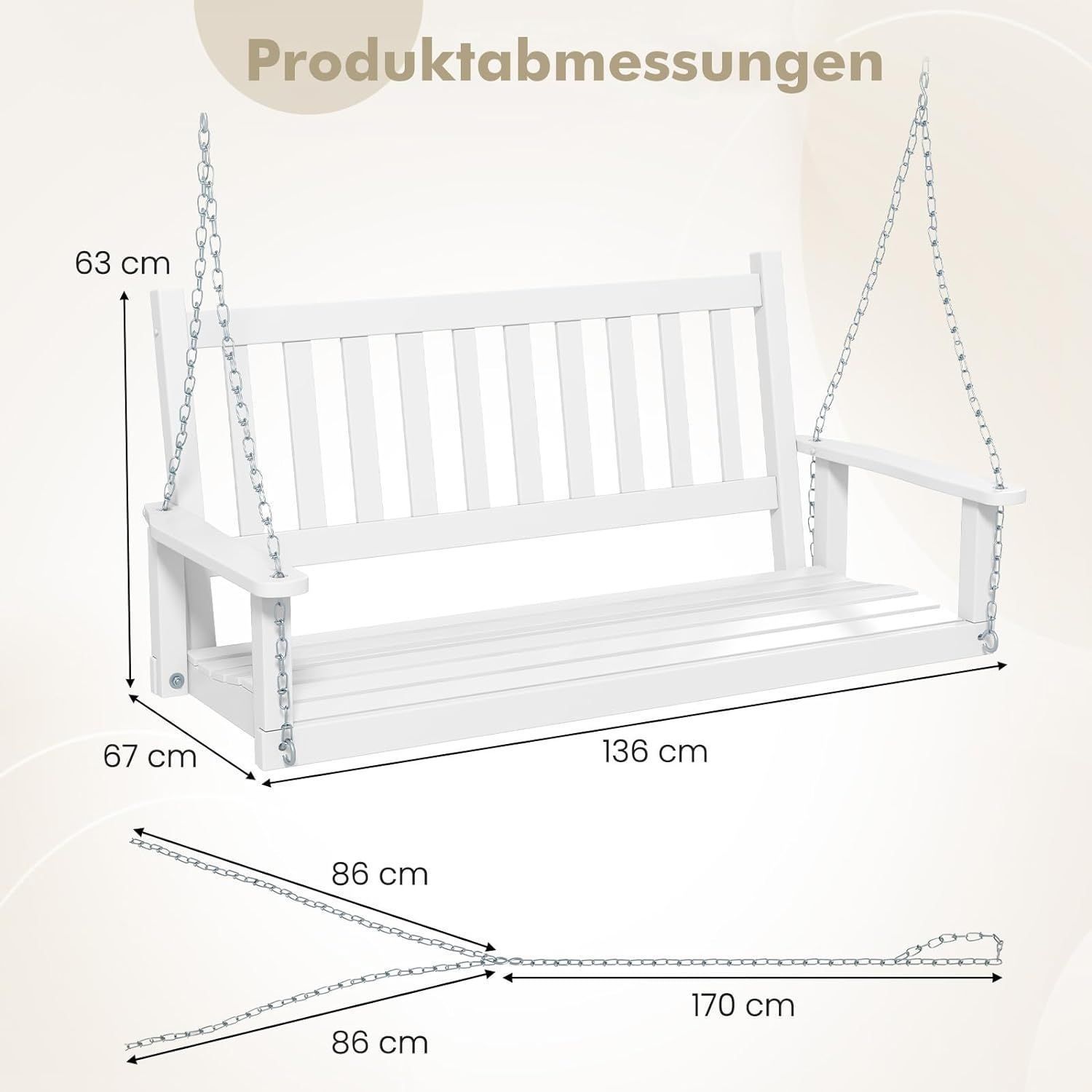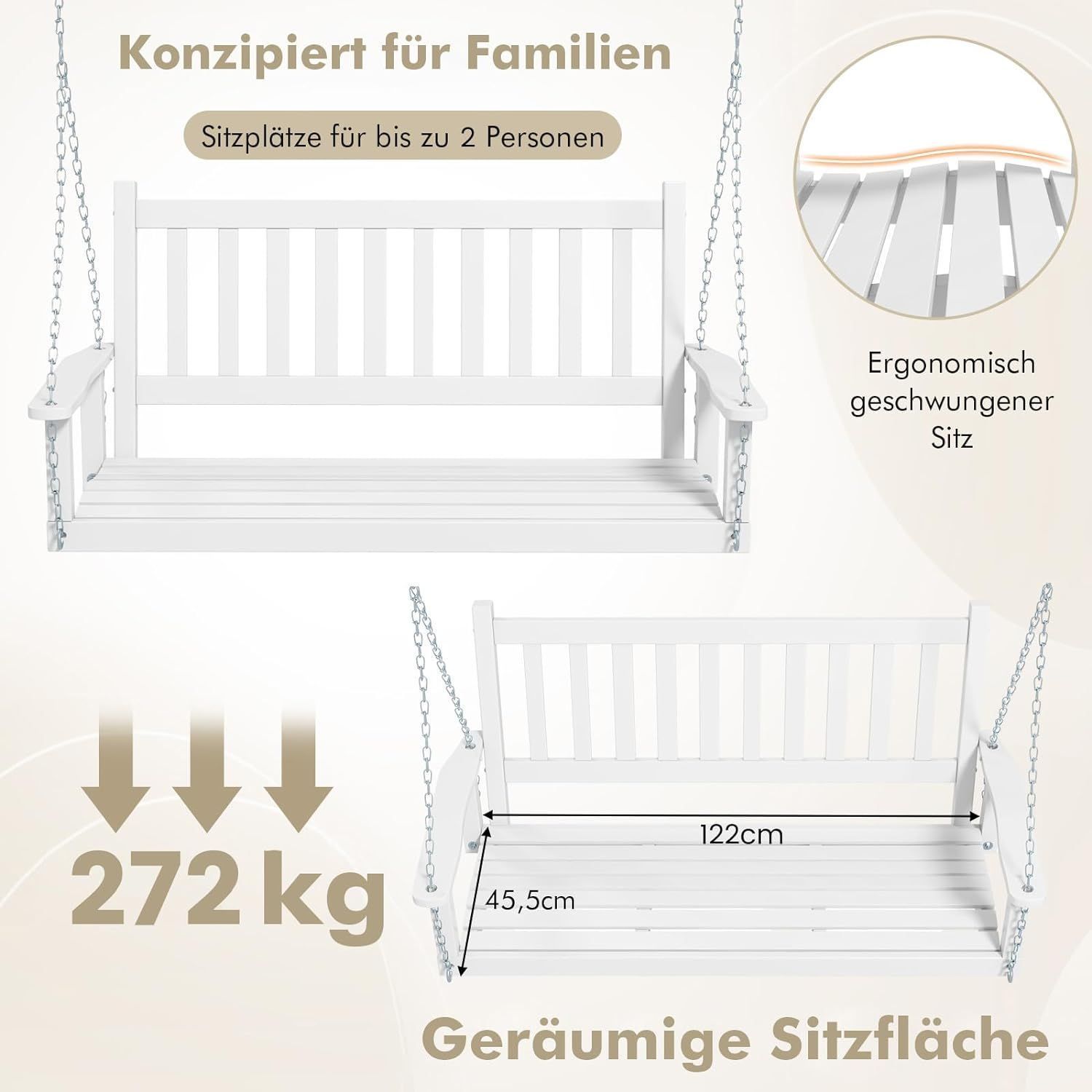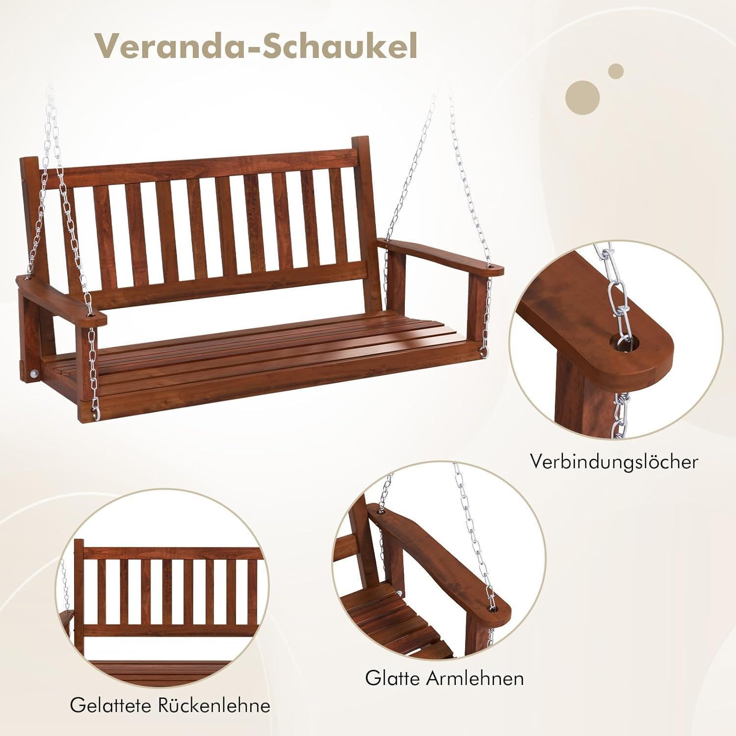 Hängebank aus Massivholz, 2-Sitzer Gartenschaukel zum Aufhängen, Hollywoodschaukel