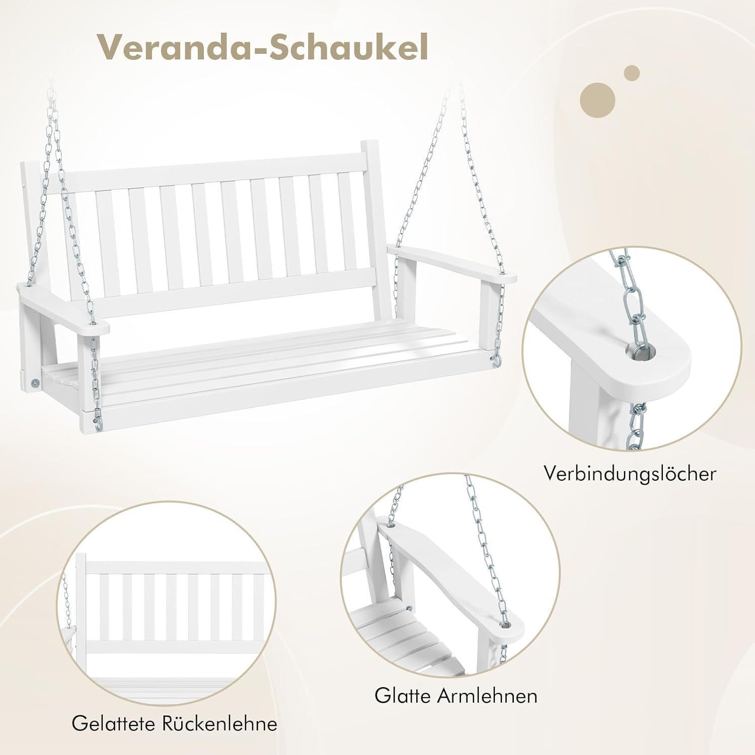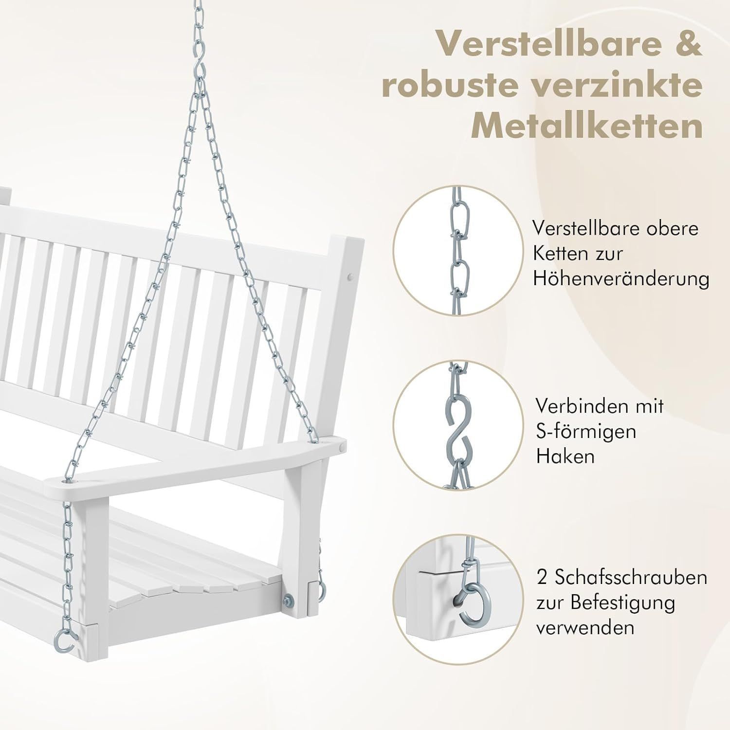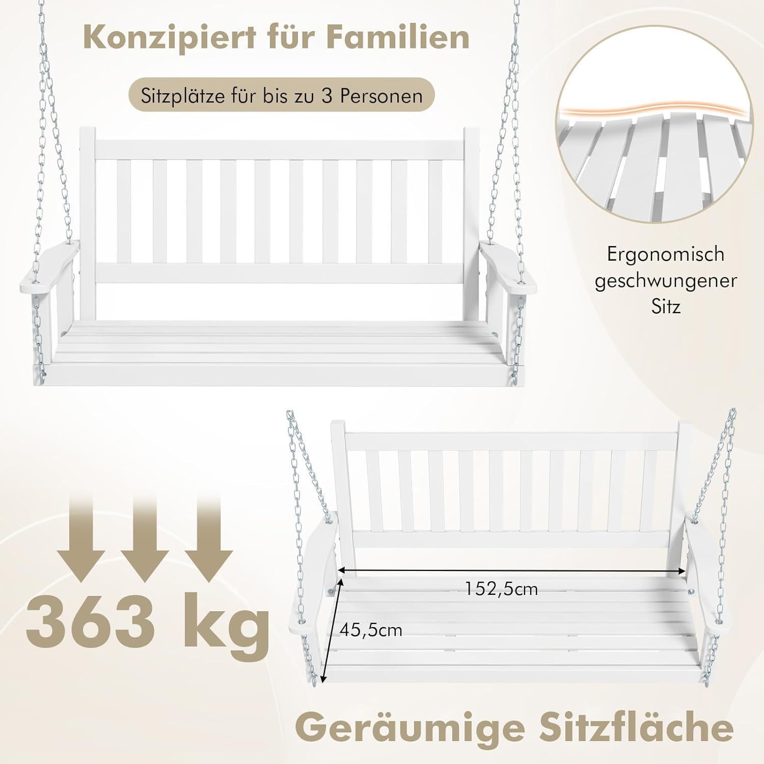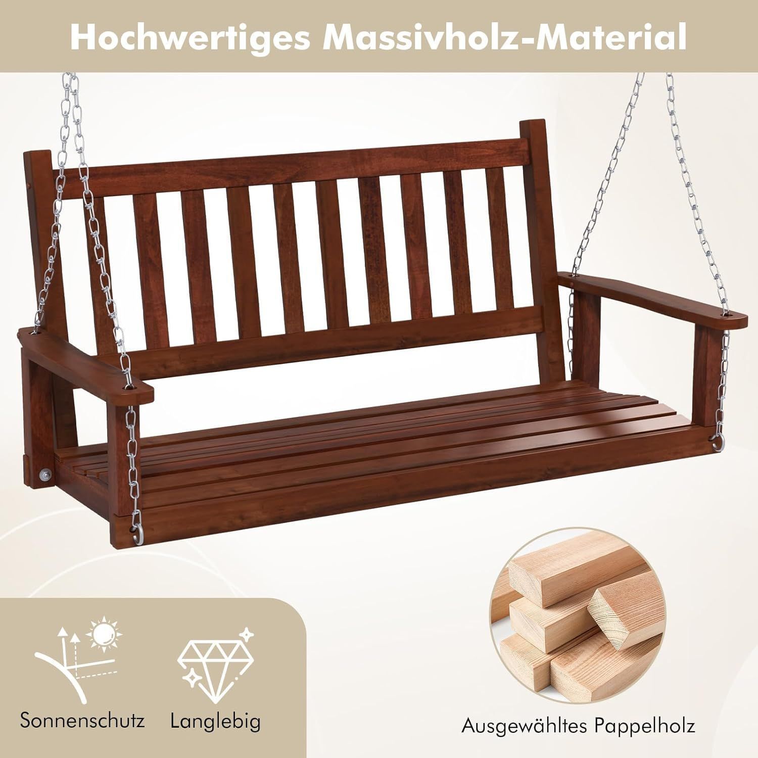 Hängebank aus Massivholz, 3-Sitzer Gartenschaukel zum Aufhängen, Hollywoodschaukel