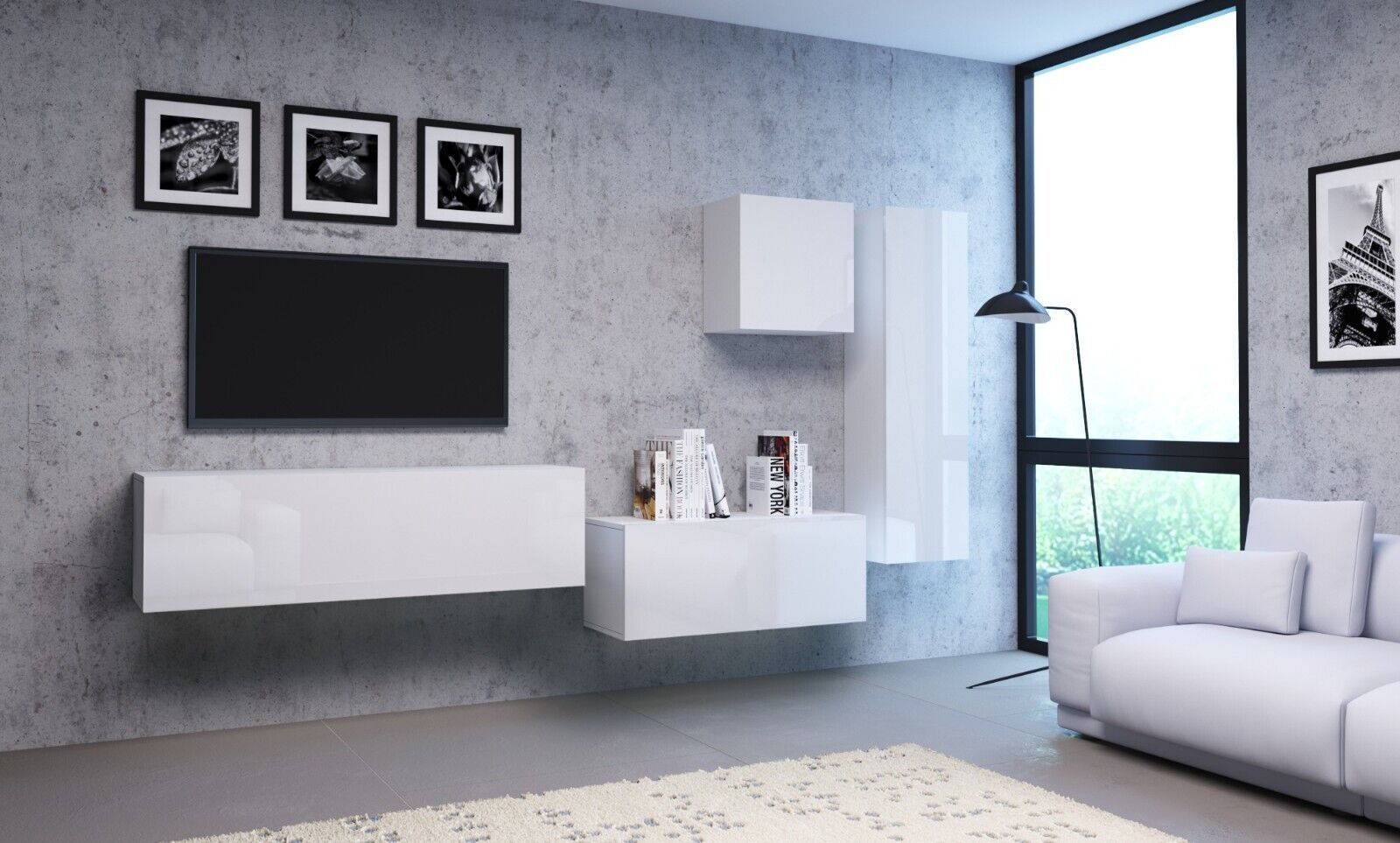 • Hängeschrank Sideboard SOPHIA 190 cm Kommode Anrichte Lowboard Weiß Hochglanz