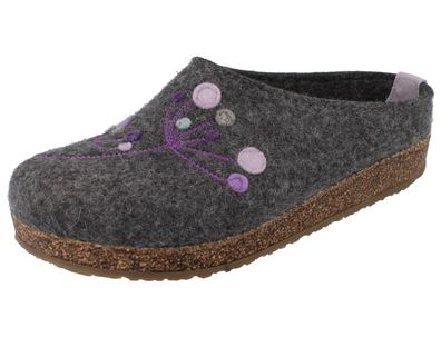 • Haflinger Grizzly Amaya Damen Hausschuhe dunkelgrau bestickt mit Dolden Wollfilz