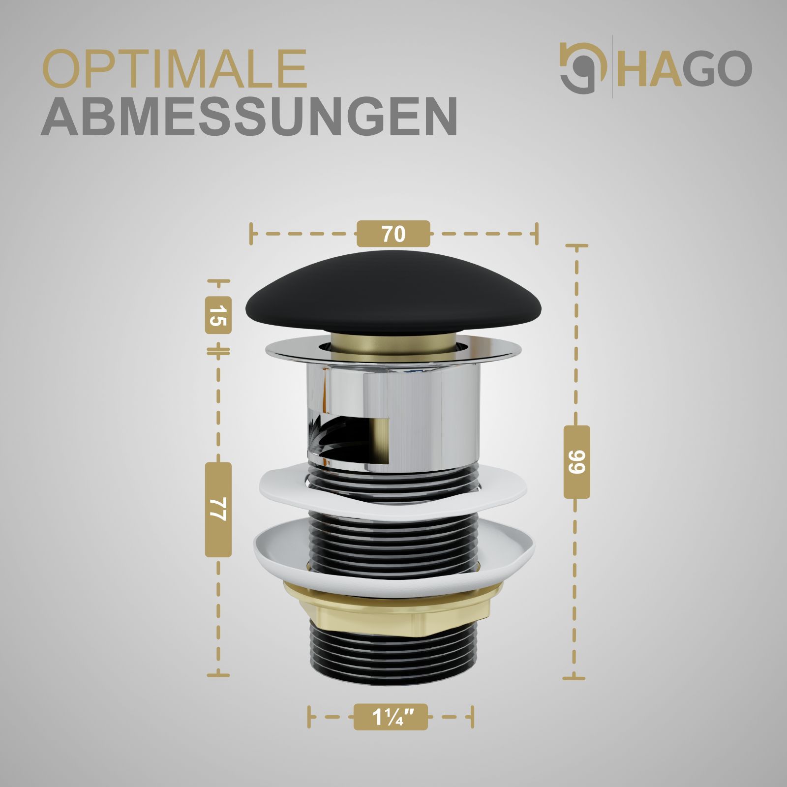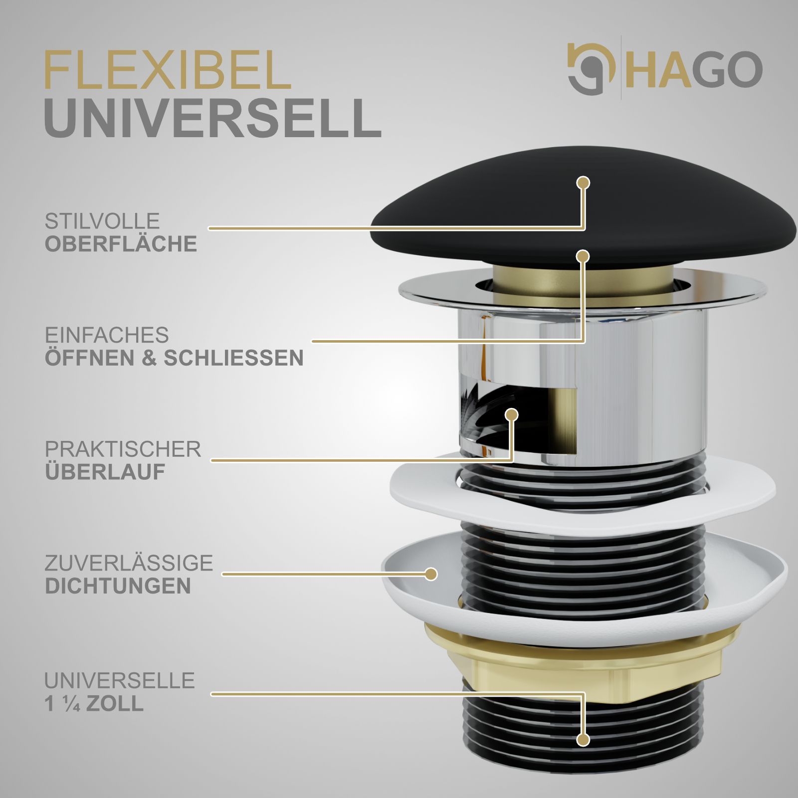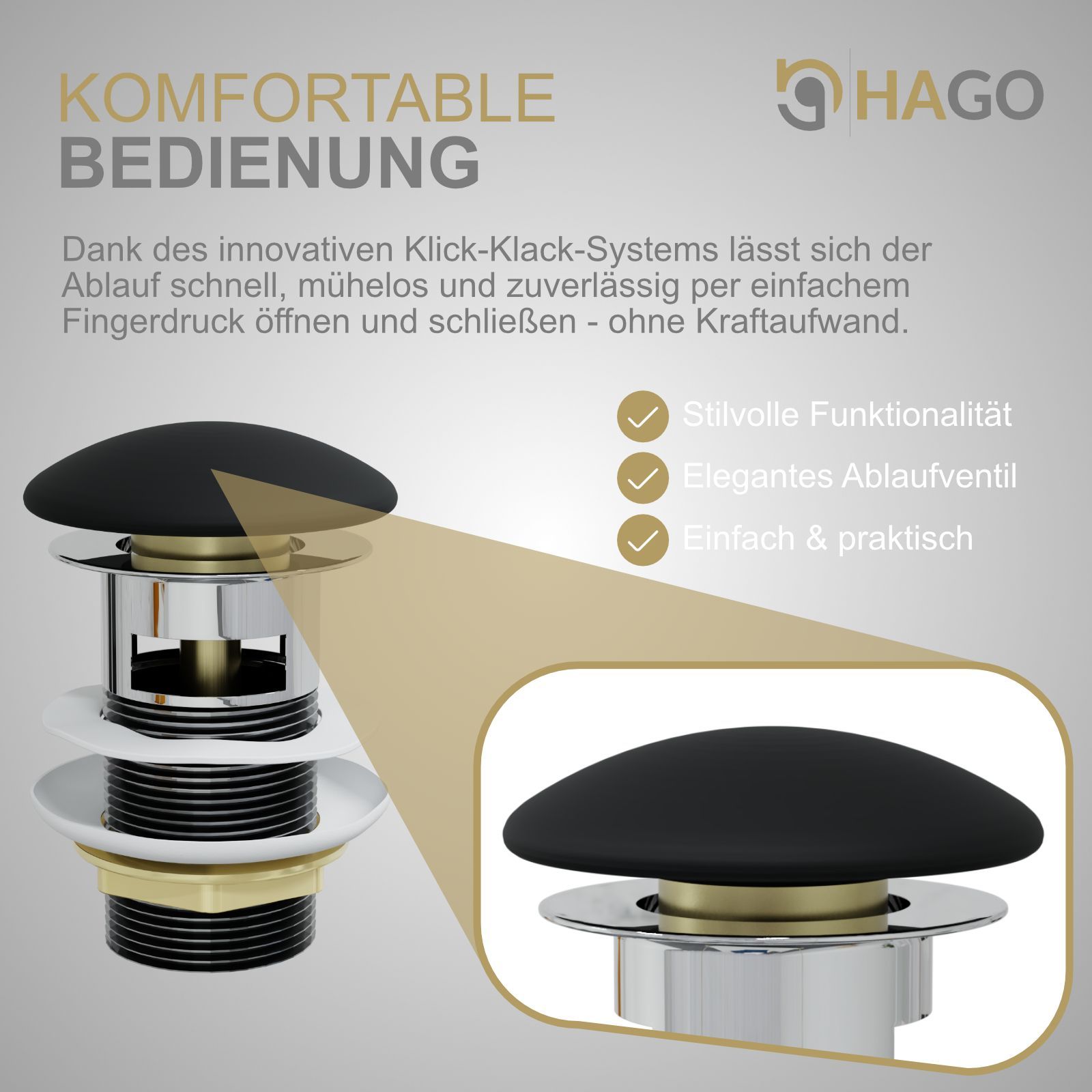 HAGO® Ablaufventil Schwarz Waschbecken mit Überlauf Push-Open Garnitur 1 1/4 Uni