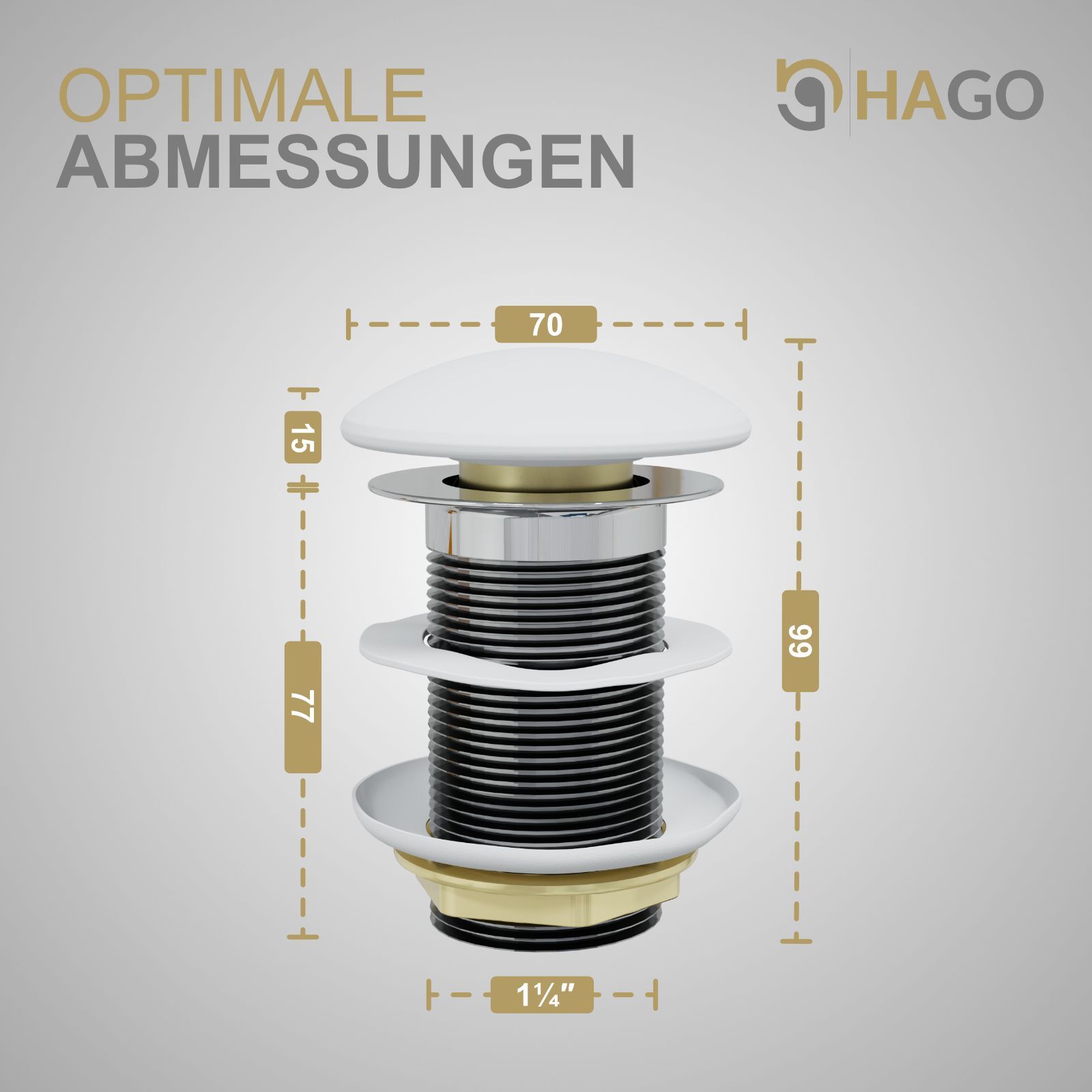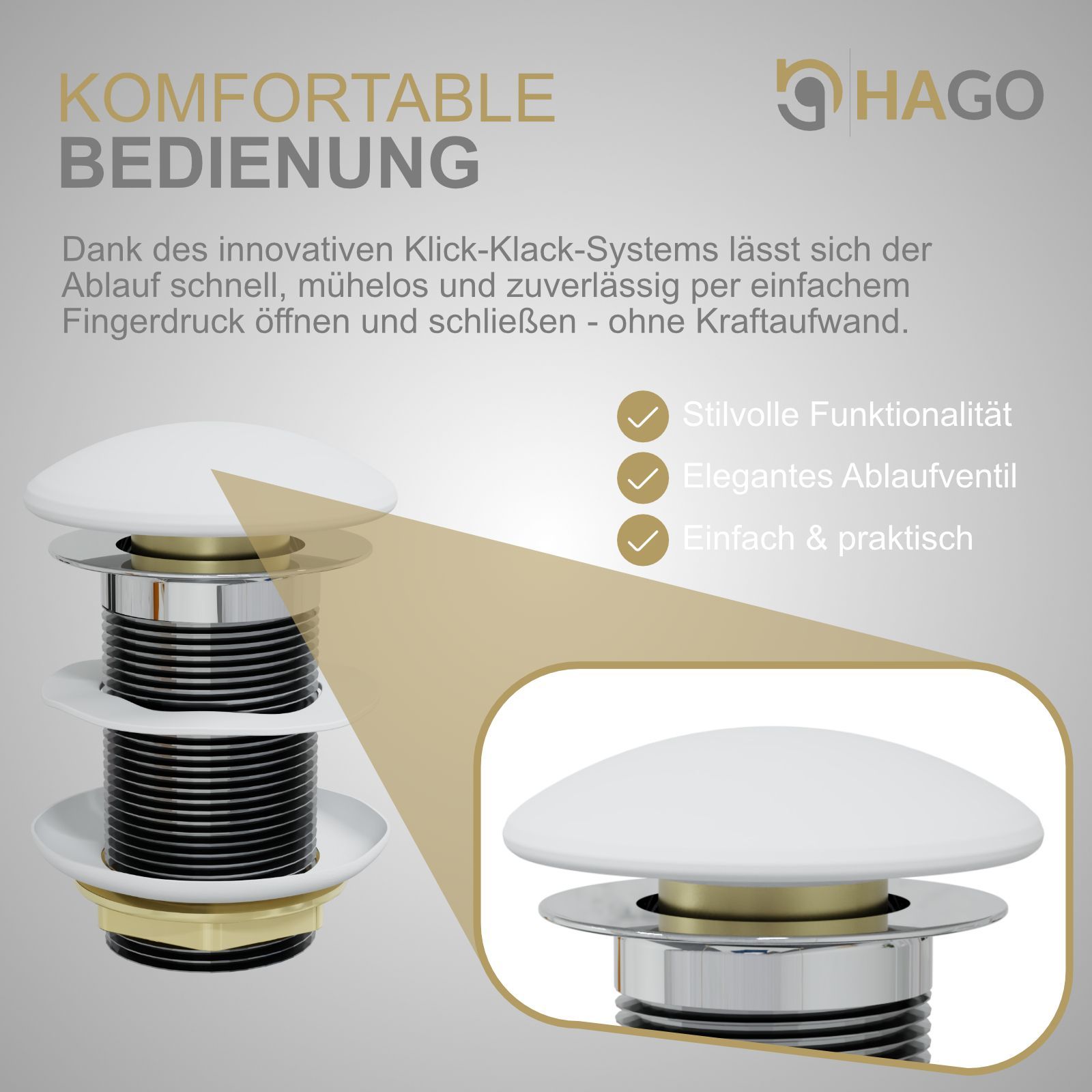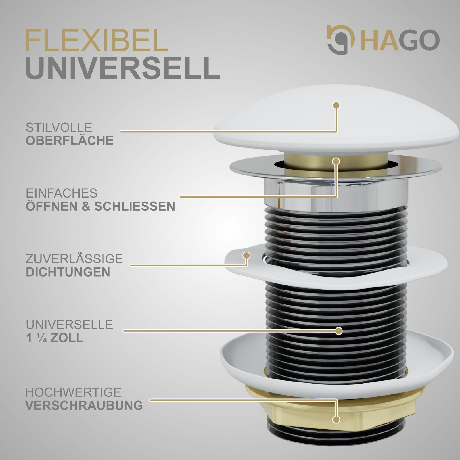 HAGO® Ablaufventil Weiß Waschbecken ohne Überlauf Push-Open Garnitur 1 1/4" Univ