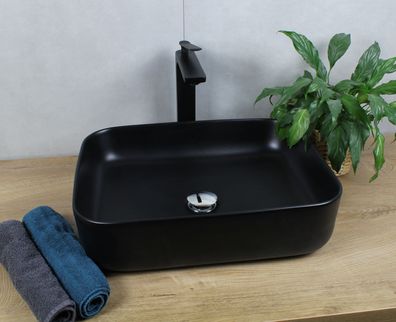 HAGO® Keramik Waschbecken eckig 510x360x130 mm schwarz matt mit Überlauf Aufsatz