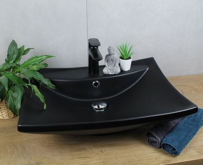 HAGO® Keramik Waschbecken eckig 600x365x130 mm schwarz matt mit Überlauf Aufsatz