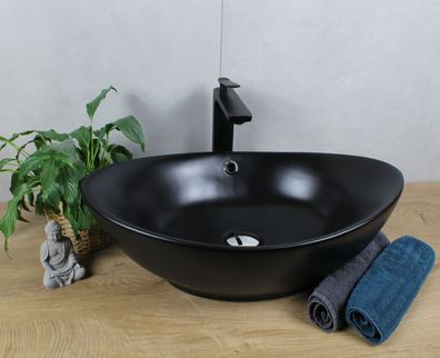 HAGO® Keramik Waschbecken oval 590x380x190 schwarz matt mit Überlauf Aufsatz