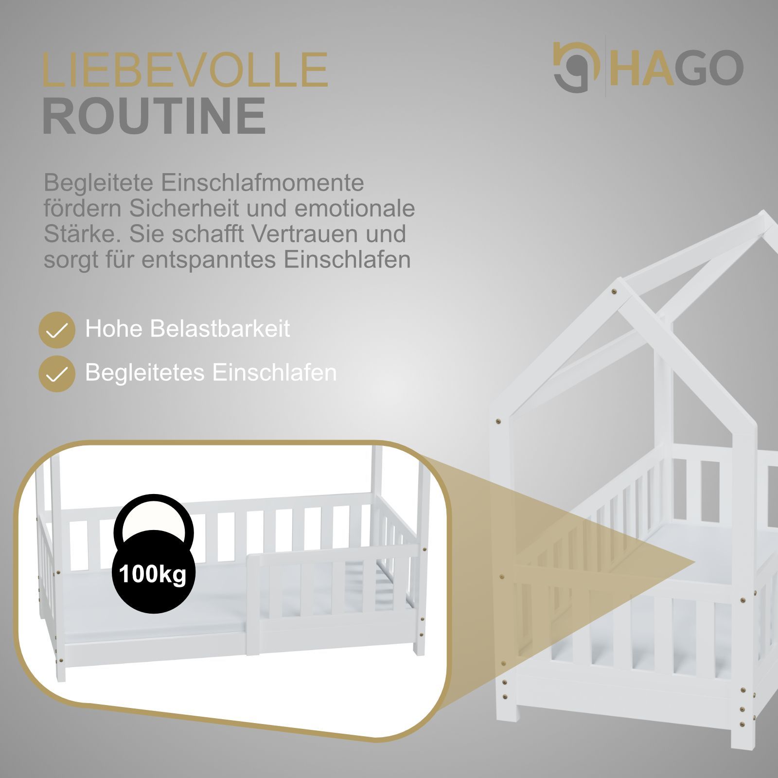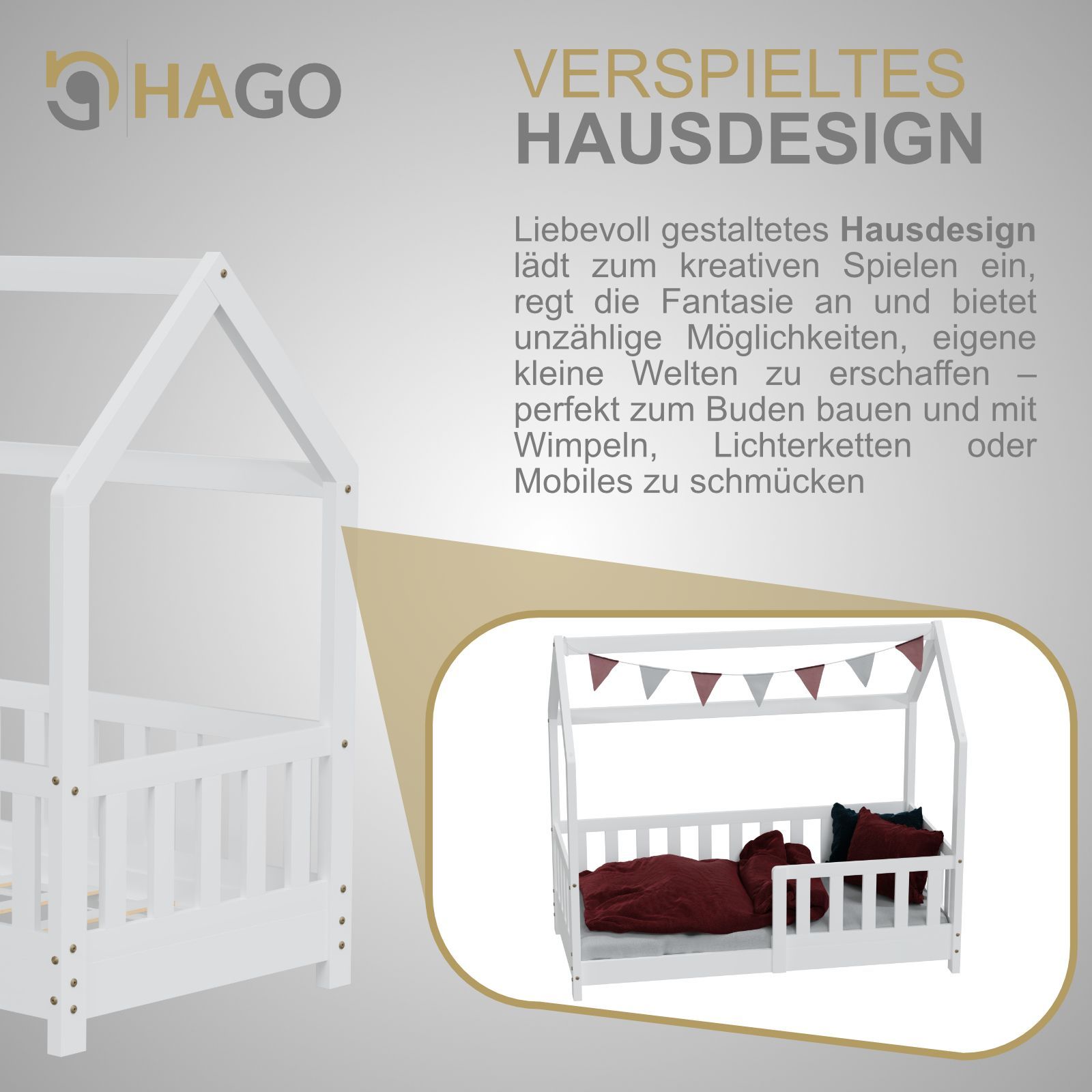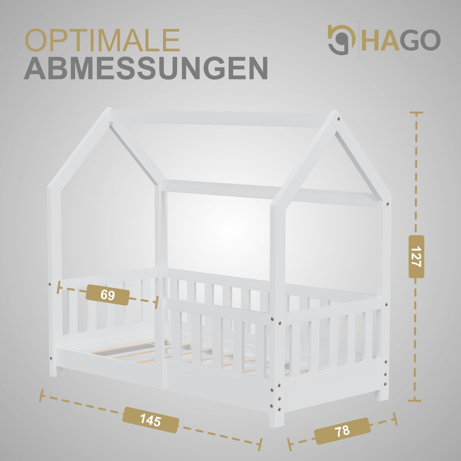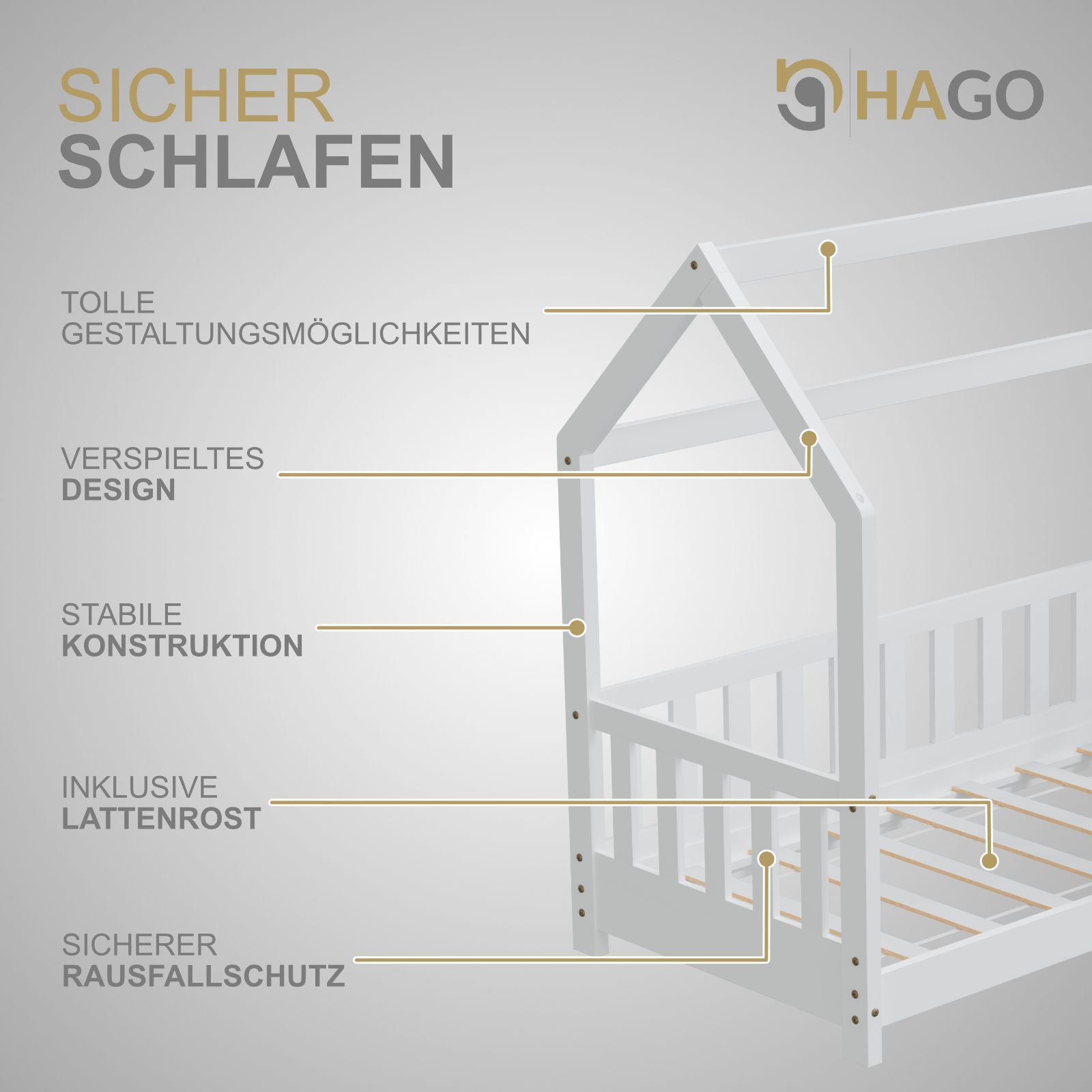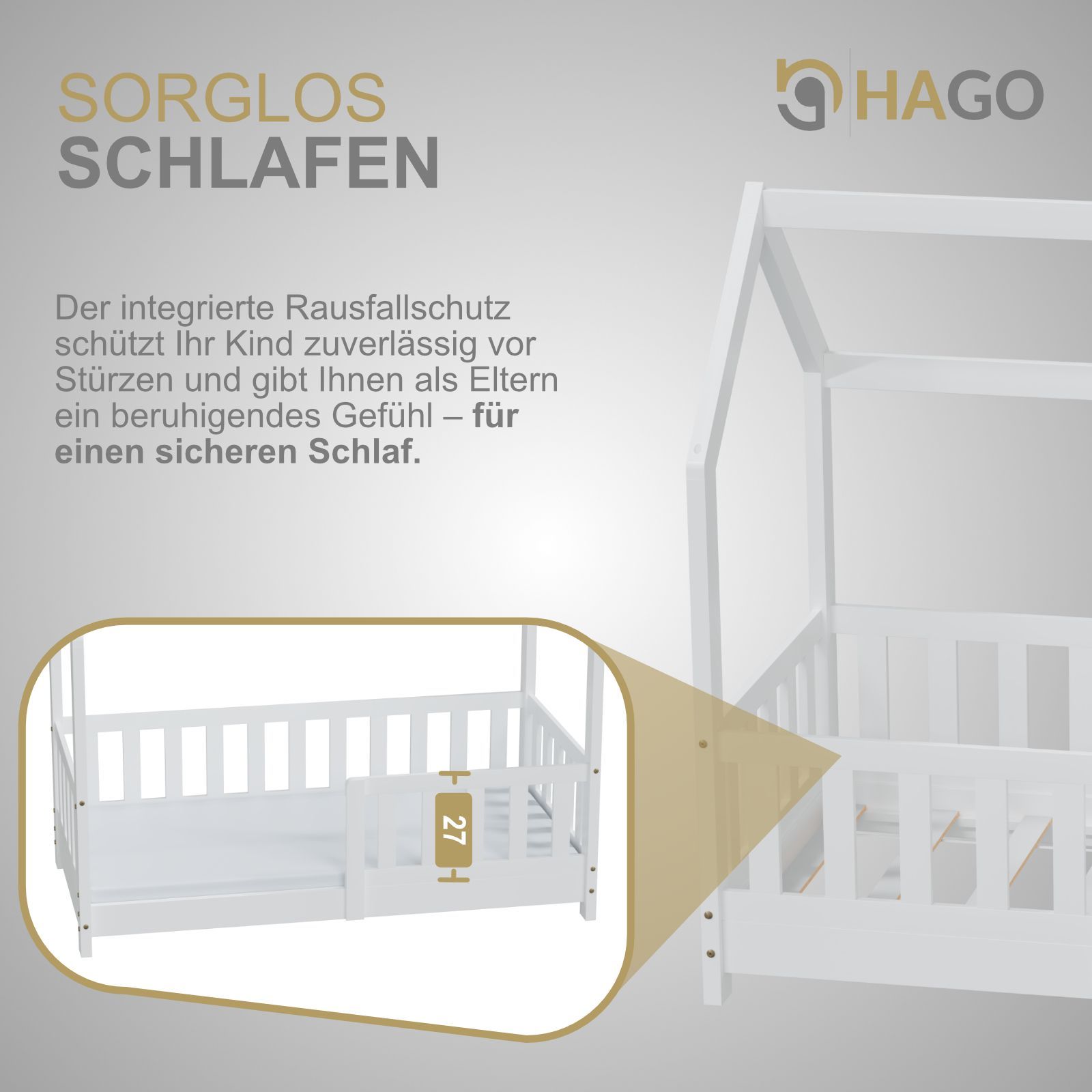 HAGO® Kinderbett 70x140 Weiß Hausbett Dach Kiefer Rausfallschutz Lattenrost Holz