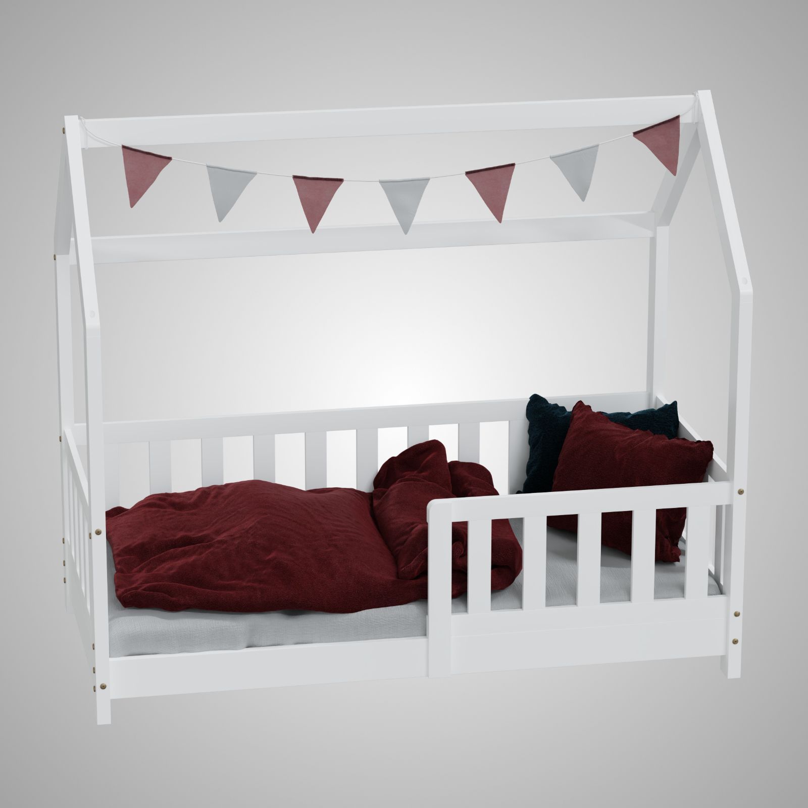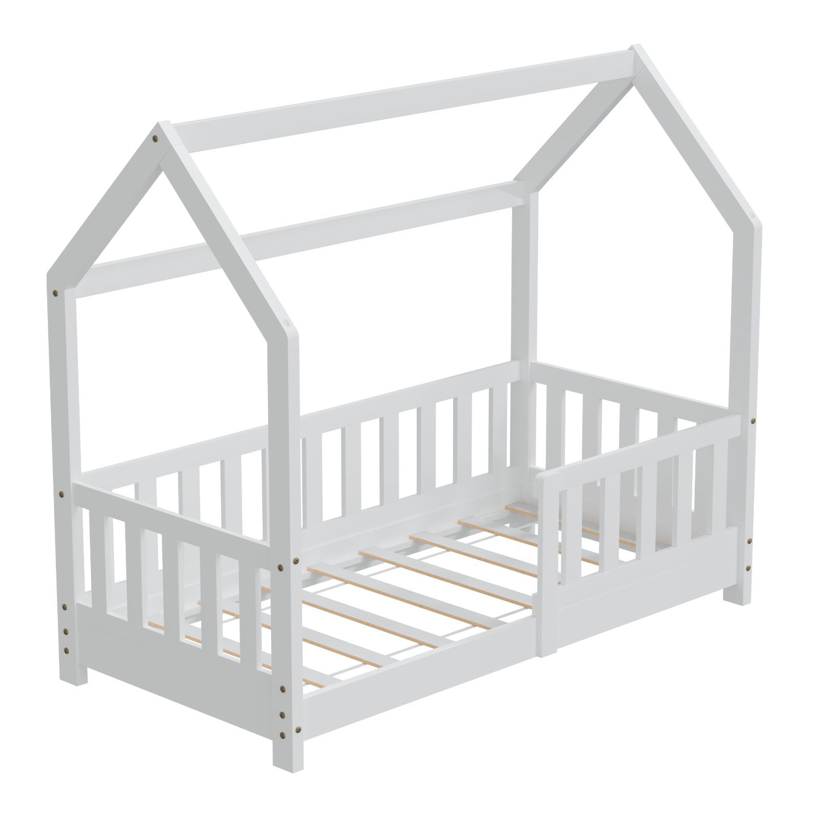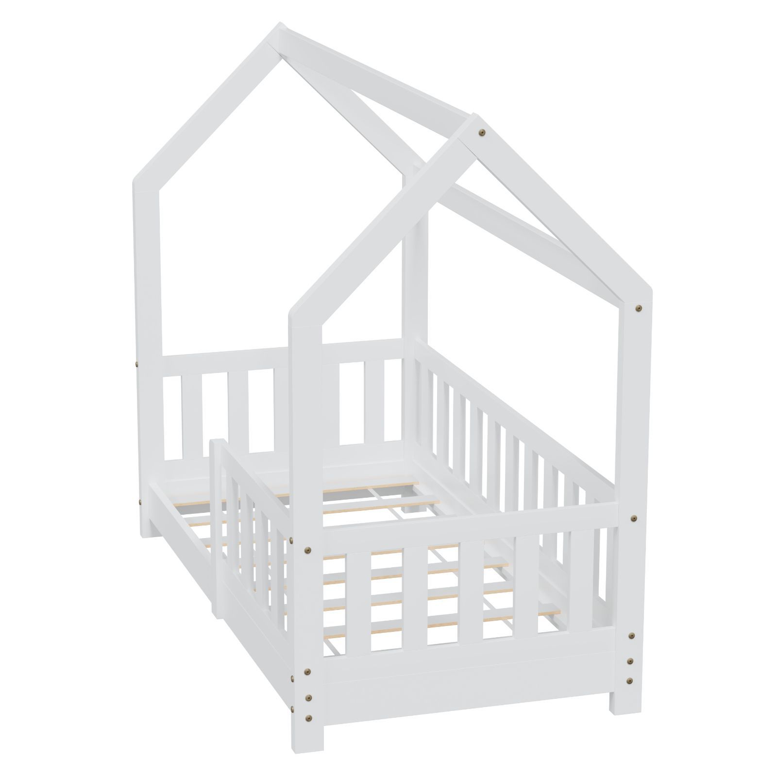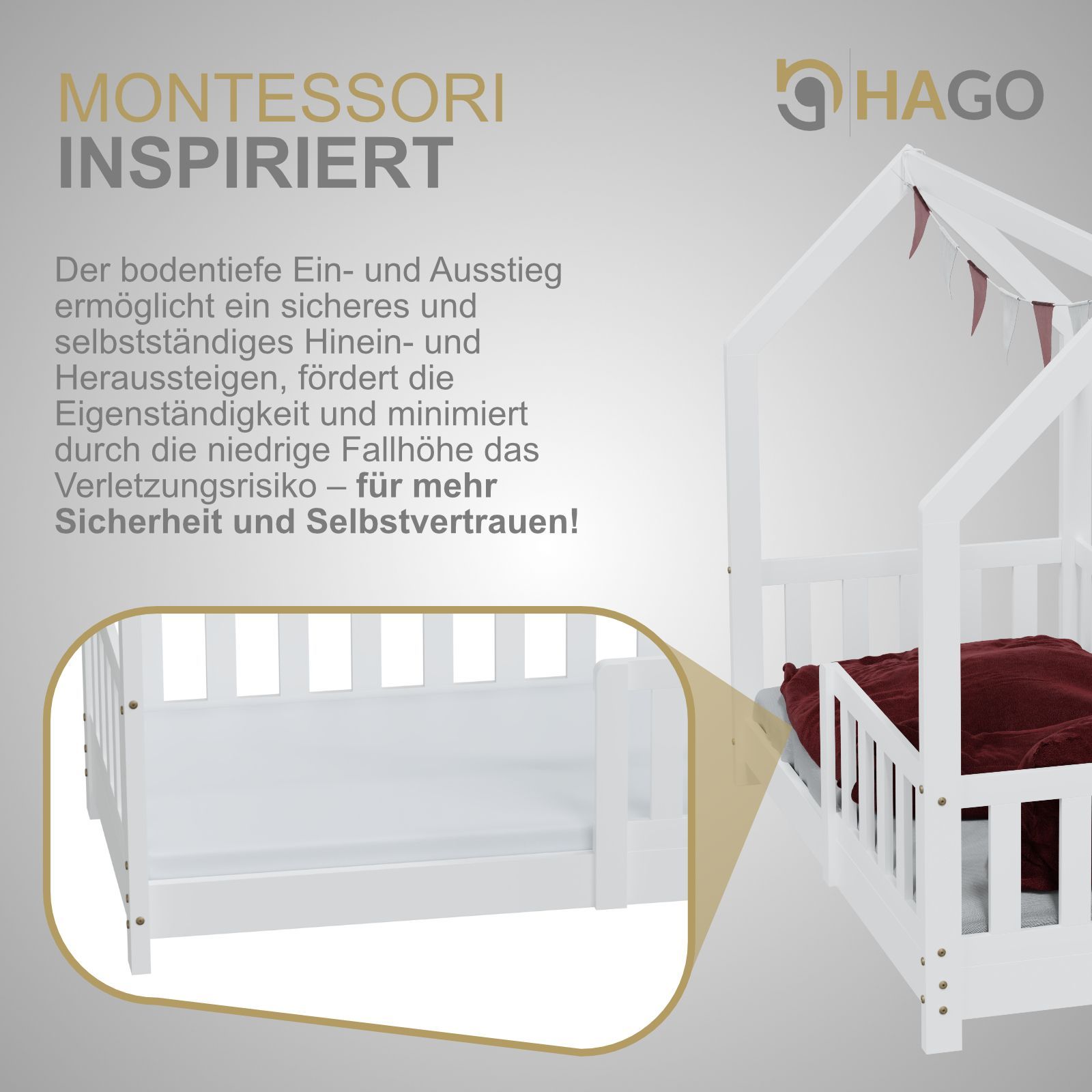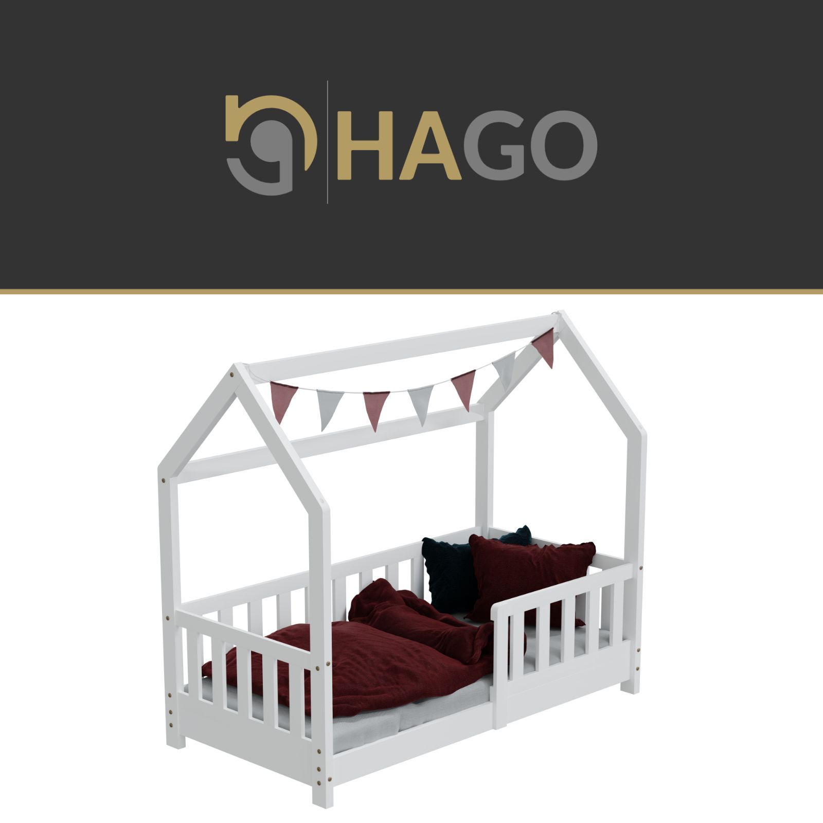 HAGO® Kinderbett 70x140 Weiß Hausbett Dach Kiefer Rausfallschutz Lattenrost Holz
