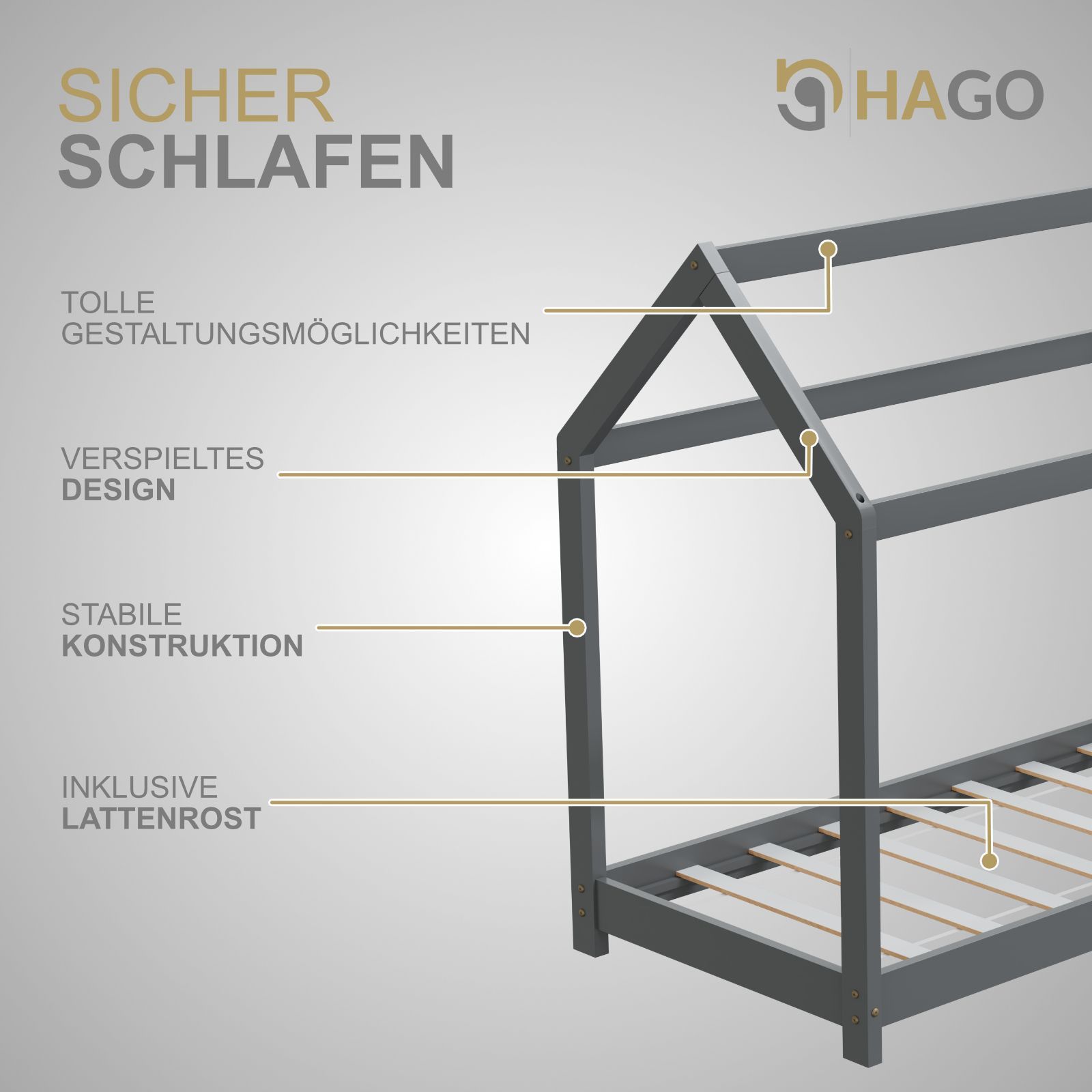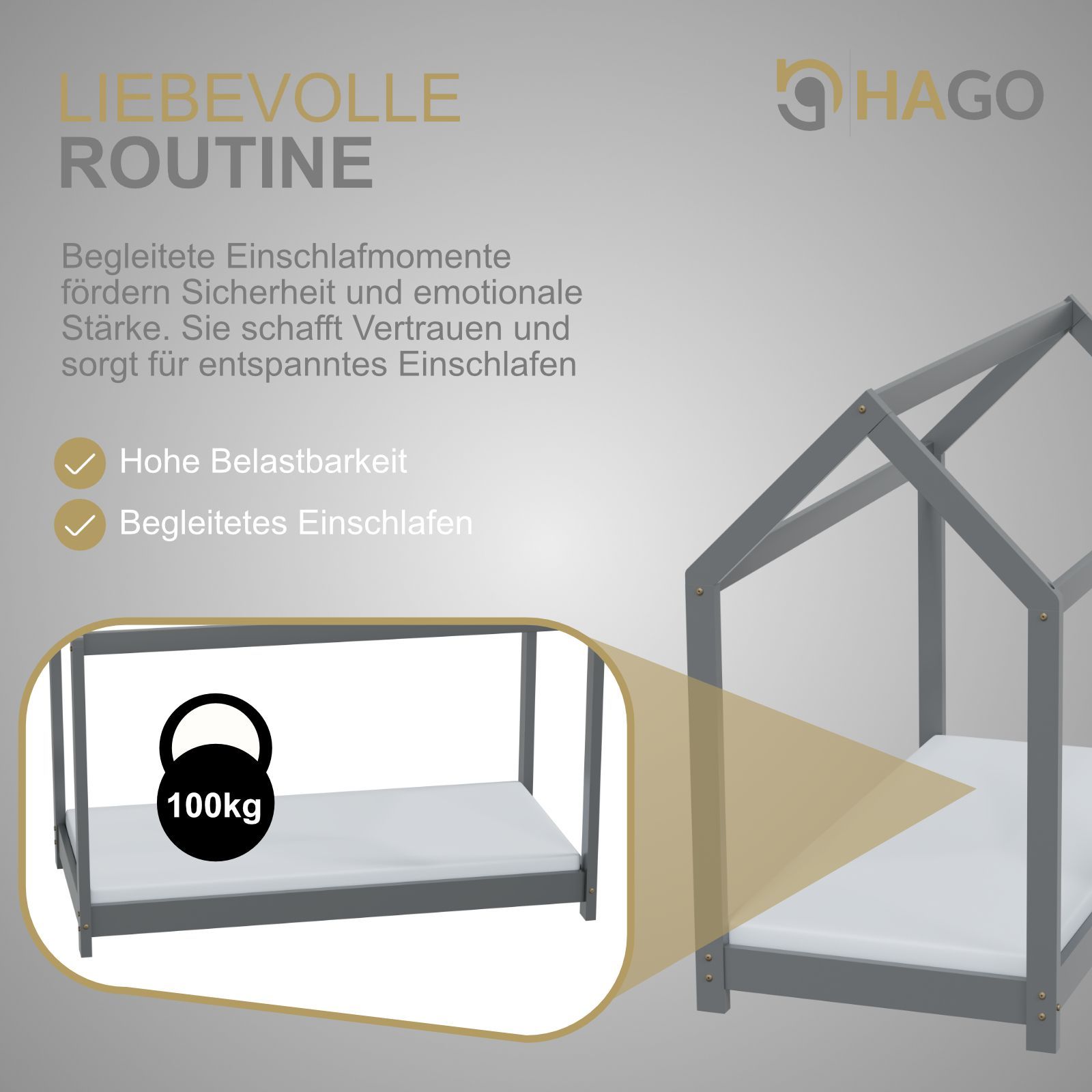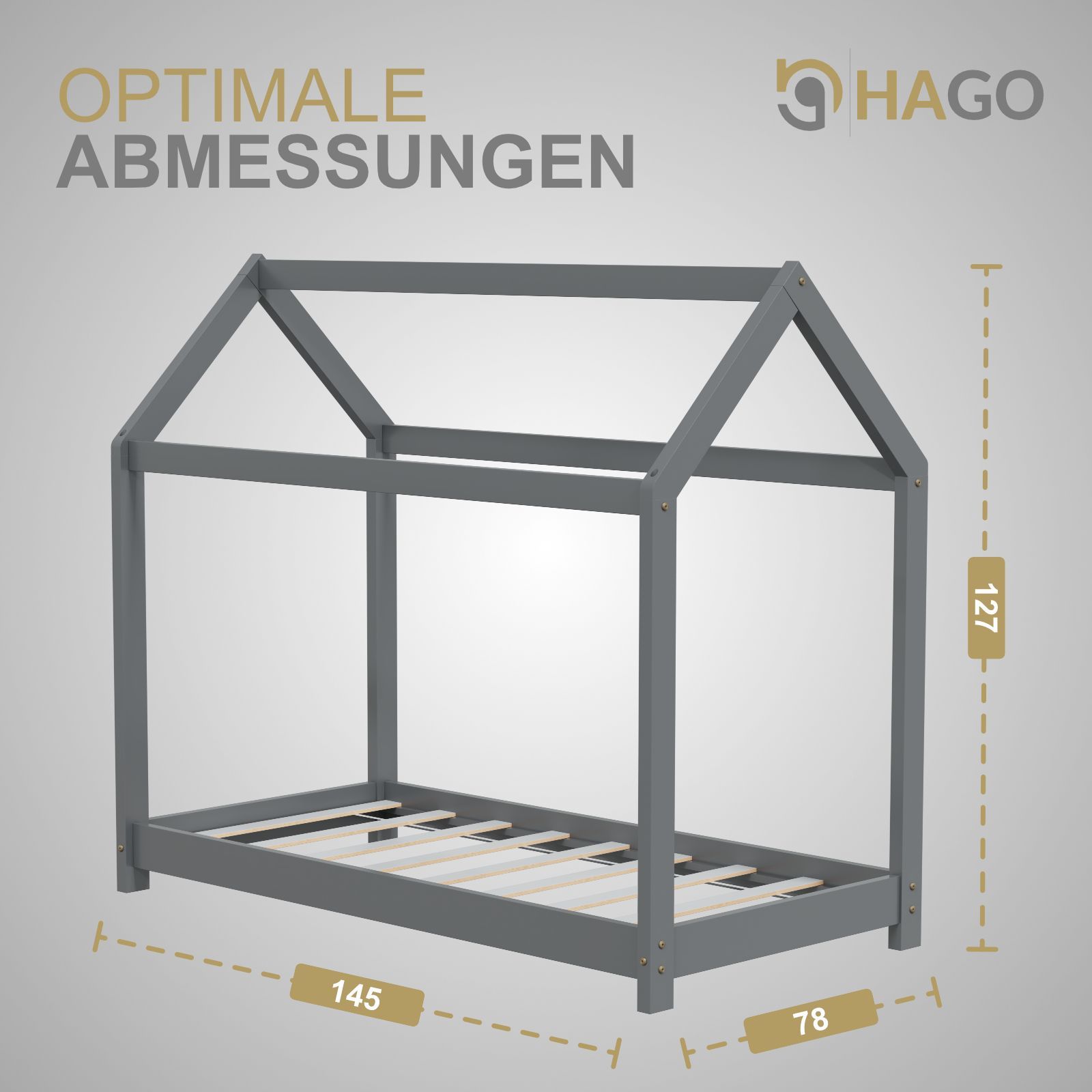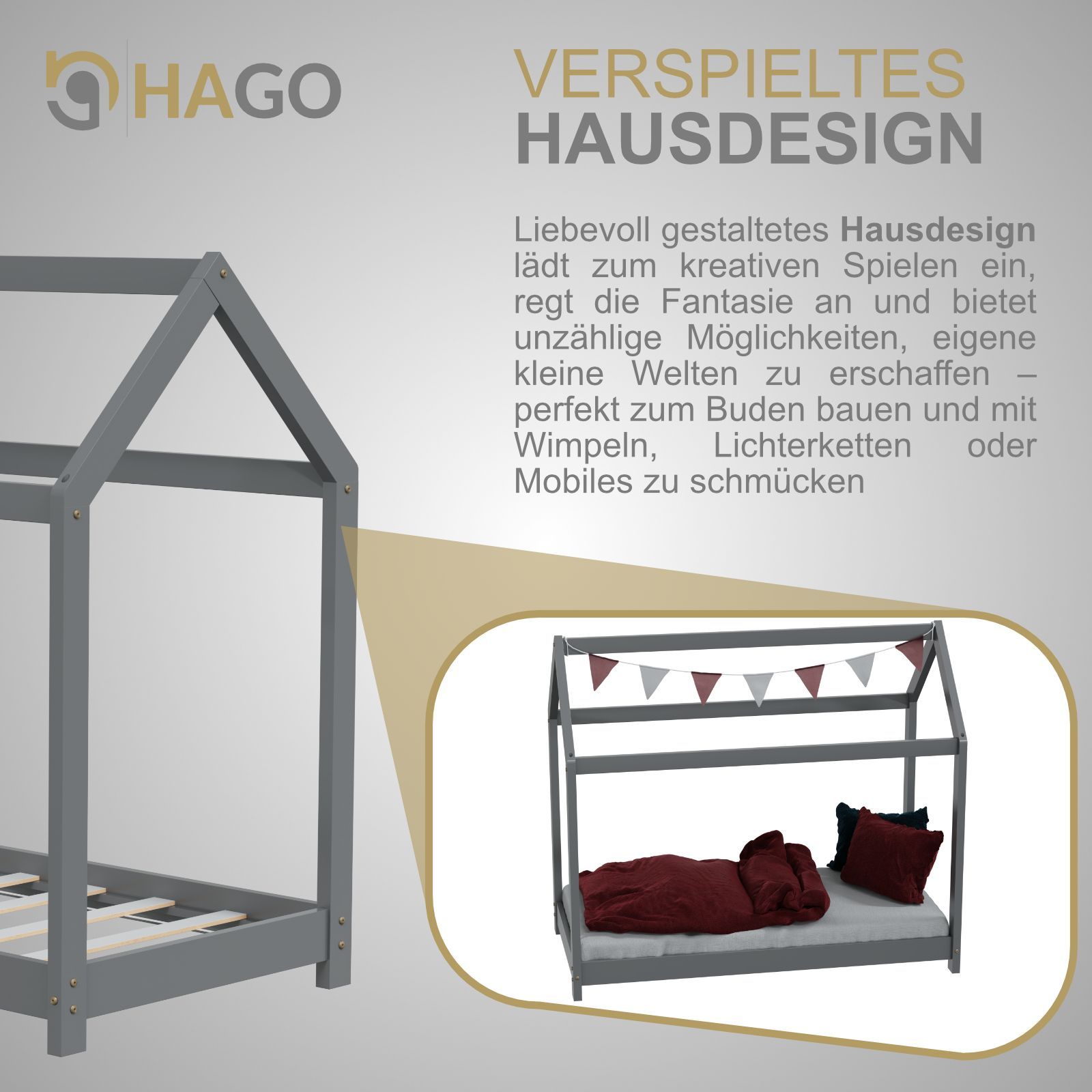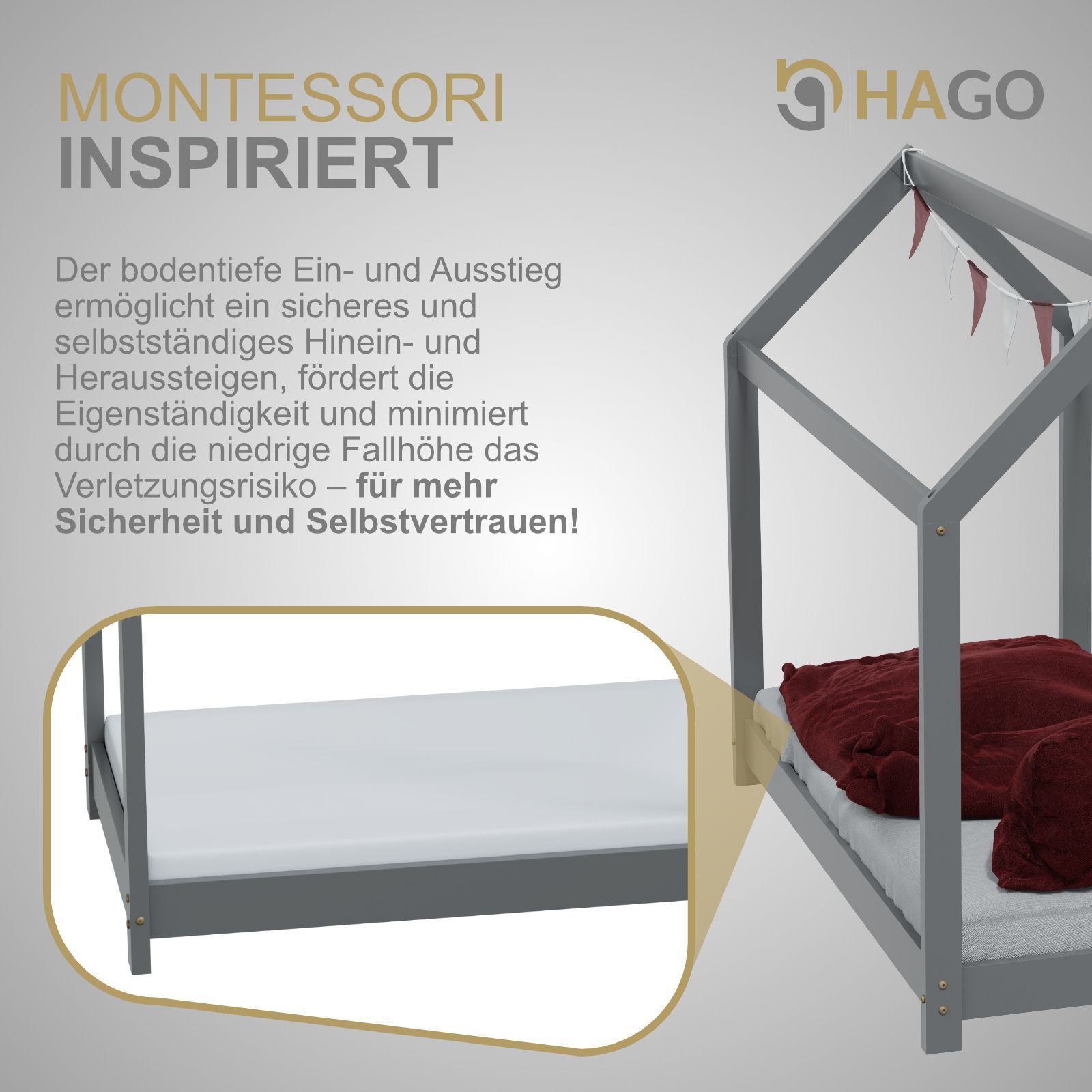 HAGO® Kinderbett 70x140cm Grau Holz Hausoptik Lattenrost Montessori Bodentief
