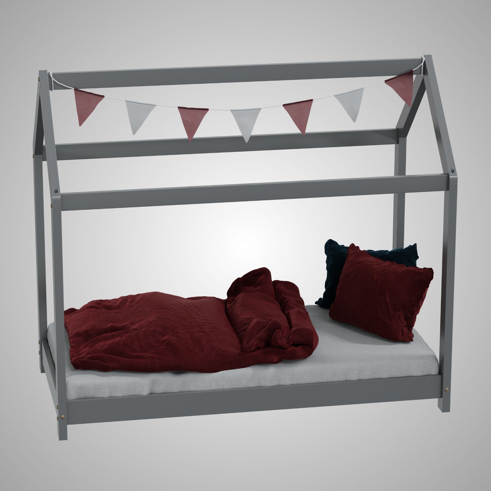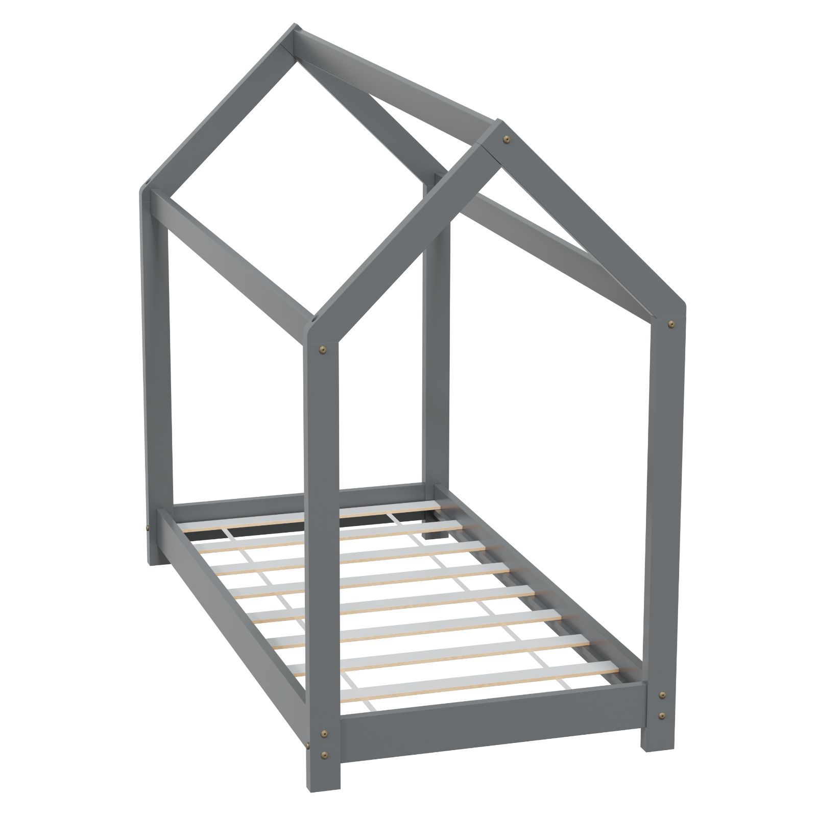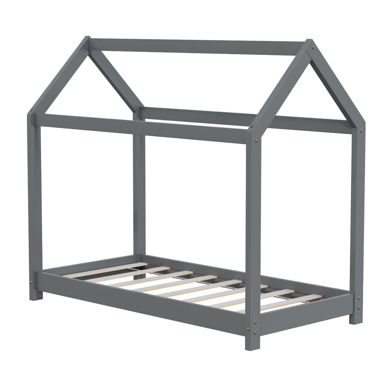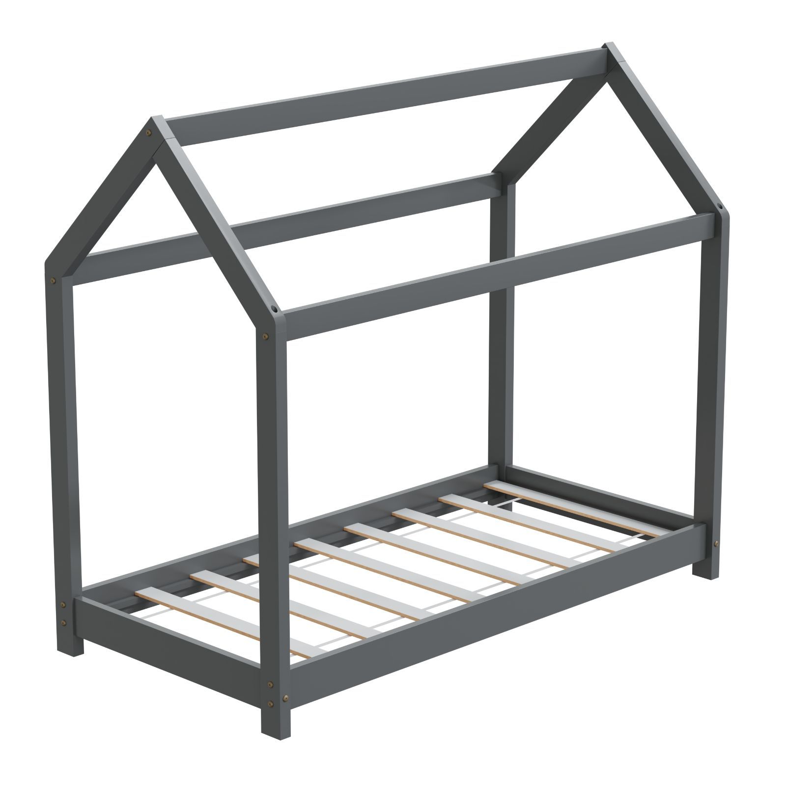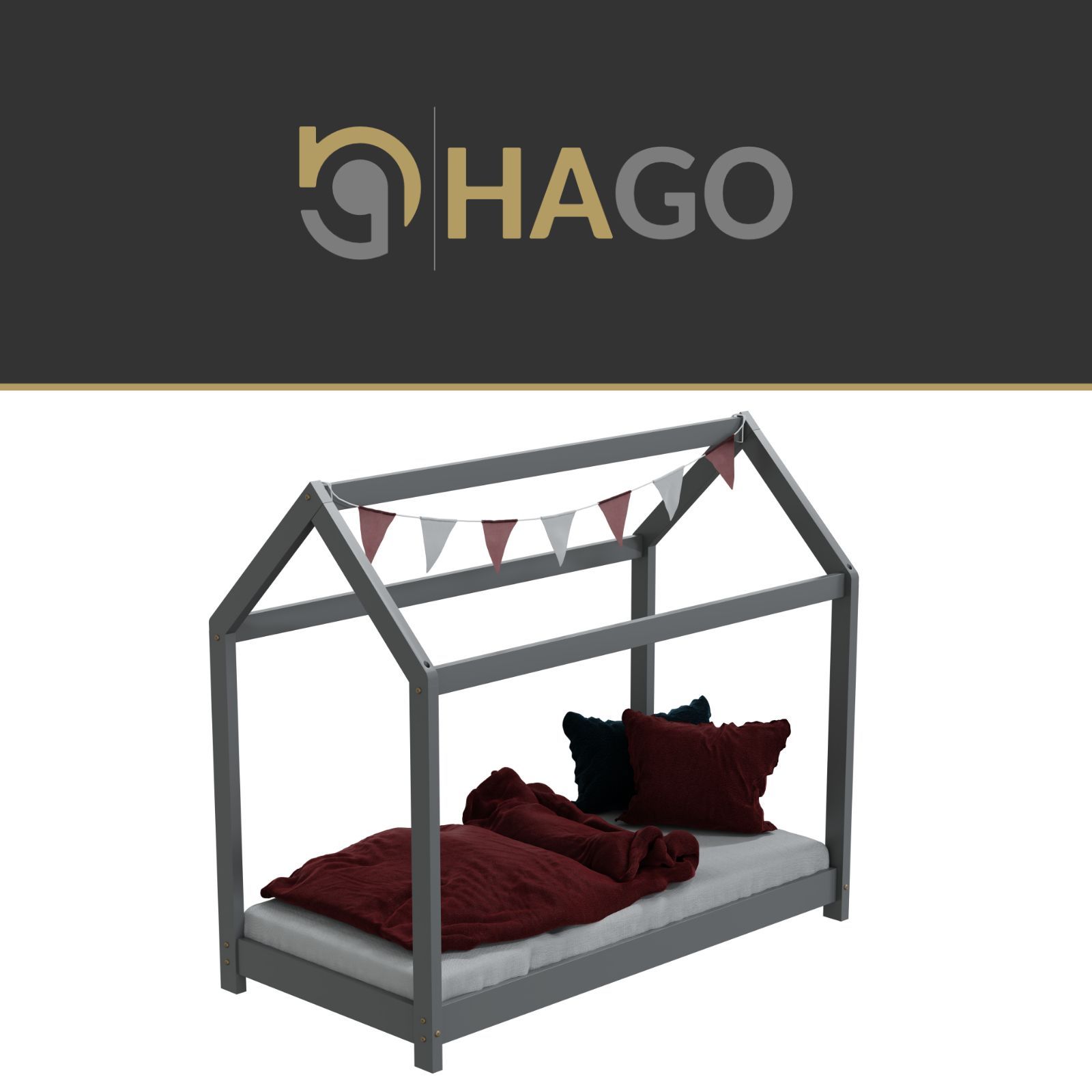HAGO® Kinderbett 70x140cm Grau Holz Hausoptik Lattenrost Montessori Bodentief