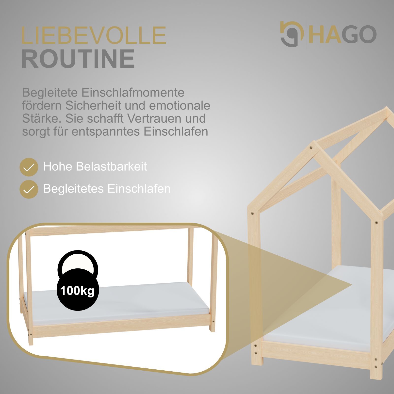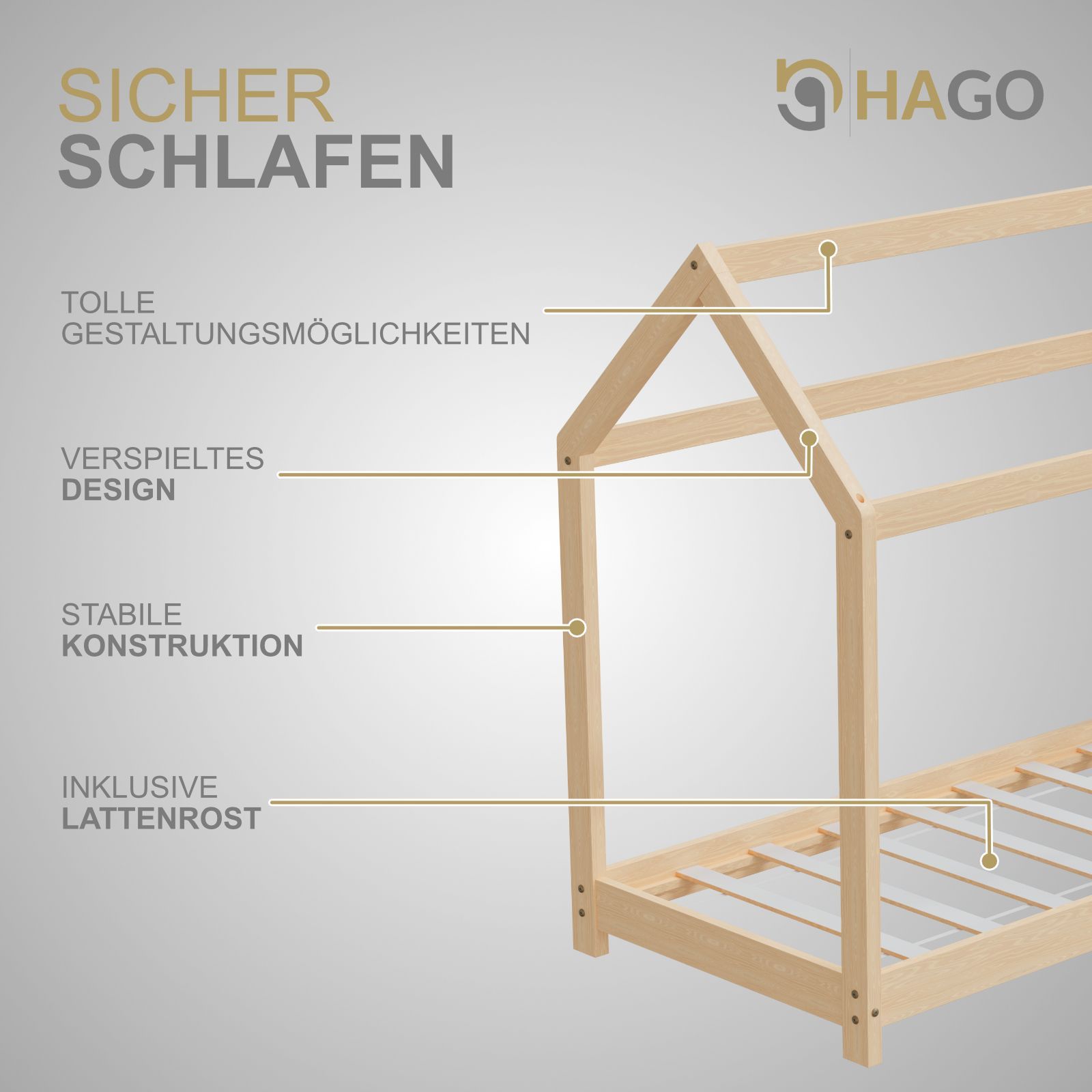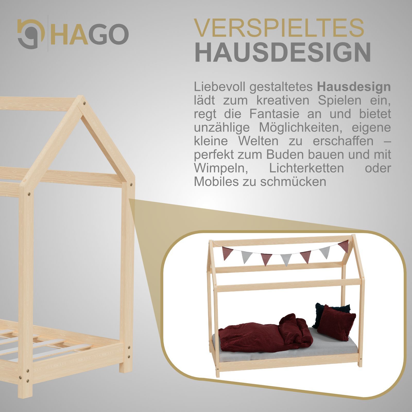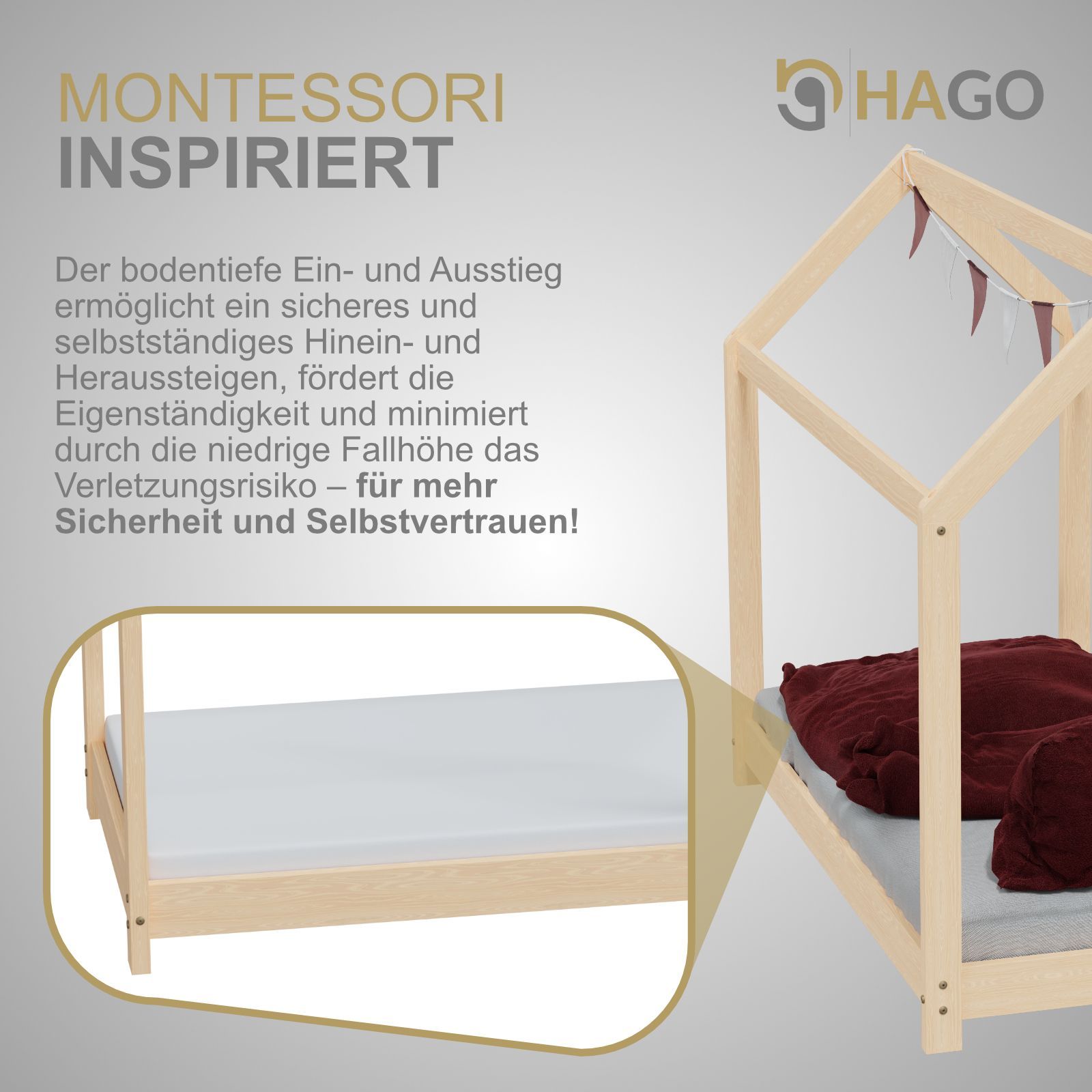 HAGO® Kinderbett 70x140cm Natur Holz Hausoptik Lattenrost Montessori Bodentief