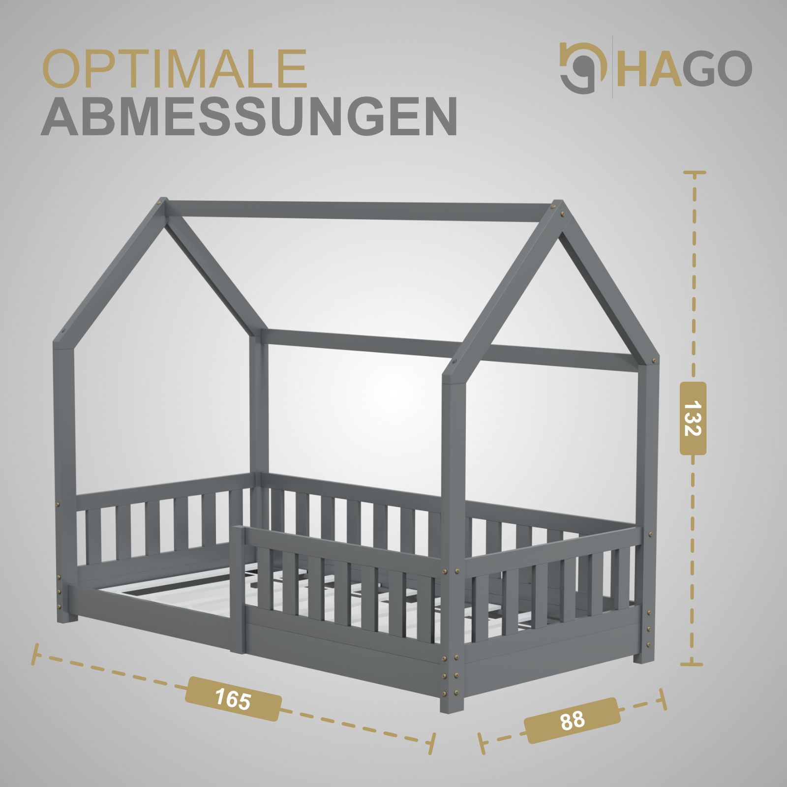 HAGO Kinderbett 80x160 Grau Hausbett Dach Kiefer Rausfallschutz Lattenrost Holz
