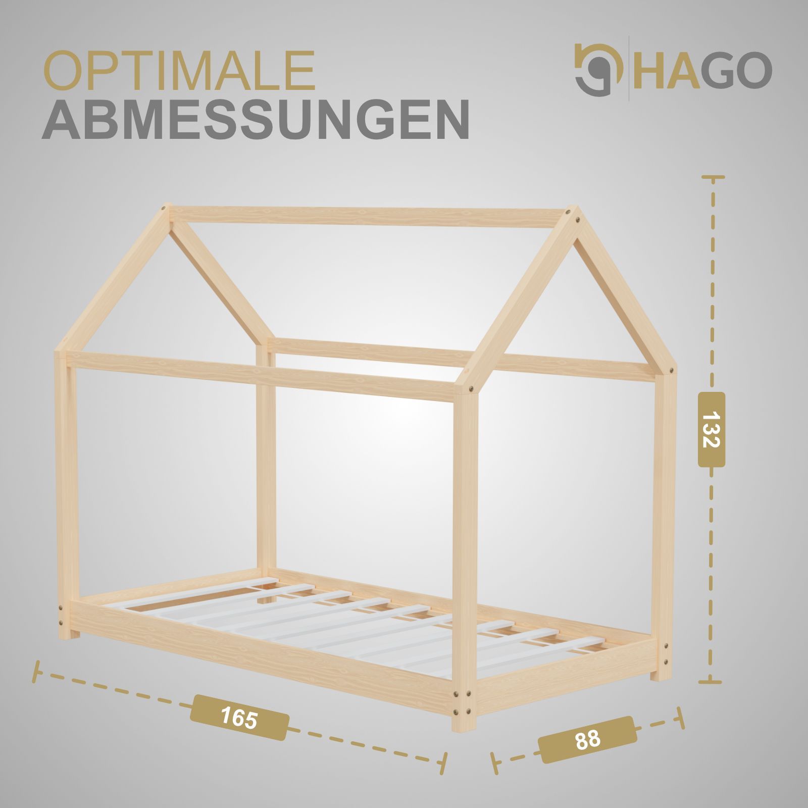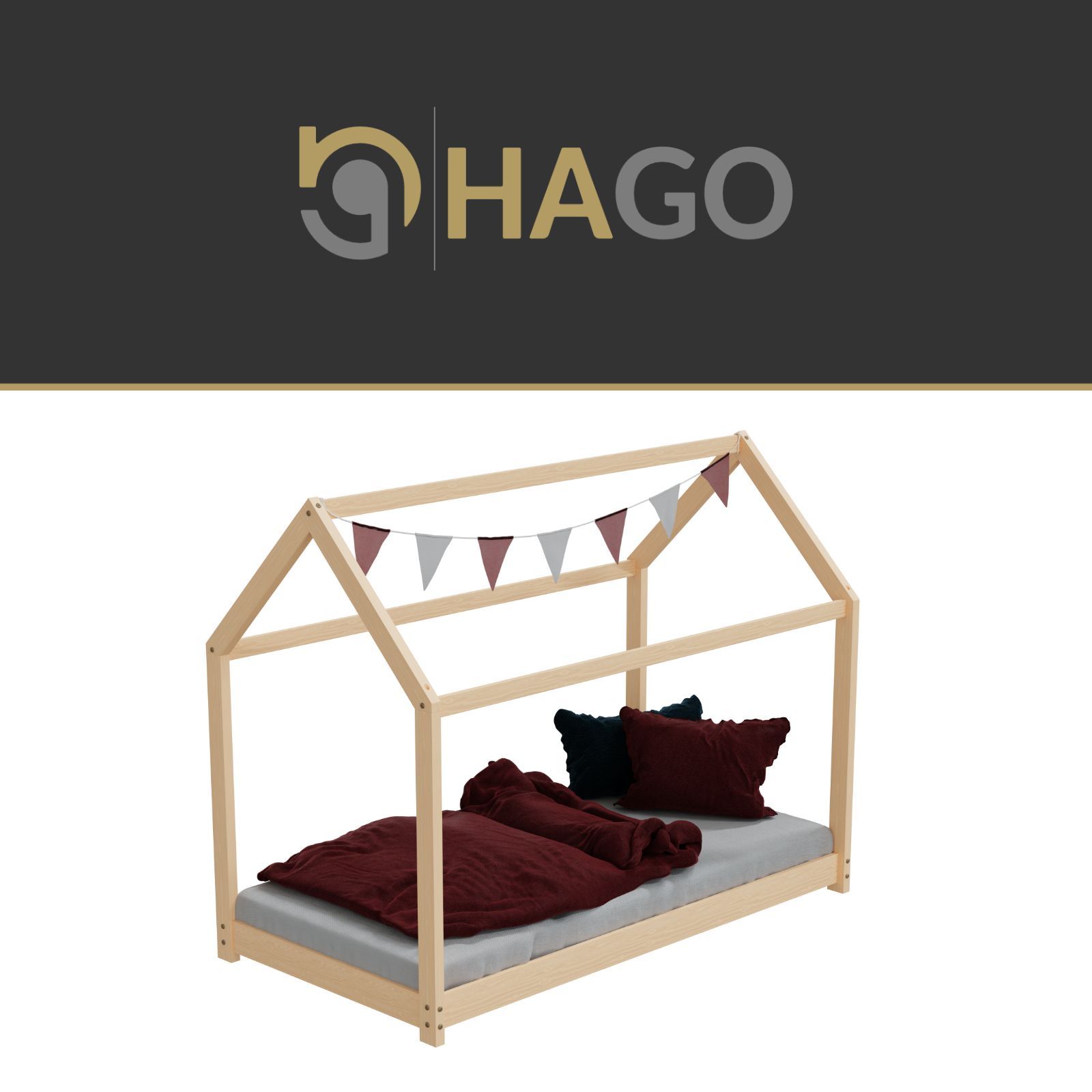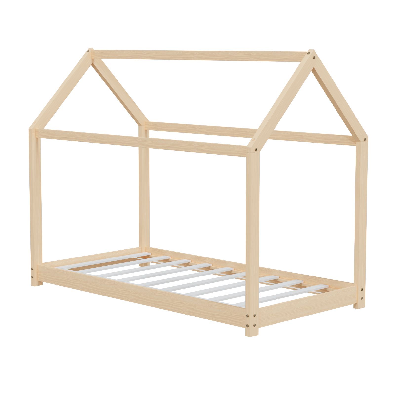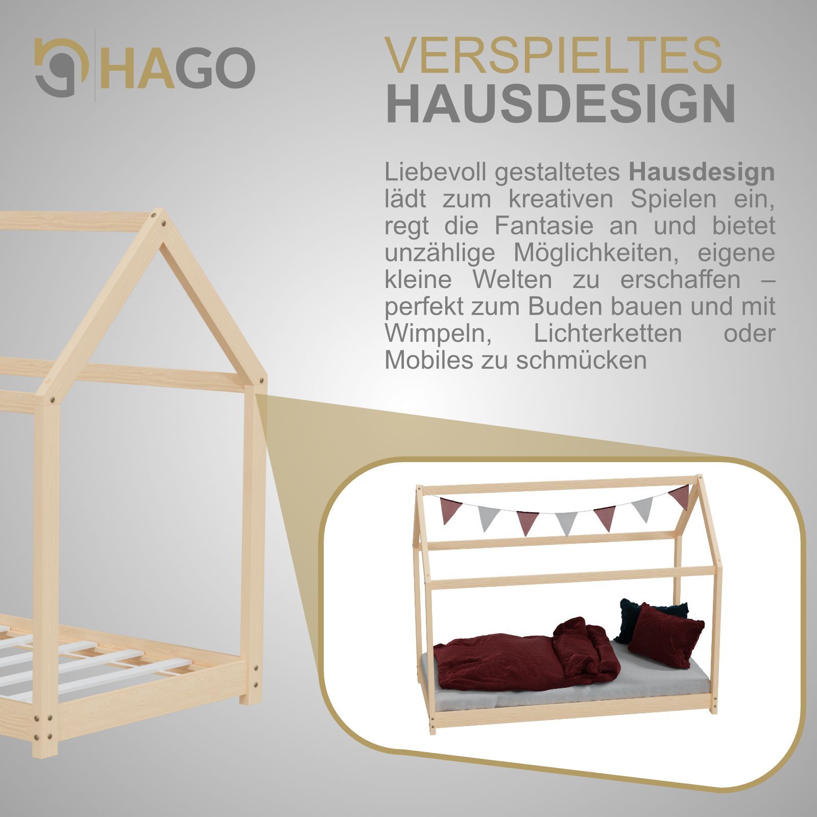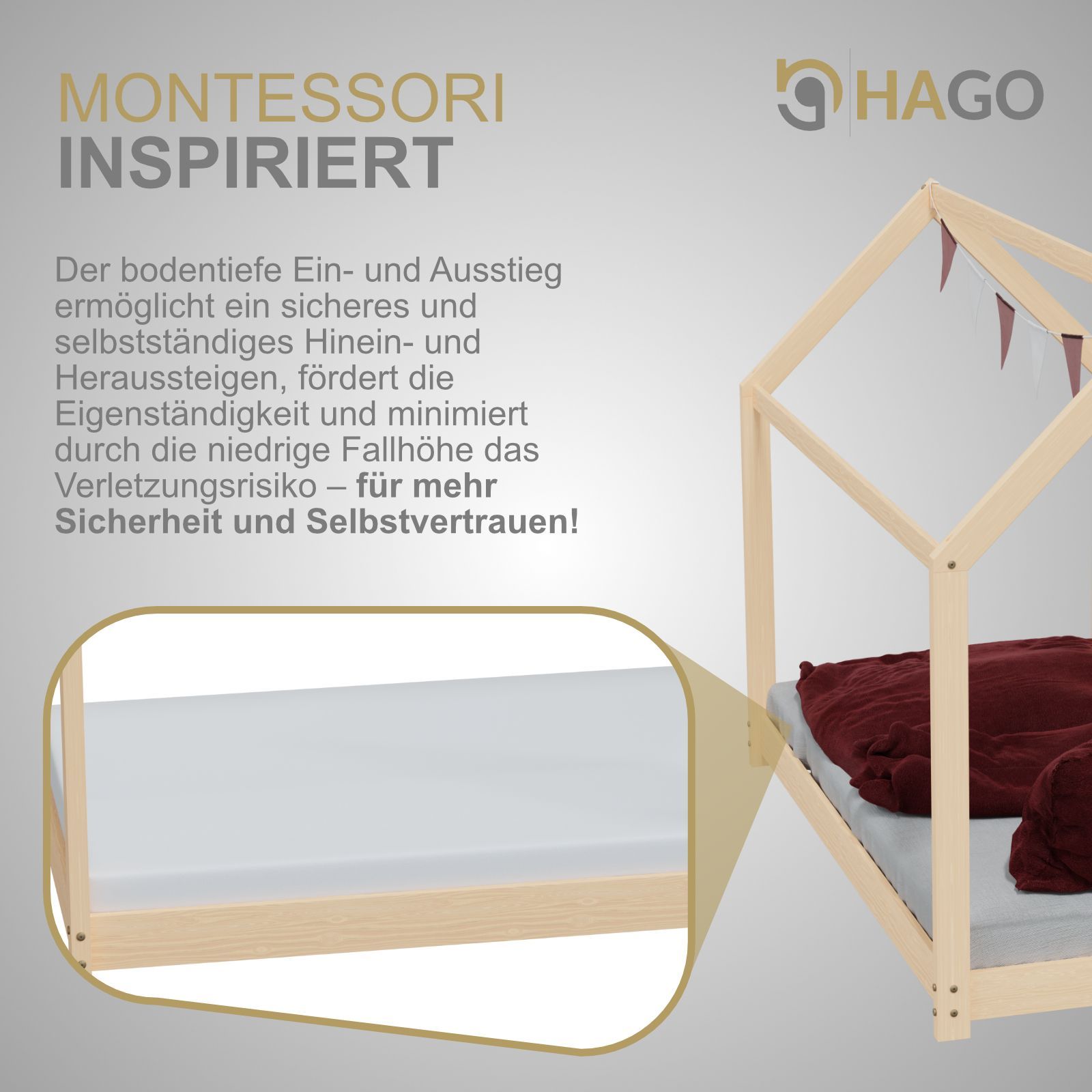 HAGO® Kinderbett 80x160cm Natur Holz Hausoptik Lattenrost Montessori Bodentief
