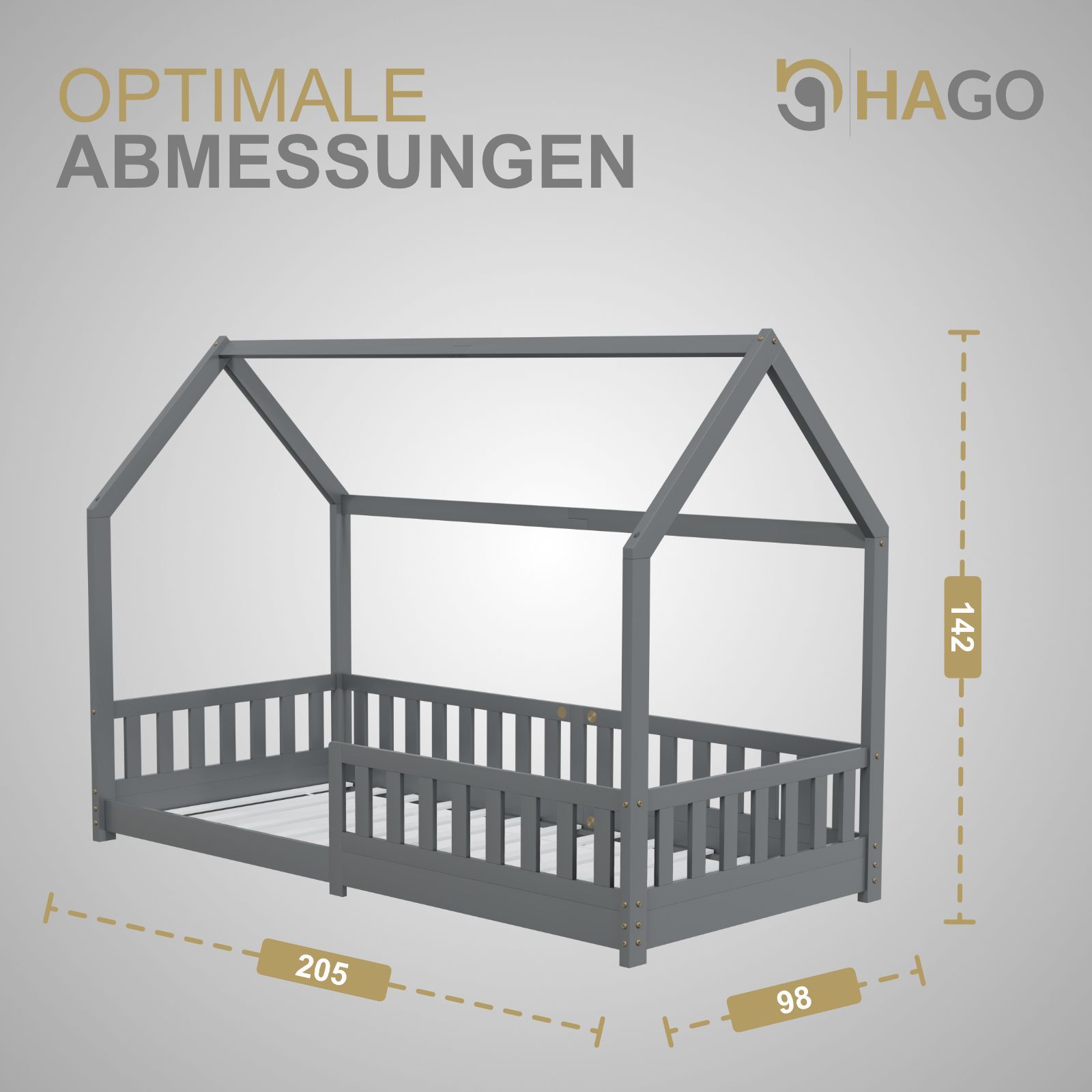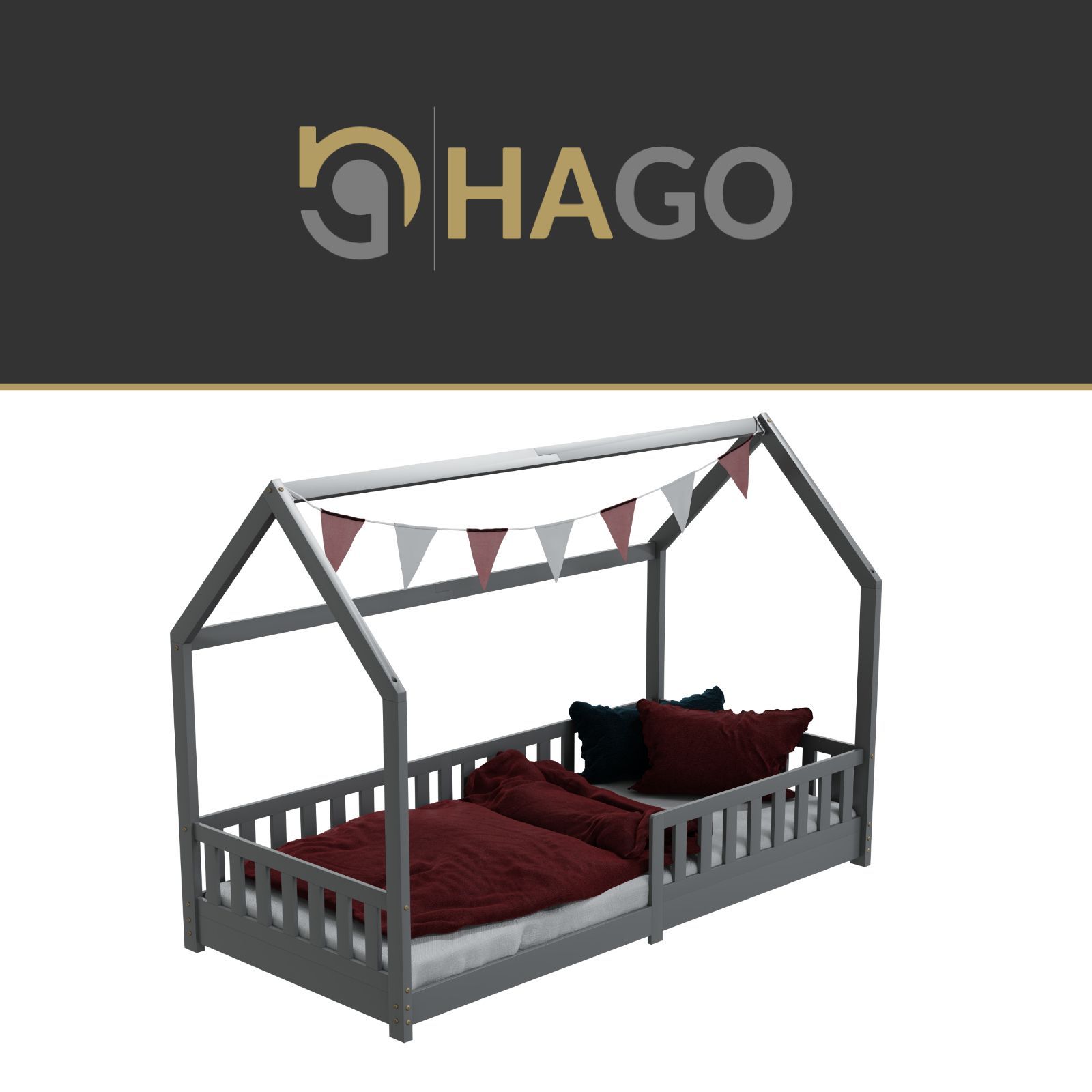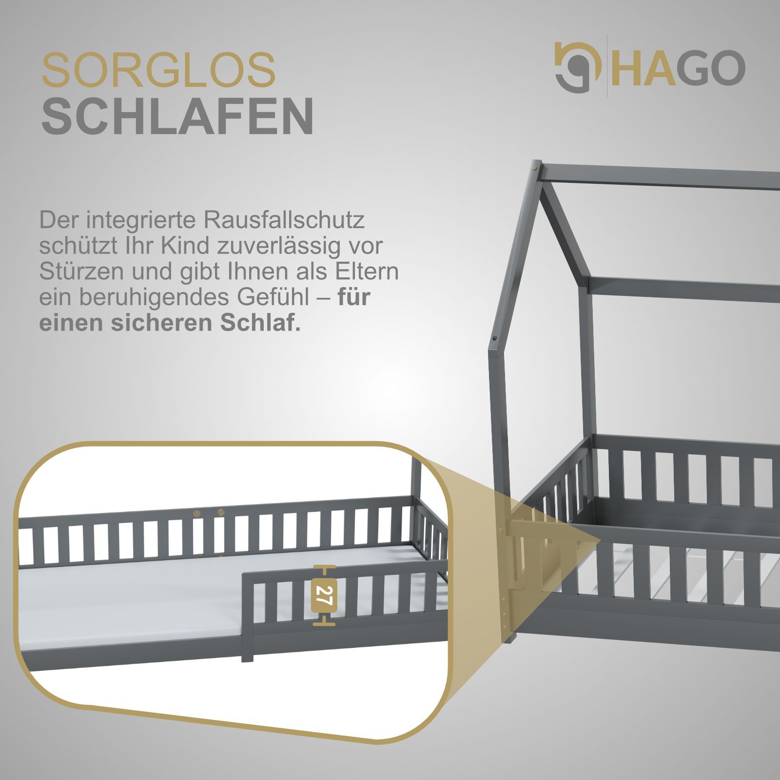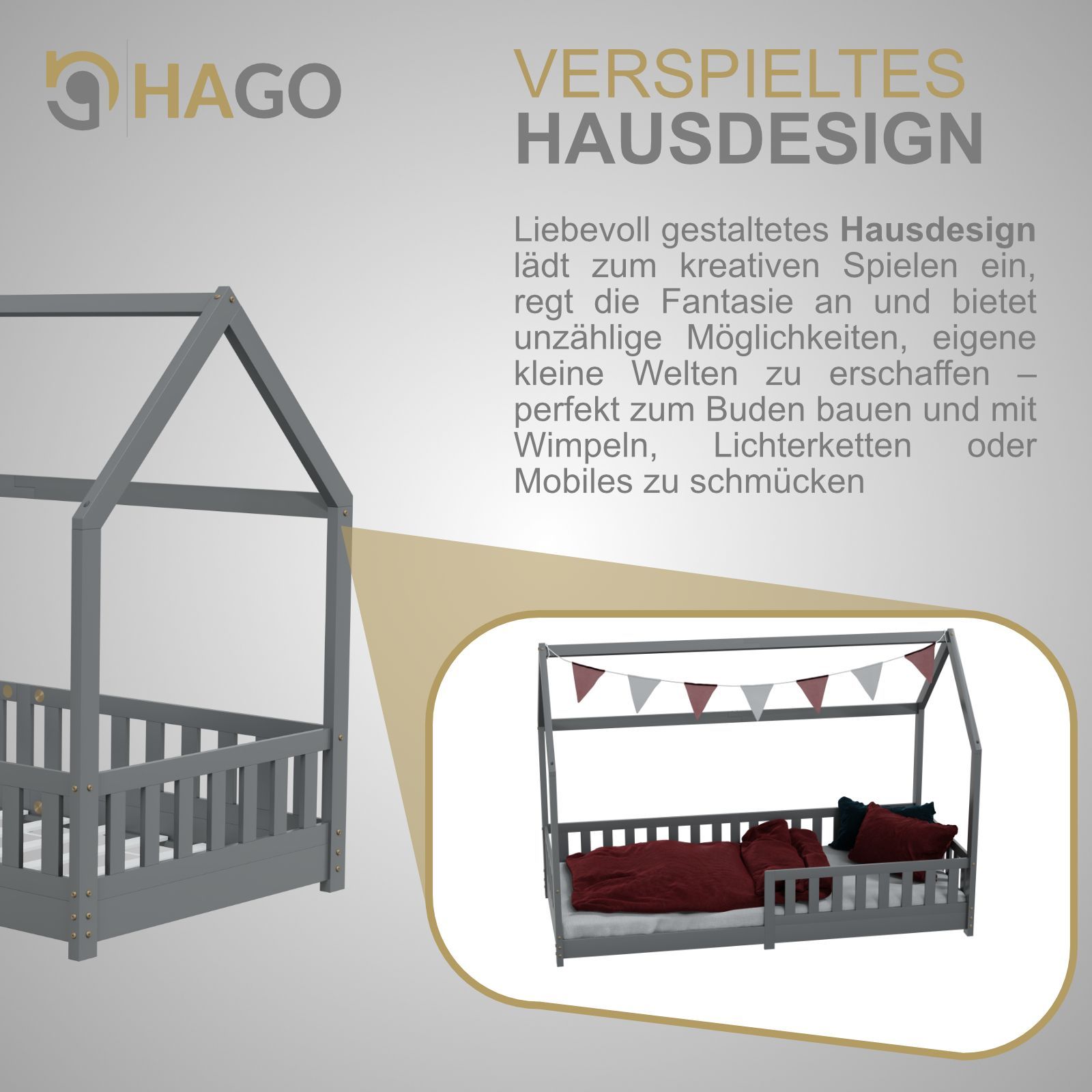 HAGO Kinderbett 90x200 Grau Hausbett Dach Kiefer Rausfallschutz Lattenrost Holz