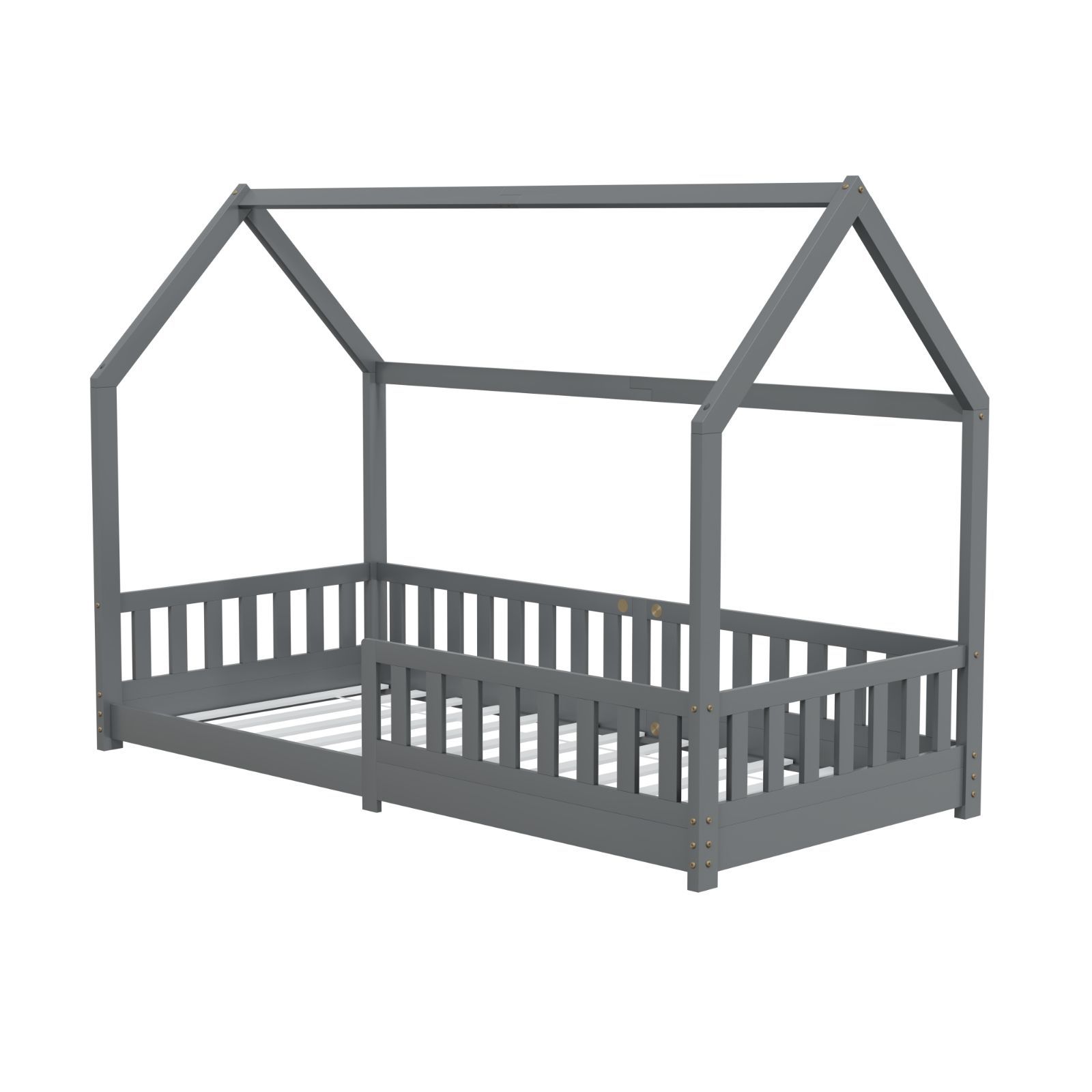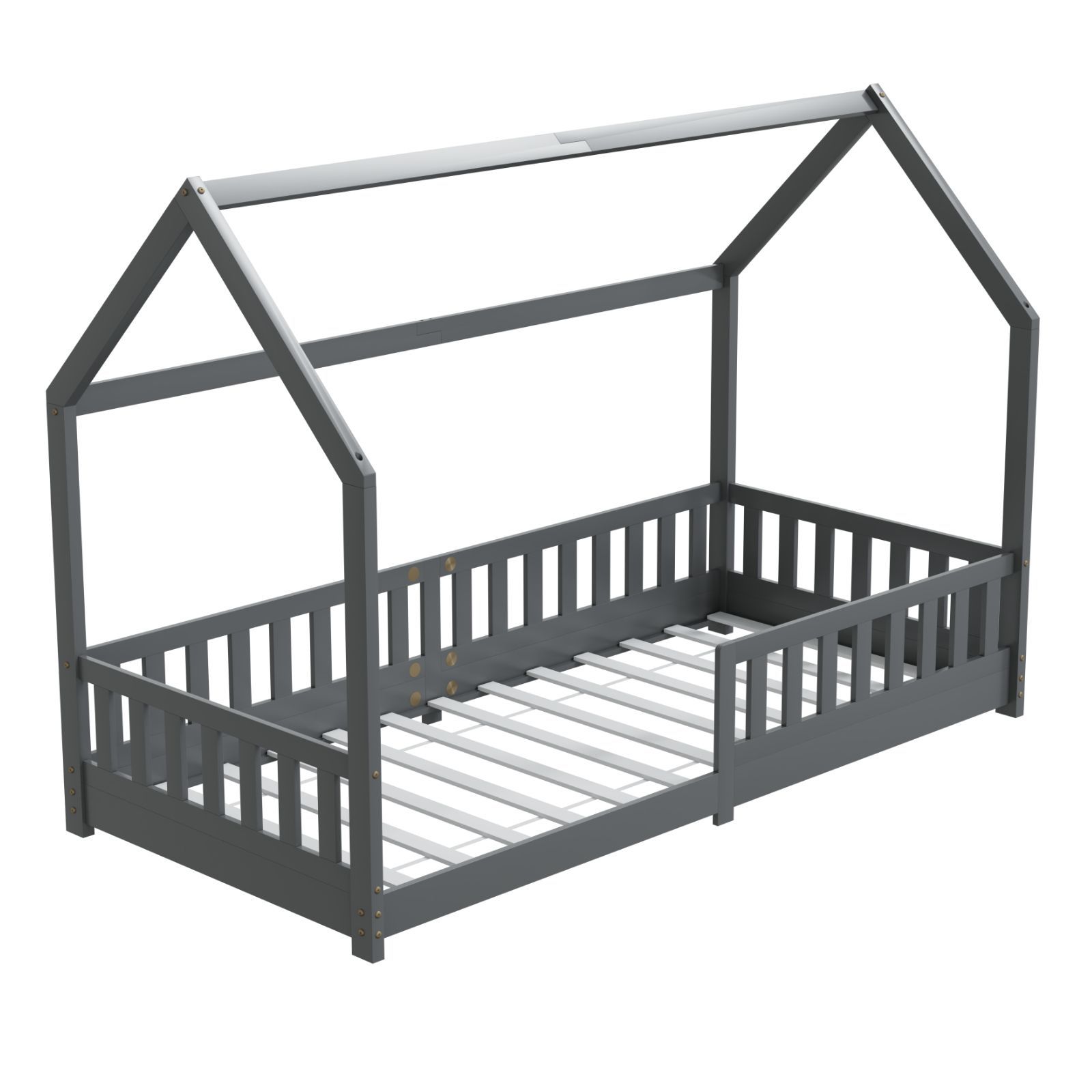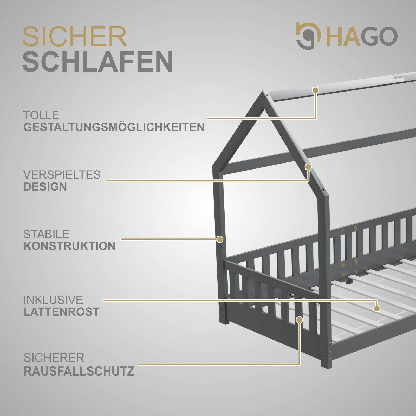 HAGO Kinderbett 90x200 Grau Hausbett Dach Kiefer Rausfallschutz Lattenrost Holz