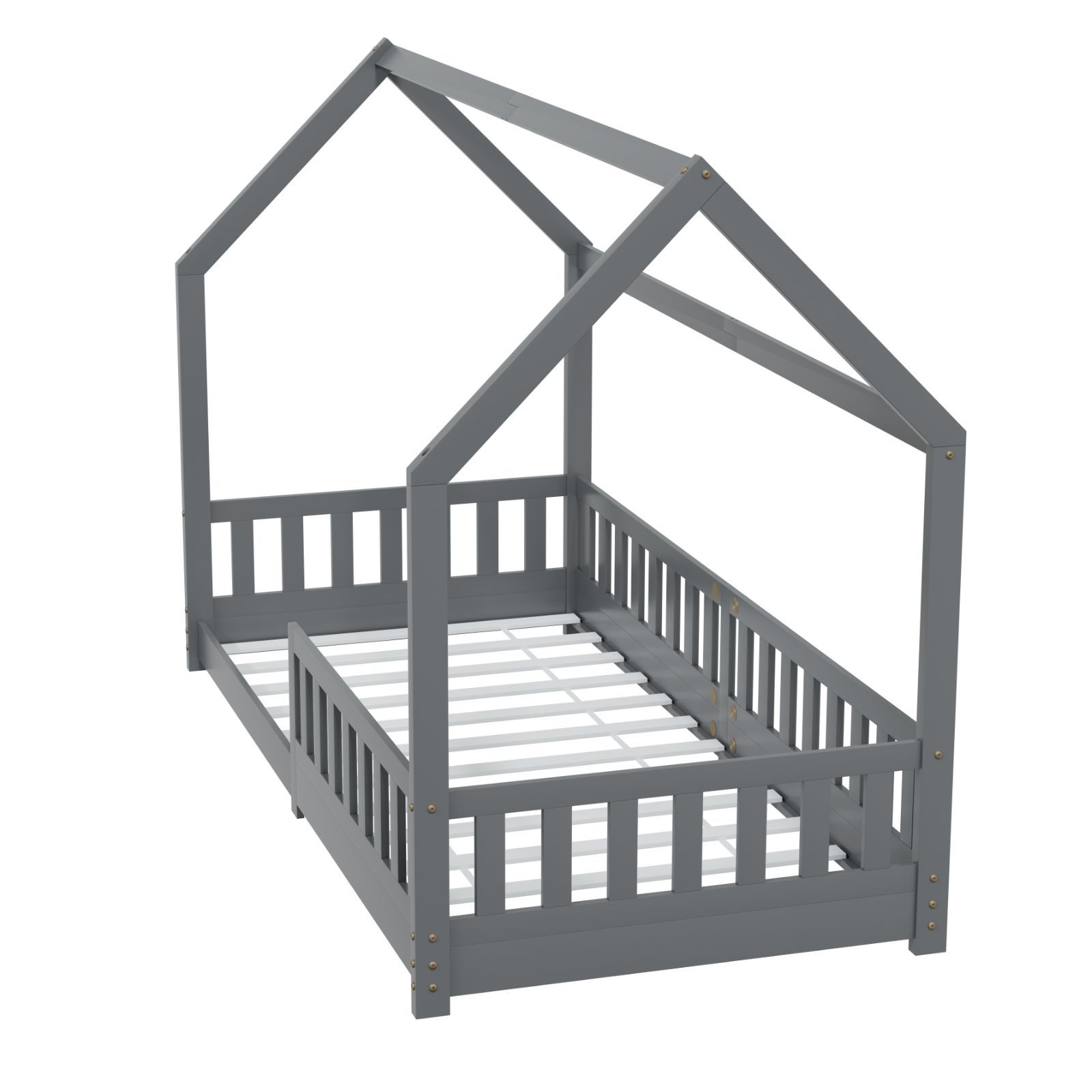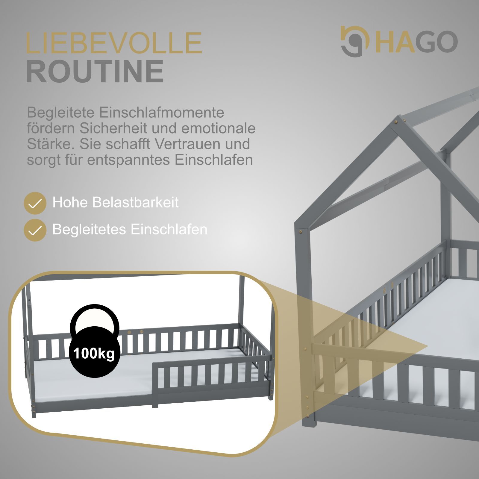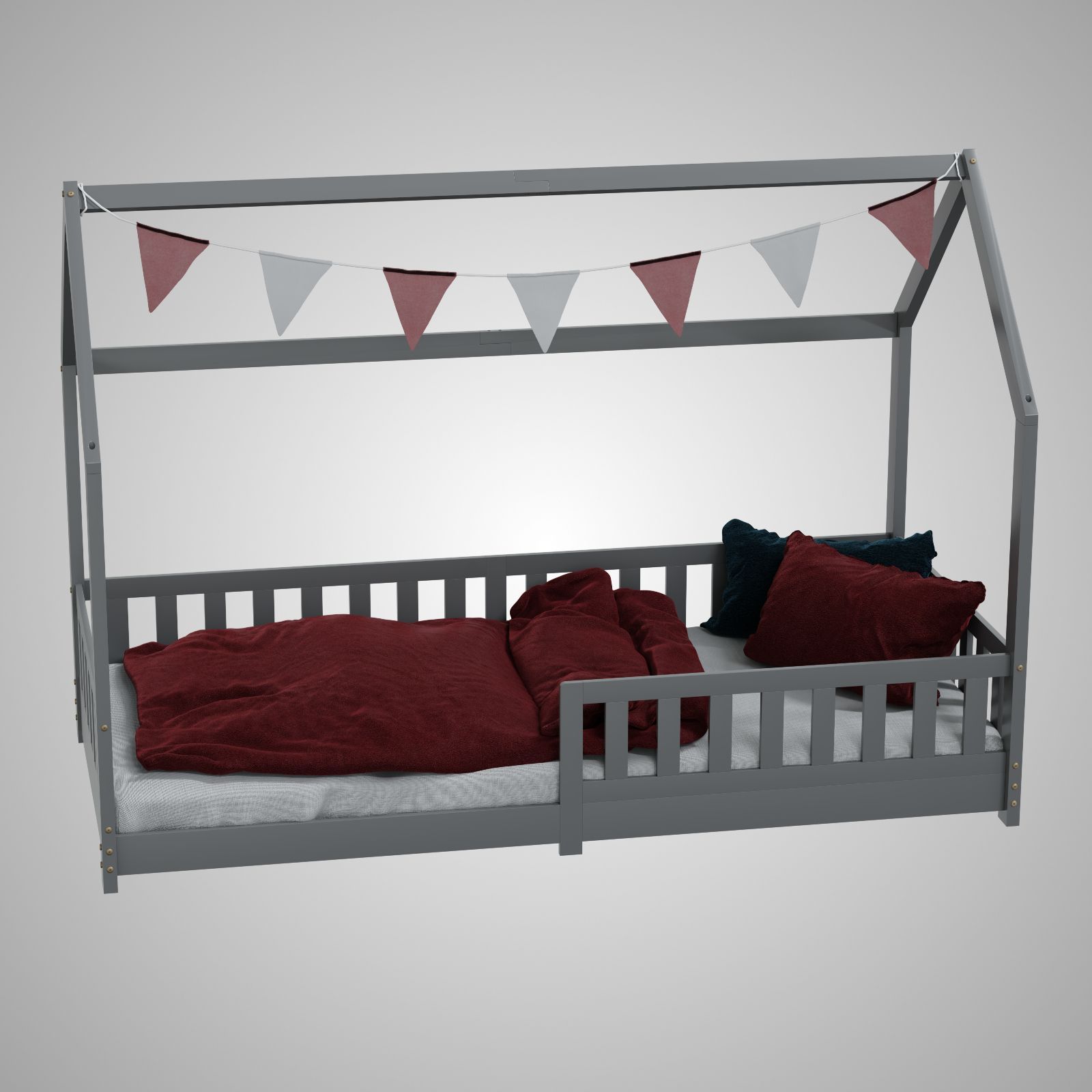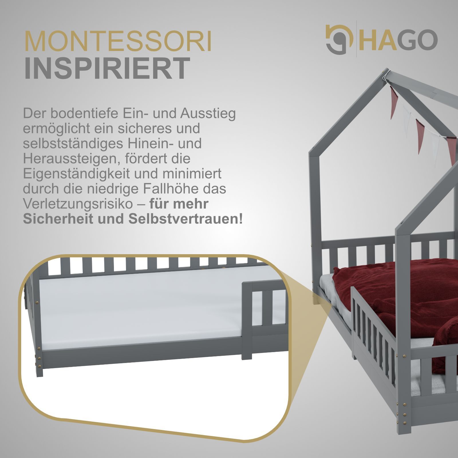 HAGO Kinderbett 90x200 Grau Hausbett Dach Kiefer Rausfallschutz Lattenrost Holz