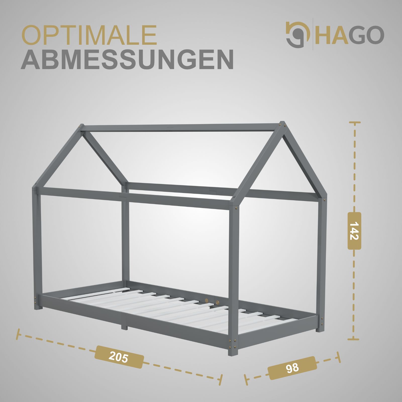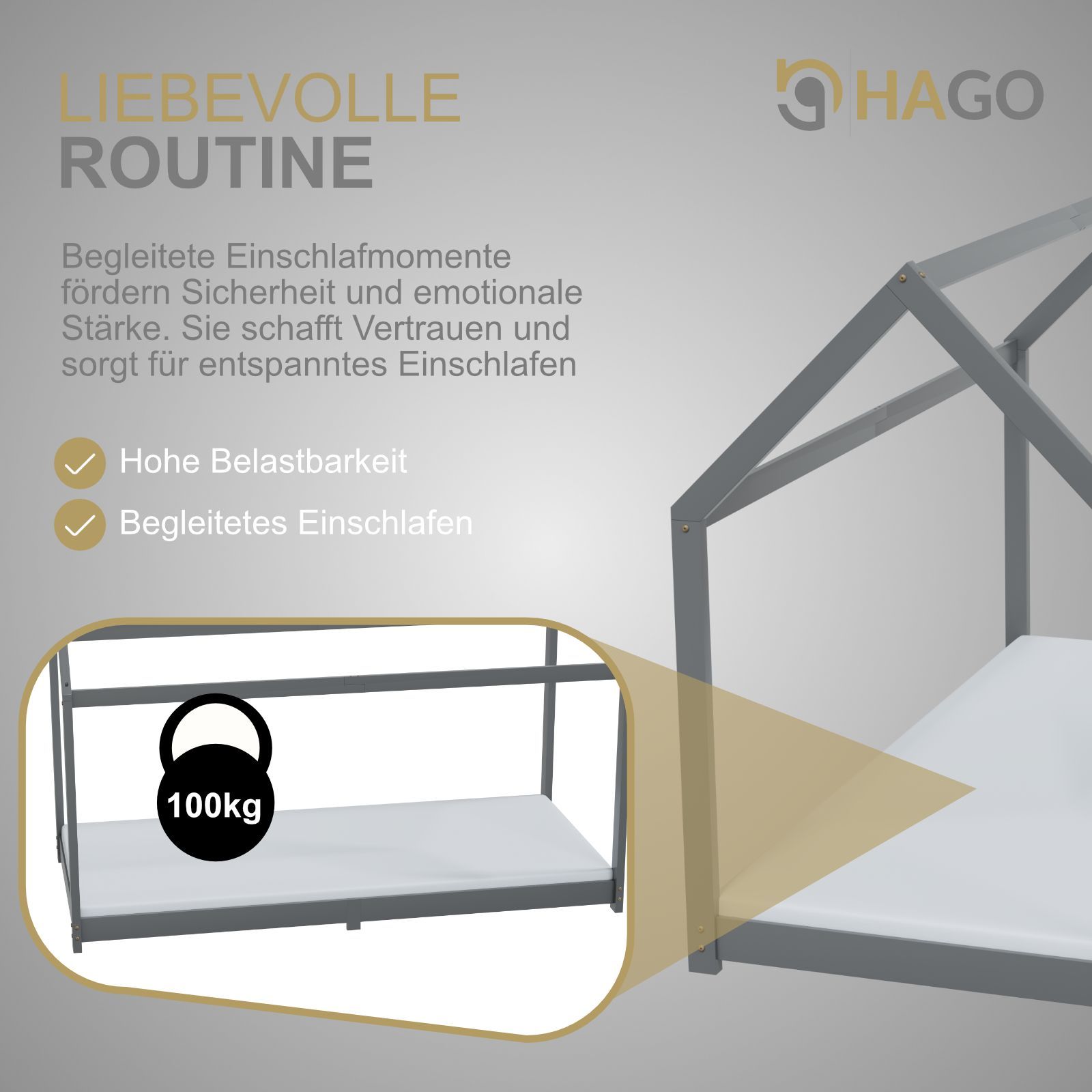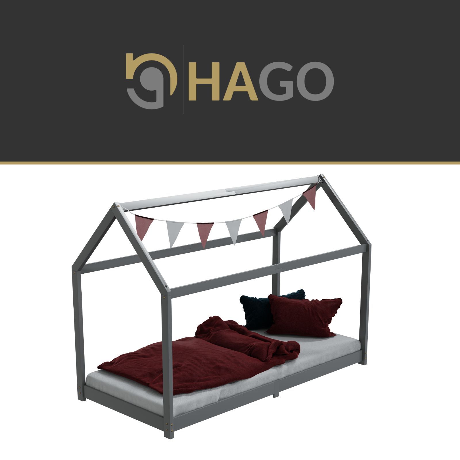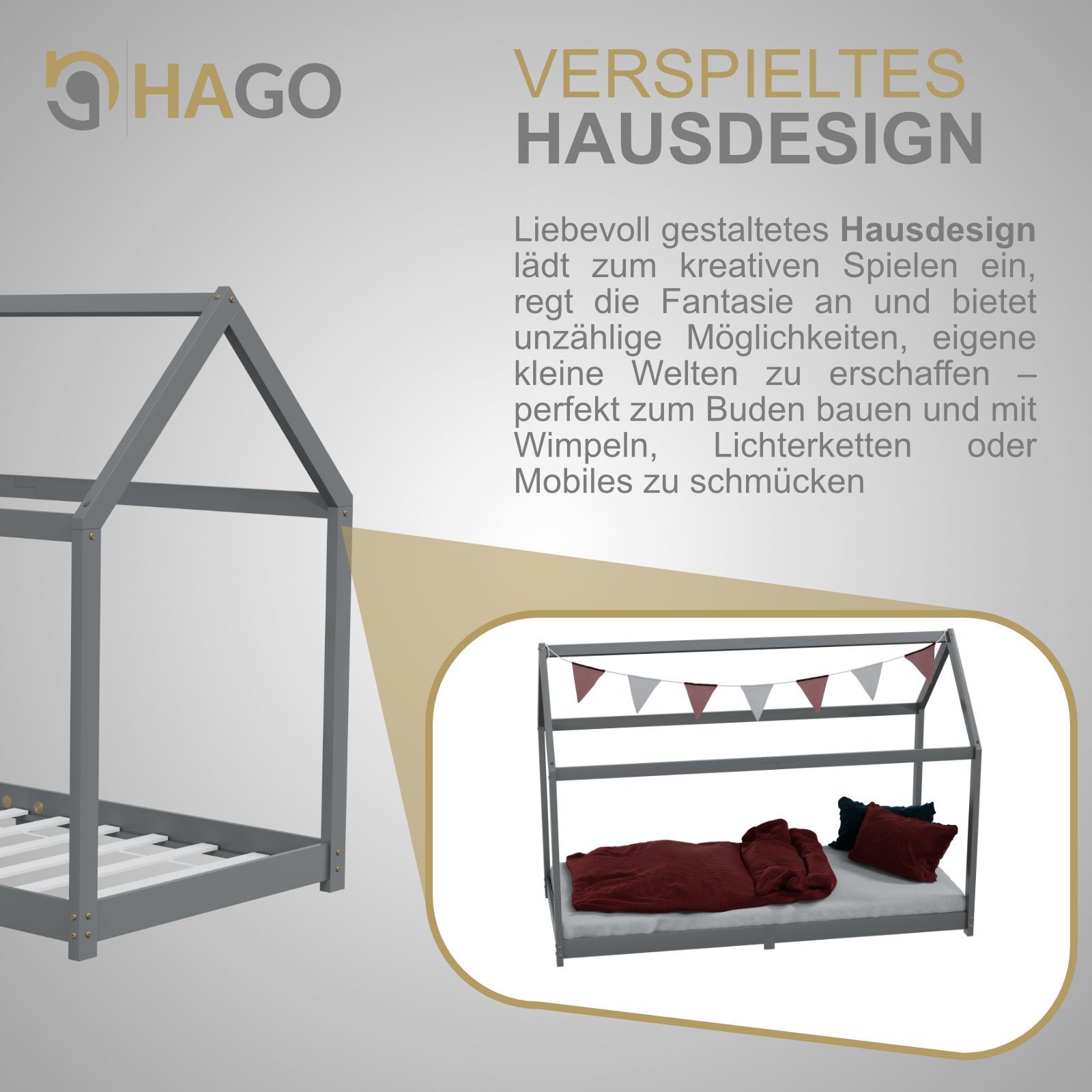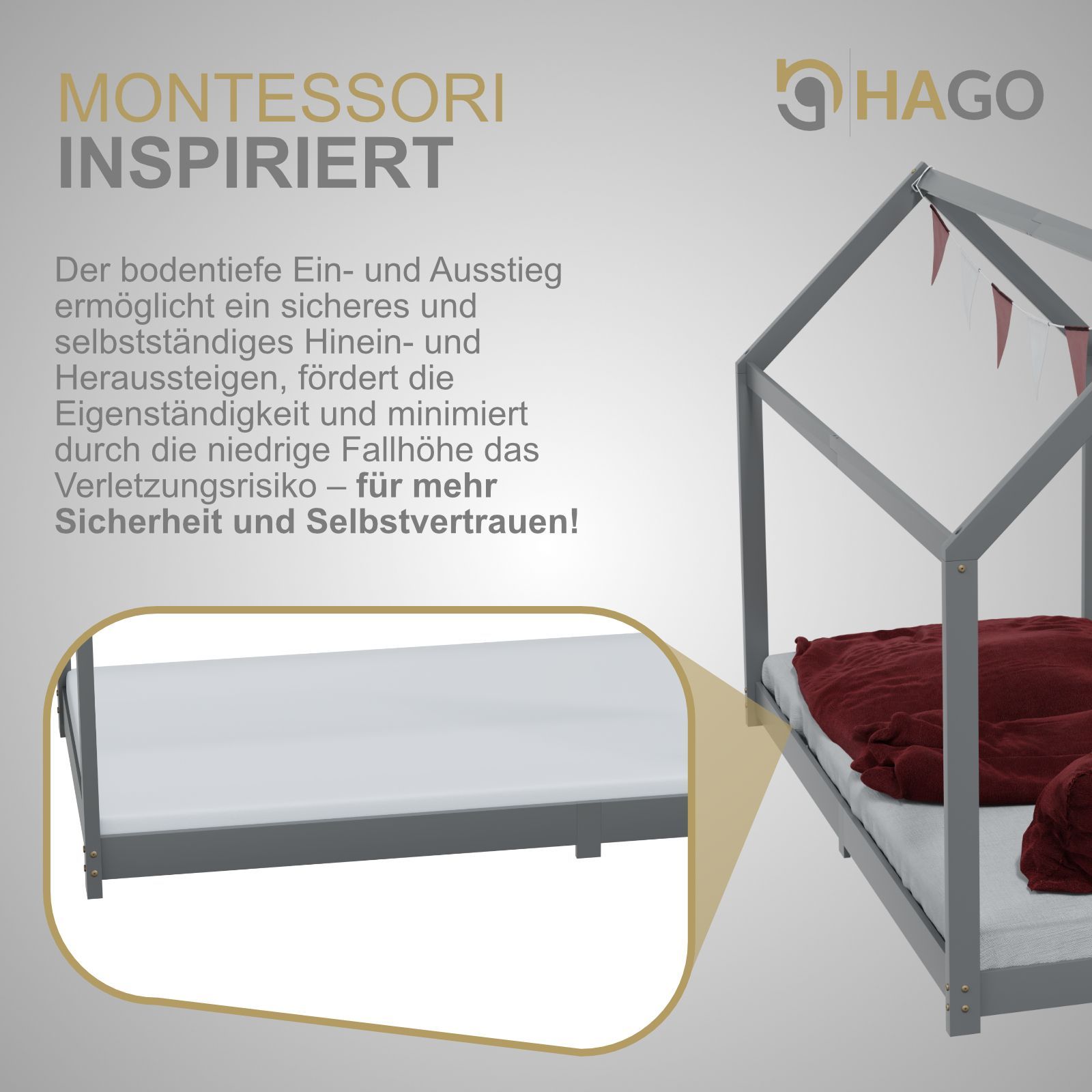 HAGO® Kinderbett 90x200cm Grau Holz Hausoptik Lattenrost Montessori Bodentief