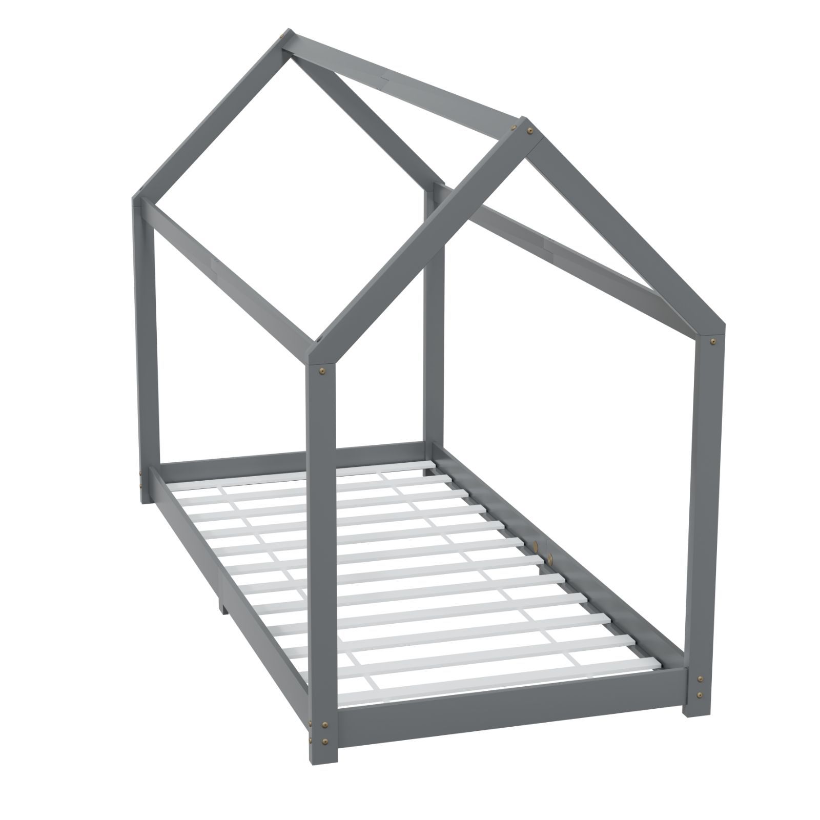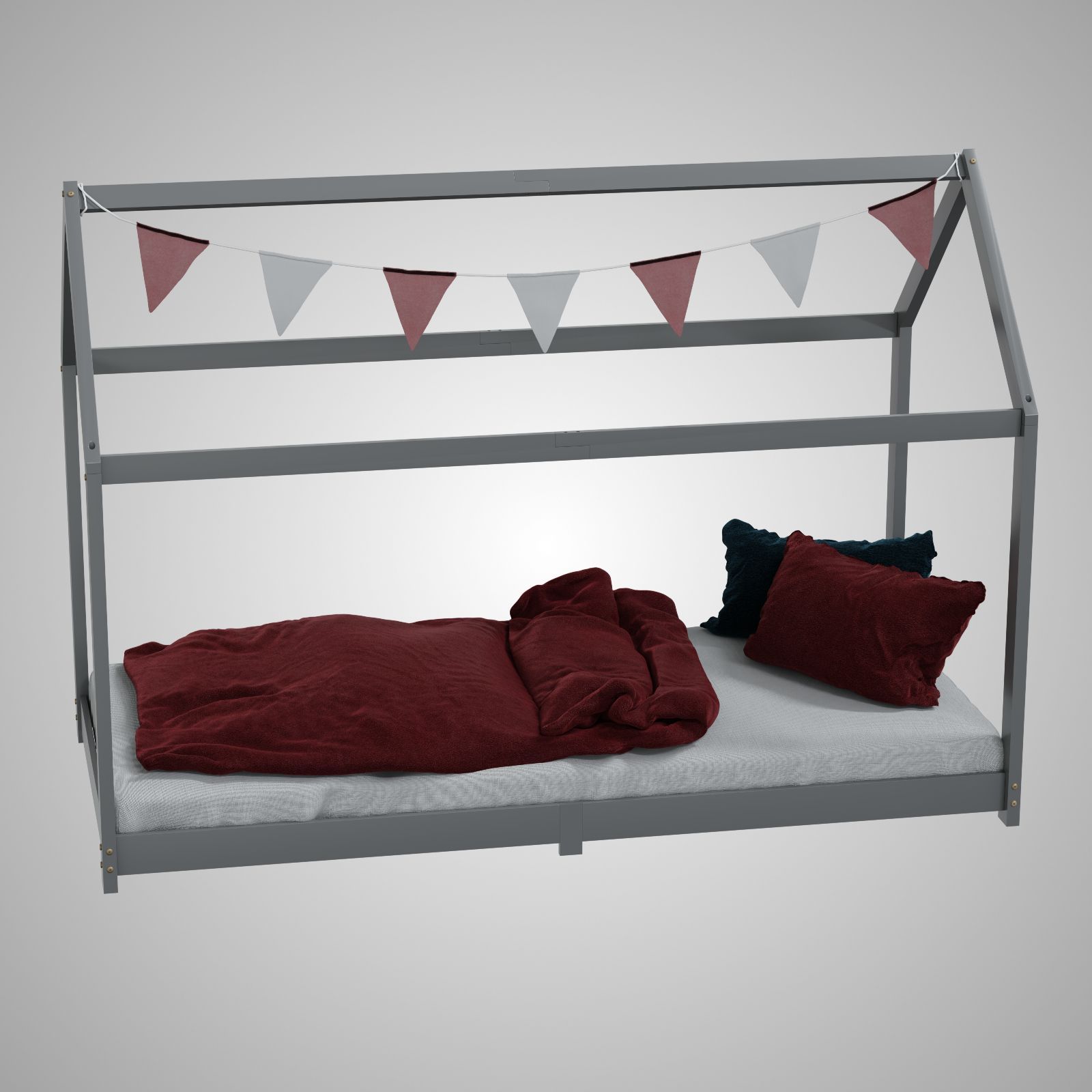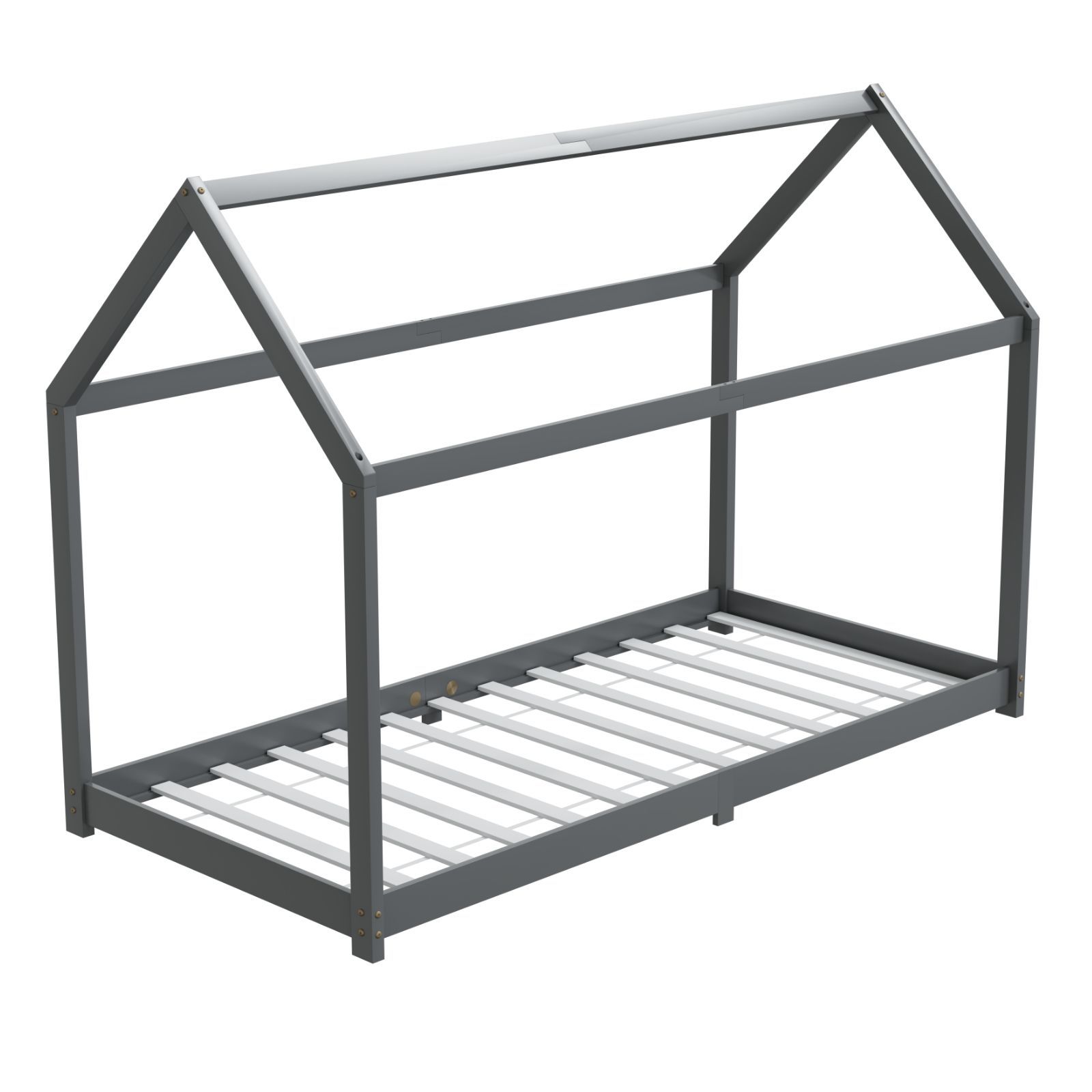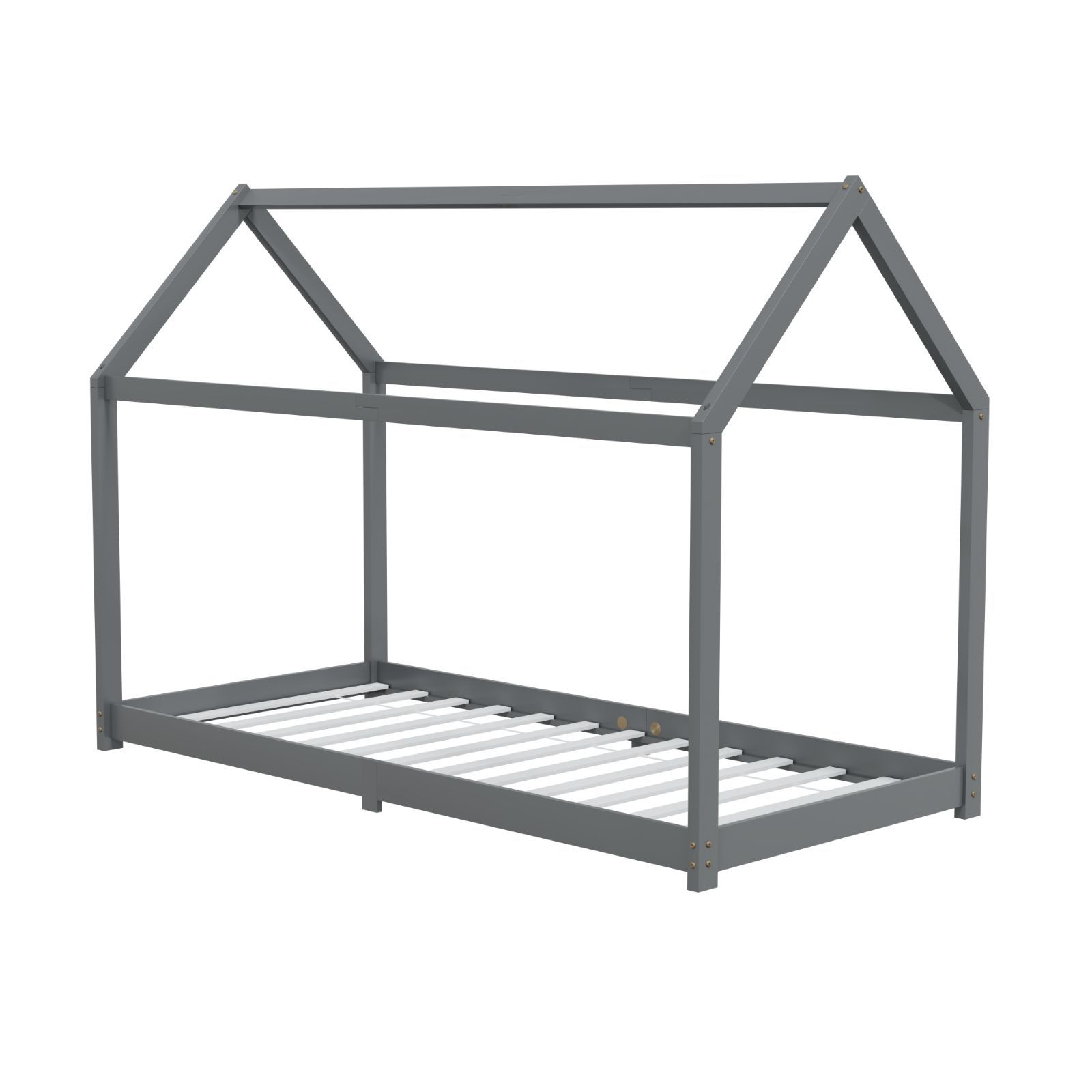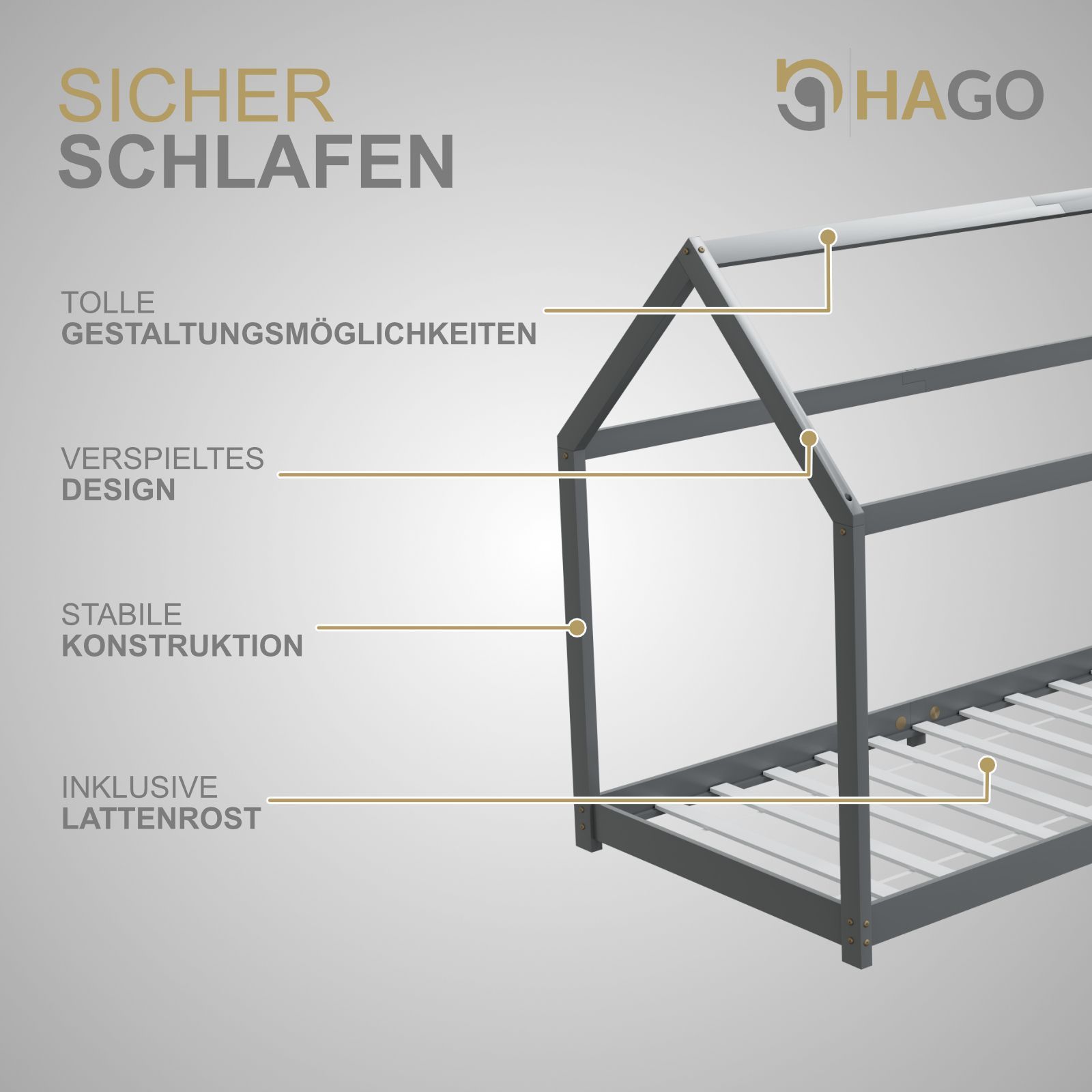HAGO® Kinderbett 90x200cm Grau Holz Hausoptik Lattenrost Montessori Bodentief