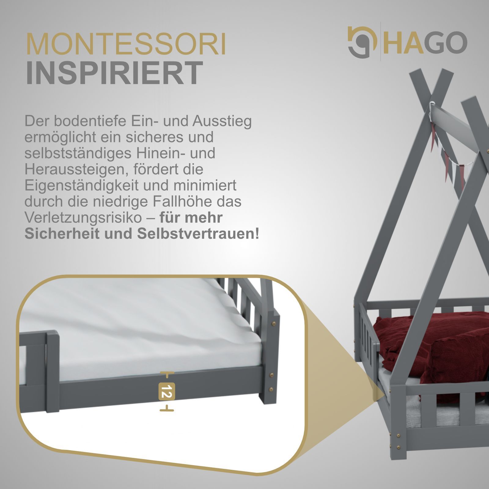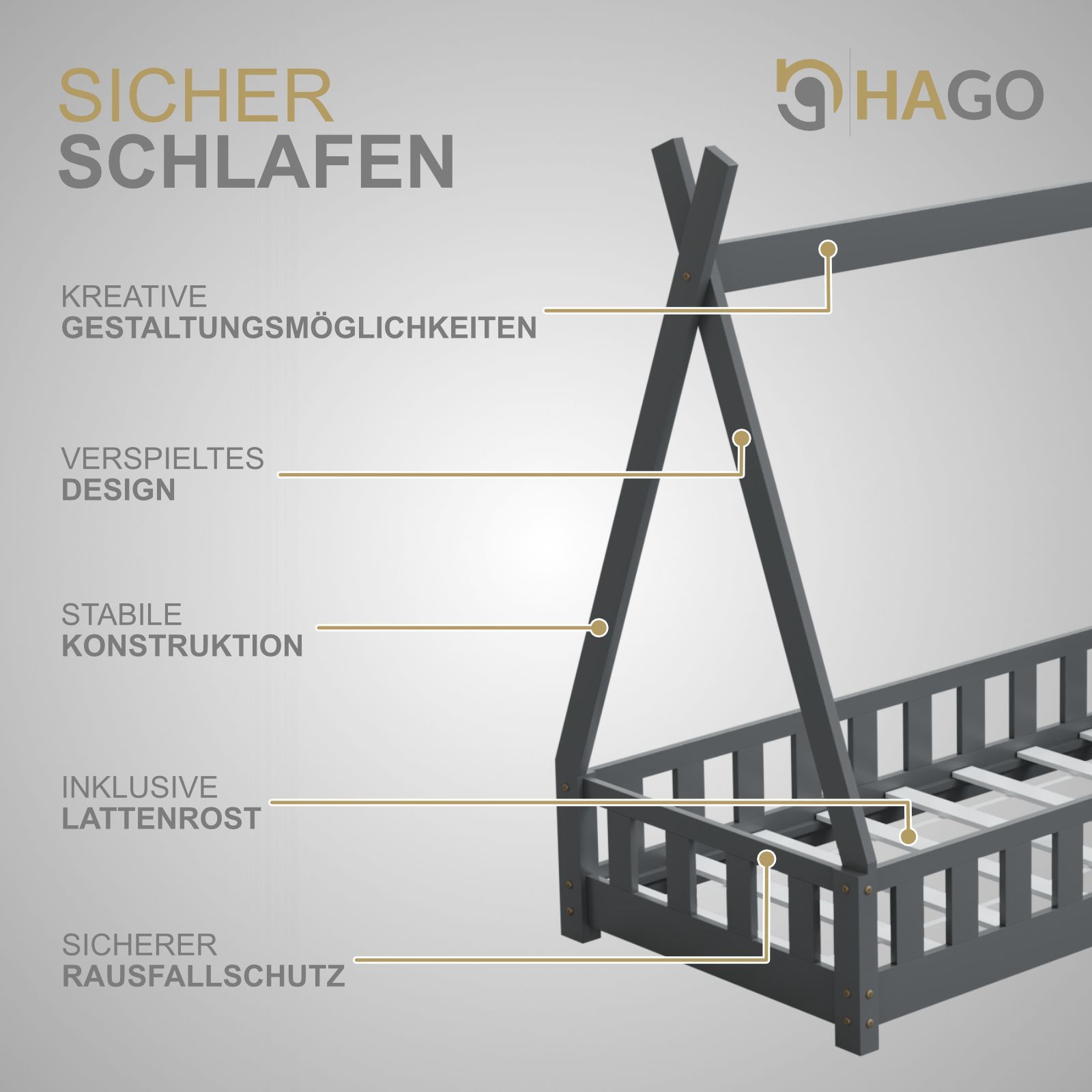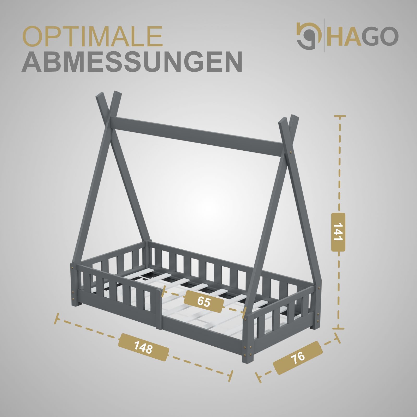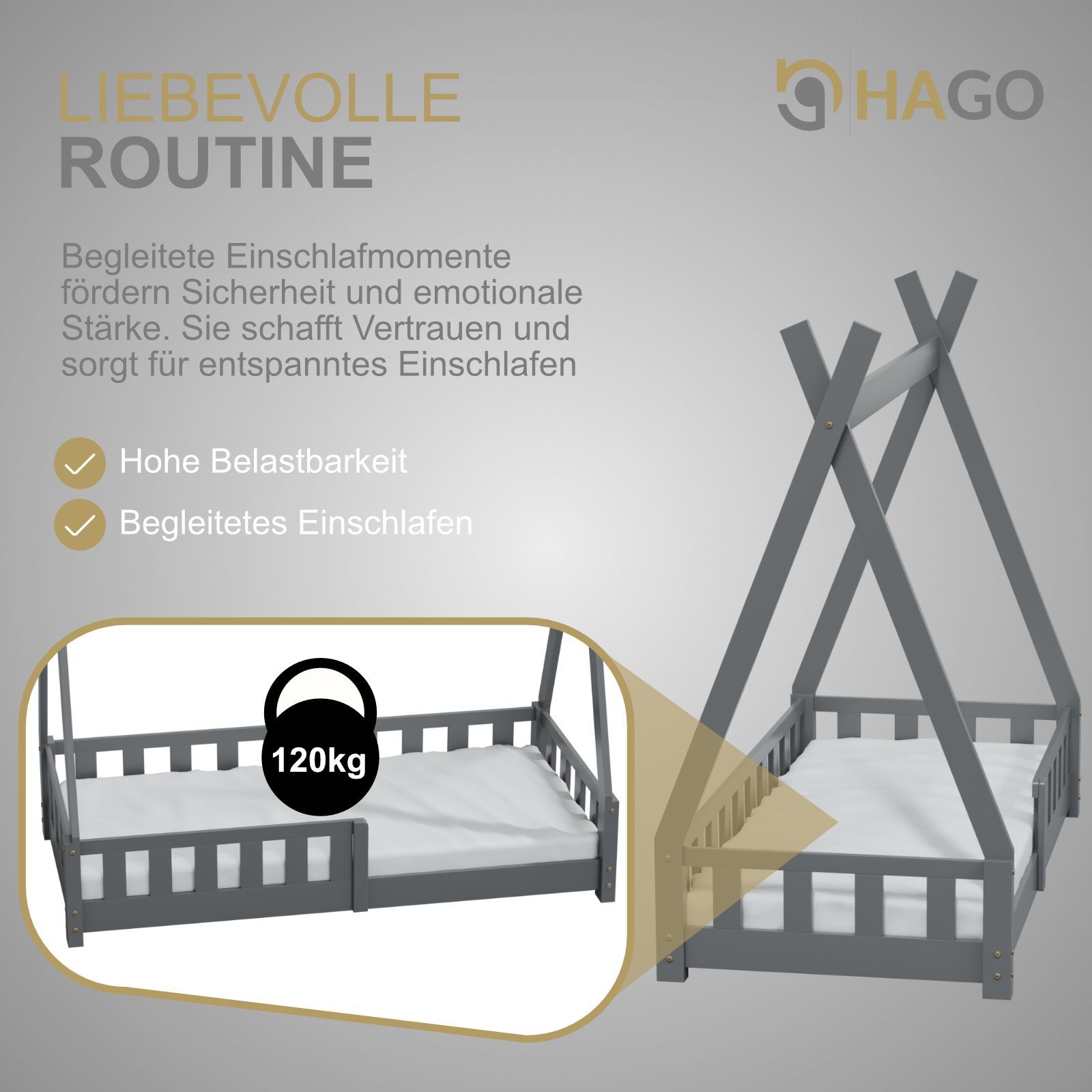 HAGO Kinderbett Tipi Bett Holzhaus 140x70 Rausfallschutz Lattenrost Kiefer Grau