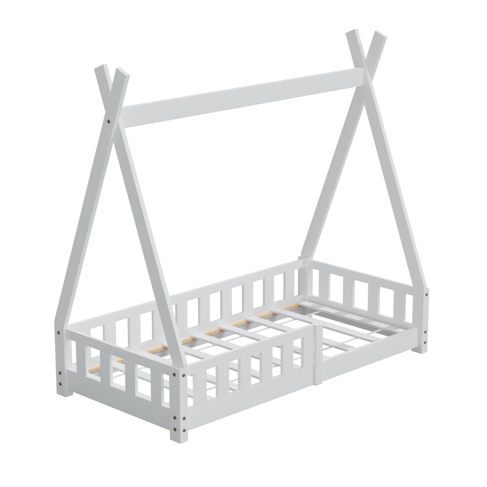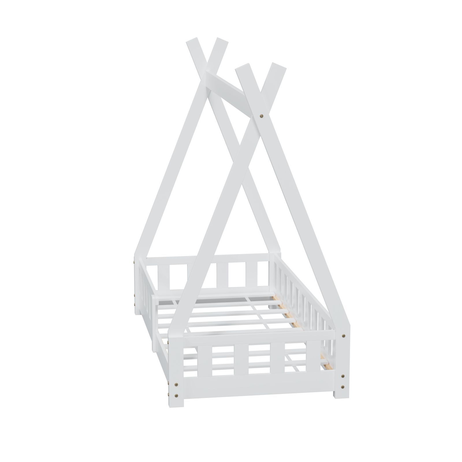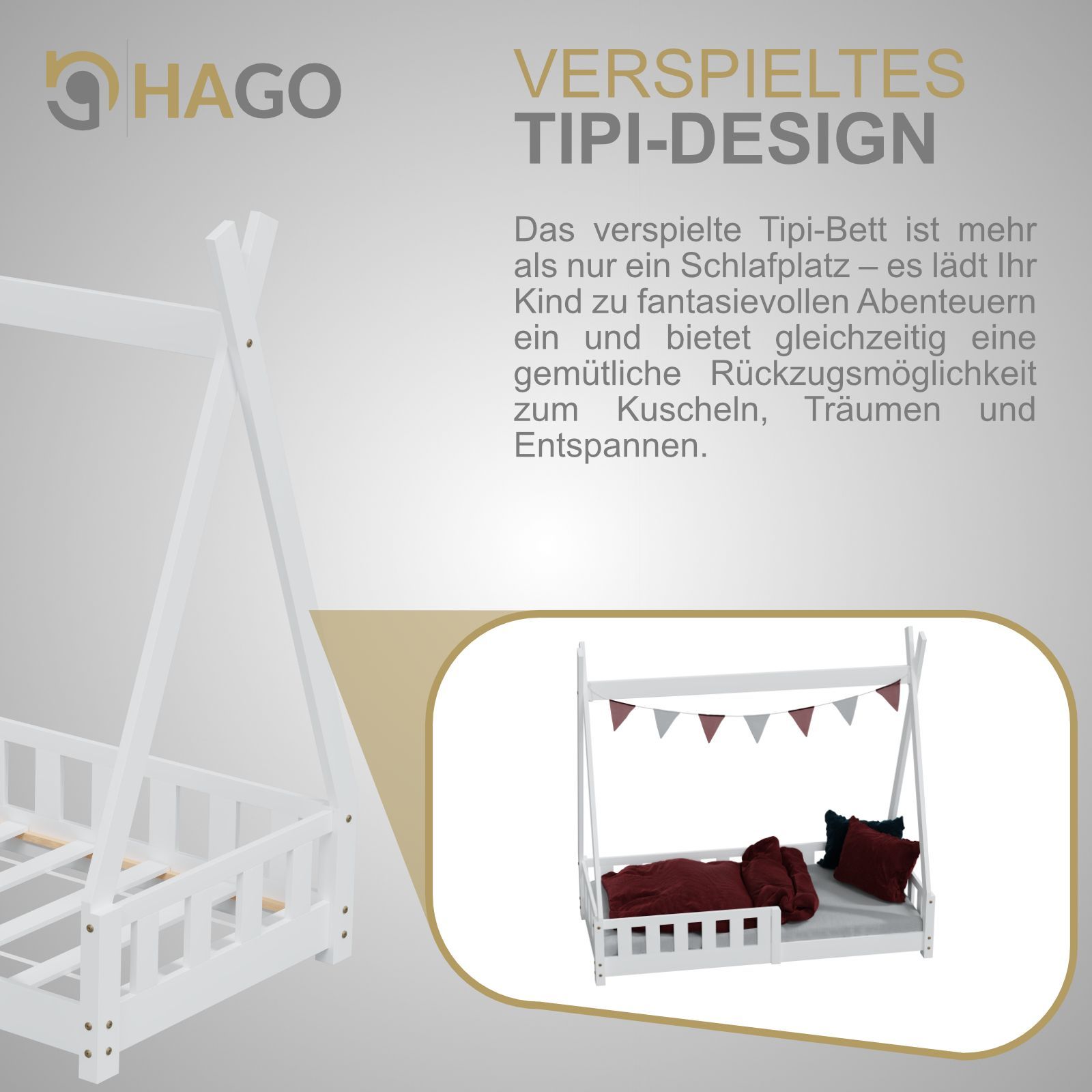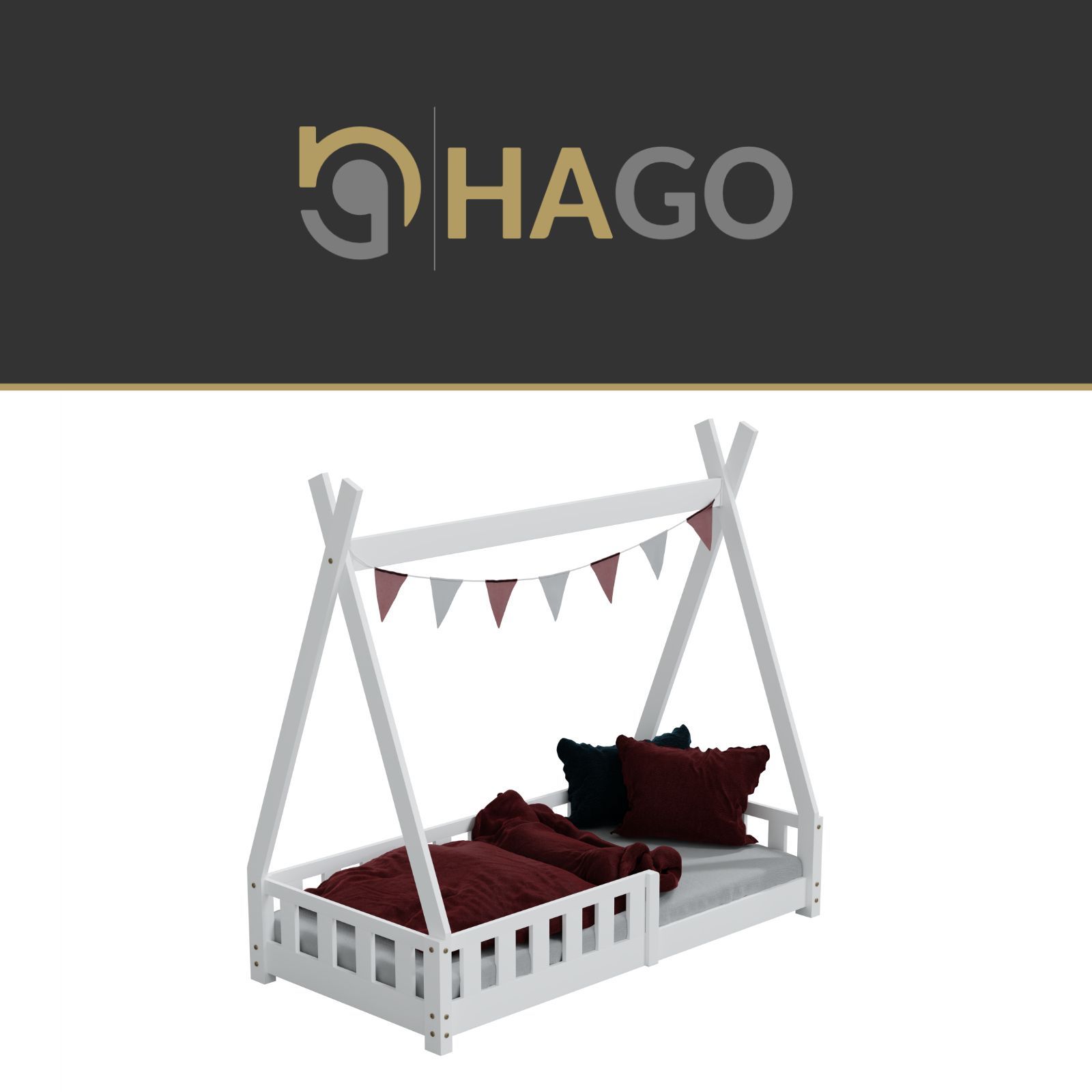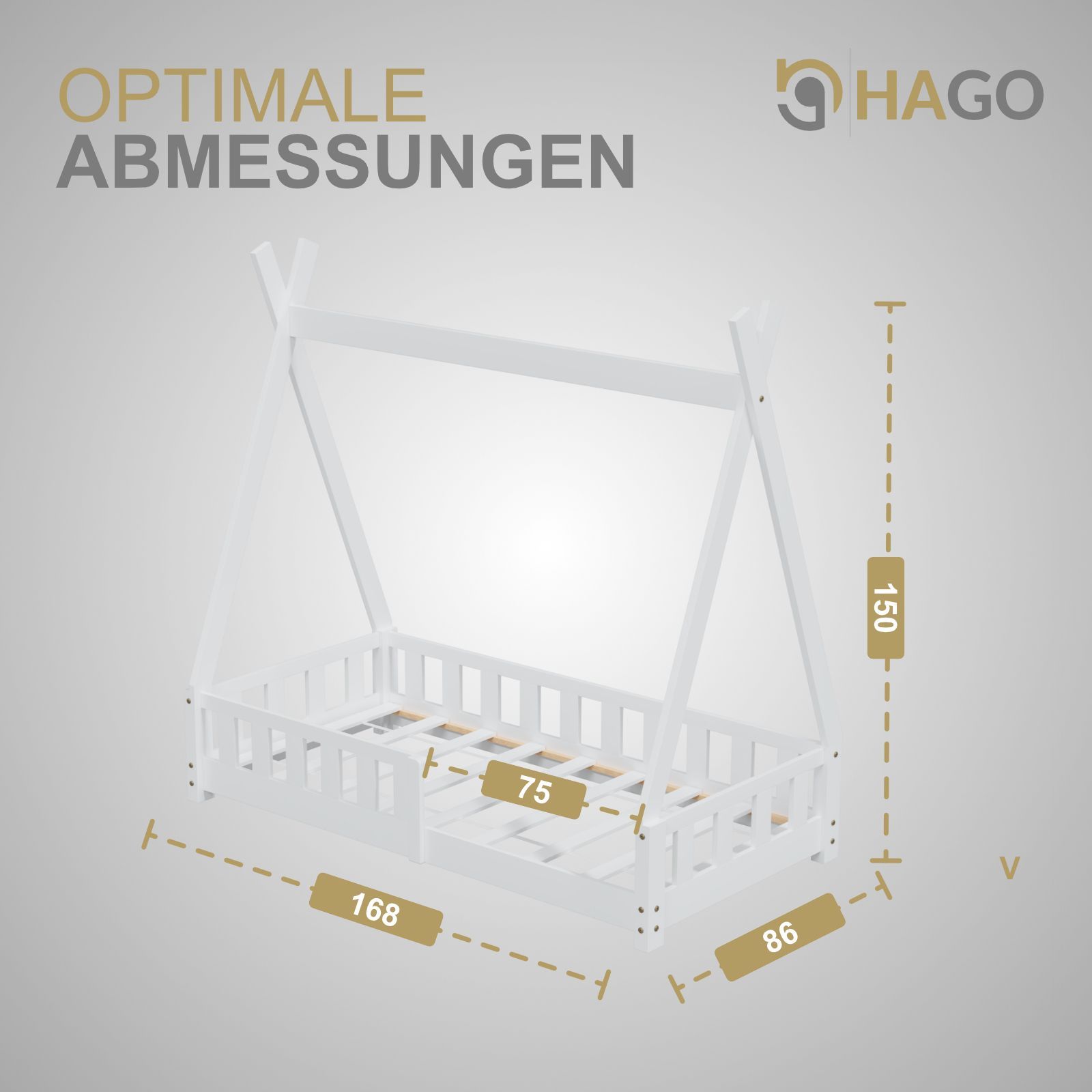 HAGO Kinderbett Tipi Bett Holzhaus 160x80 Rausfallschutz Lattenrost Kiefer Weiß