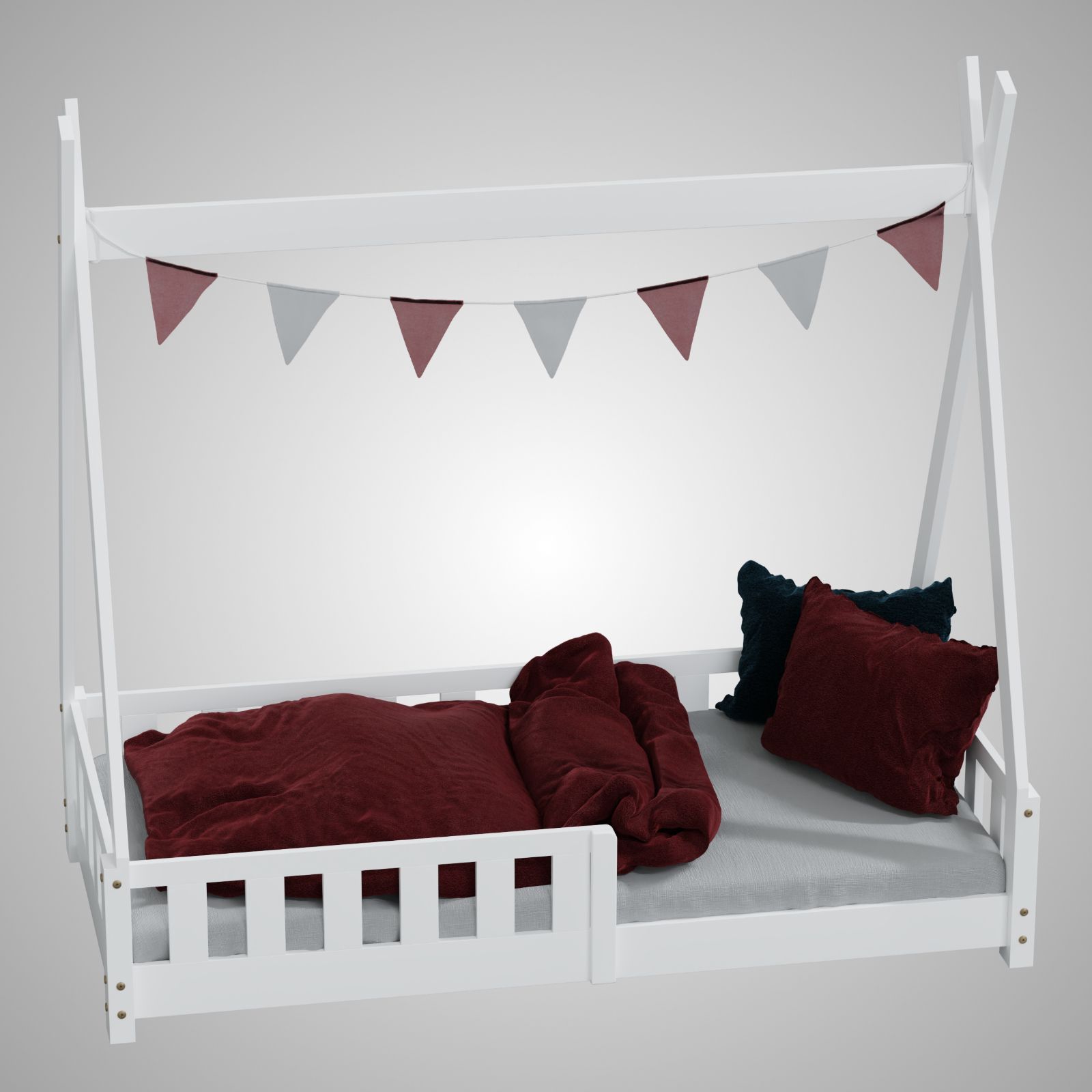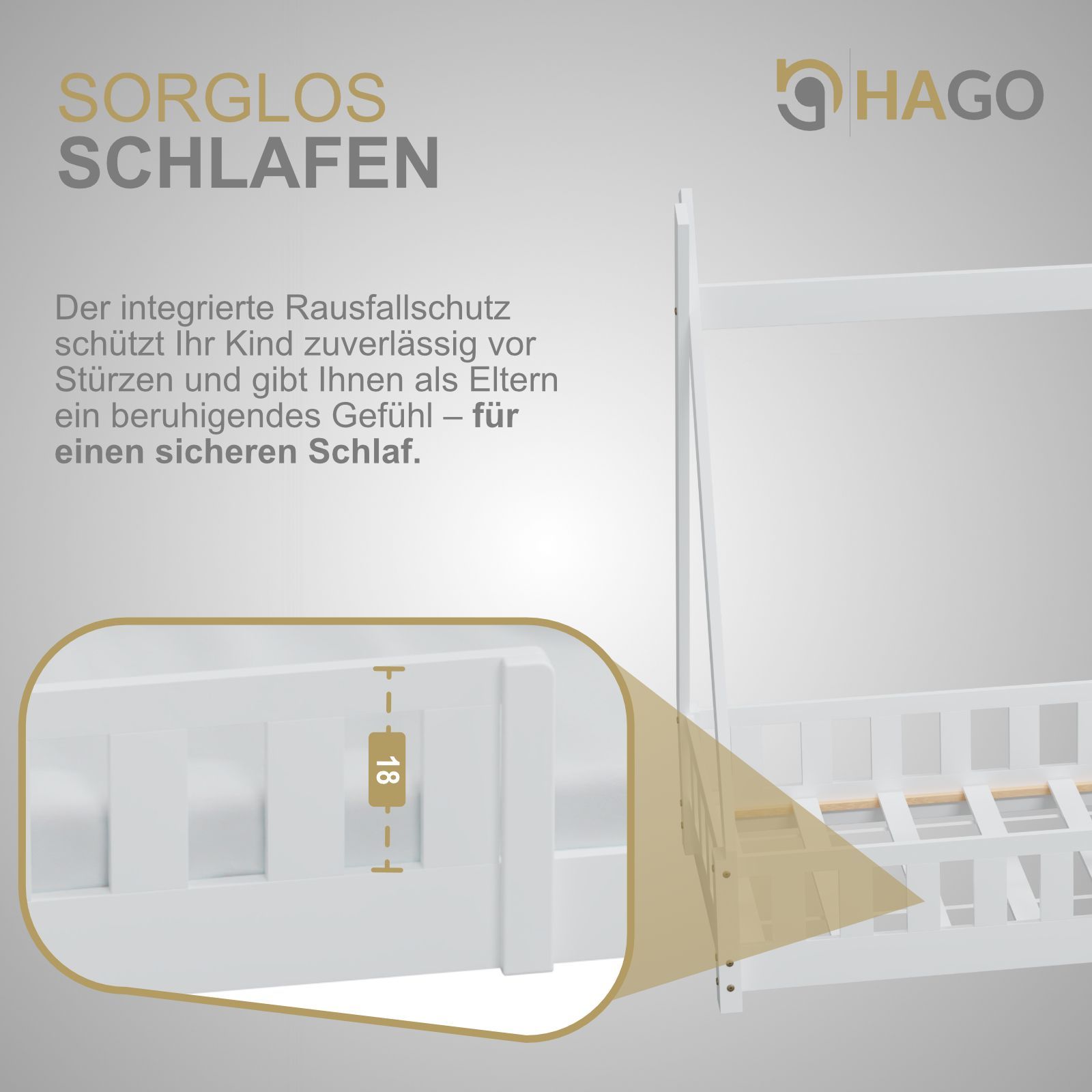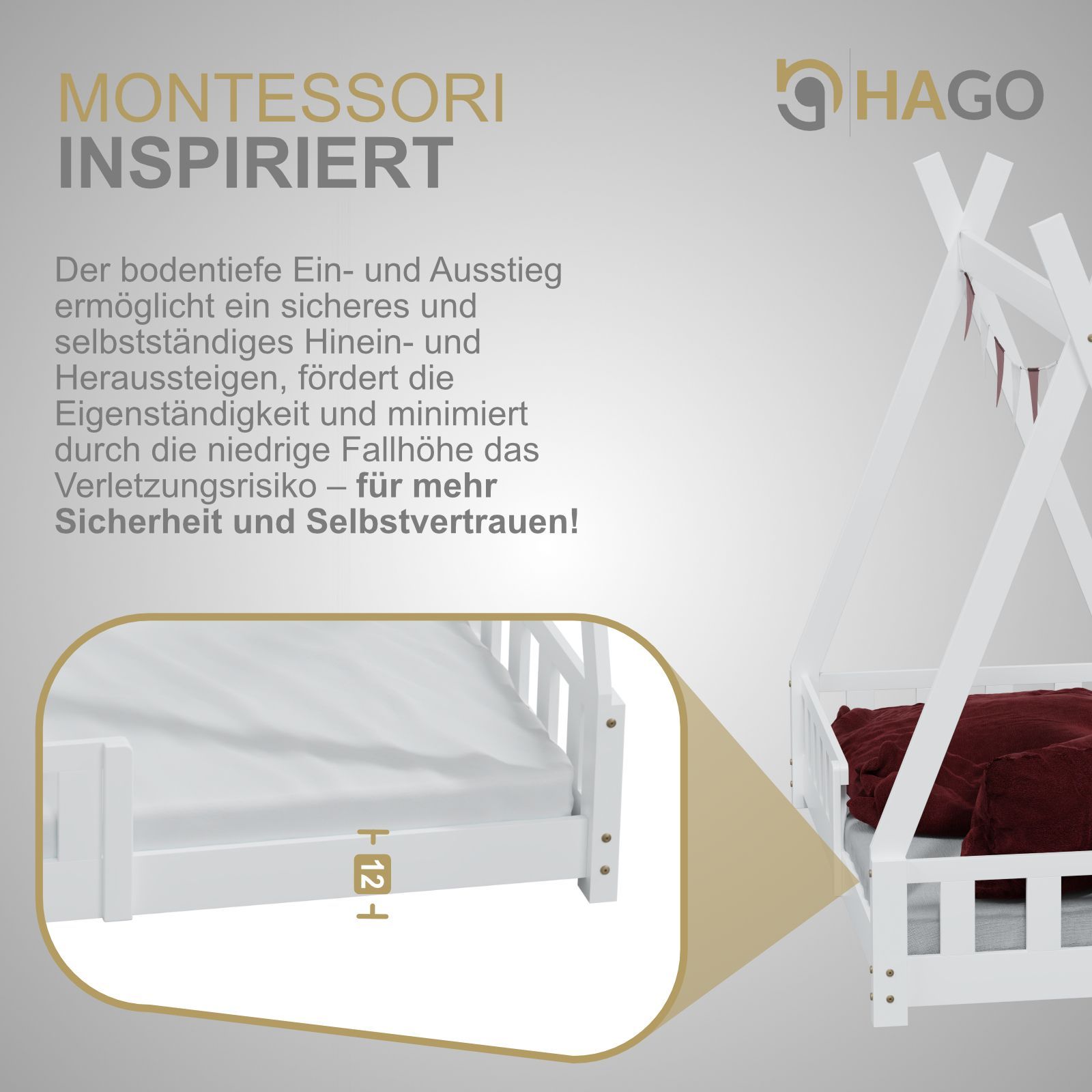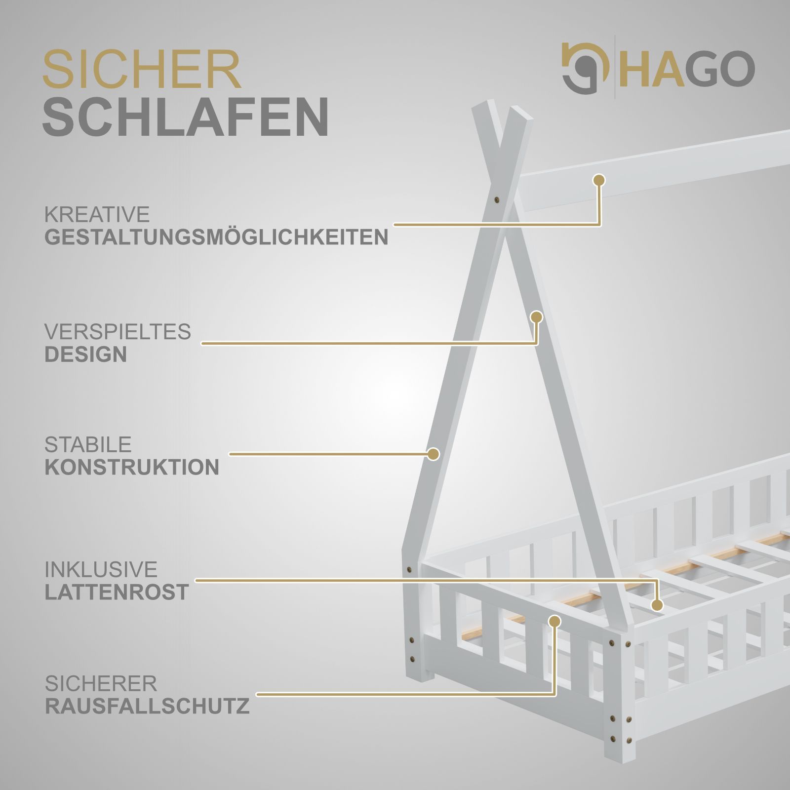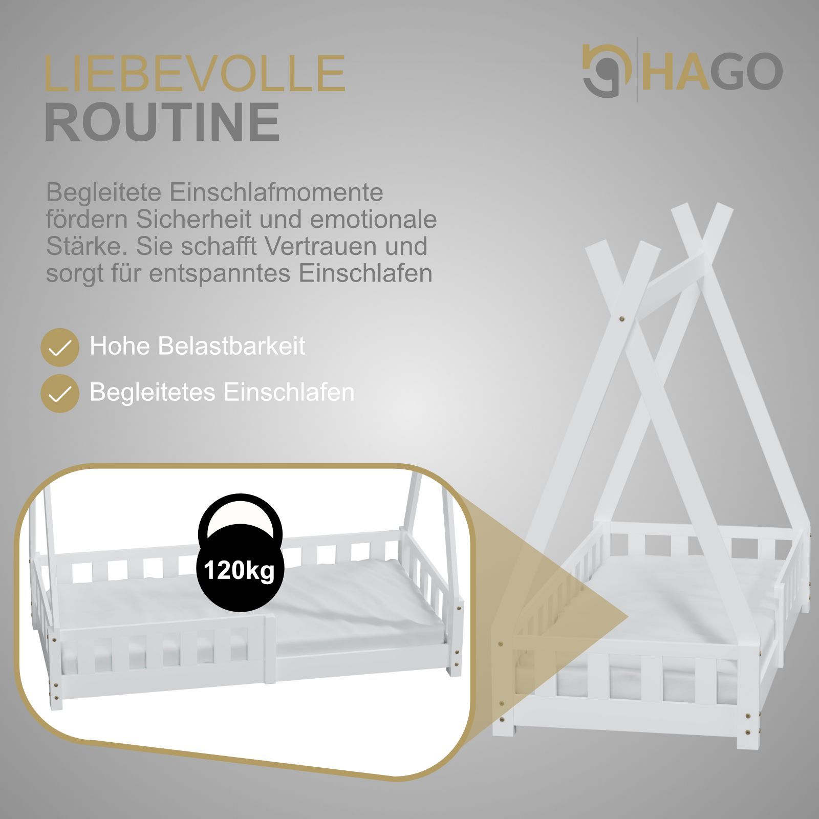 HAGO Kinderbett Tipi Bett Holzhaus 160x80 Rausfallschutz Lattenrost Kiefer Weiß