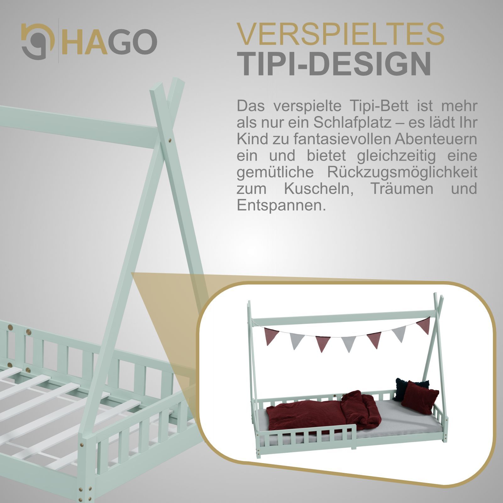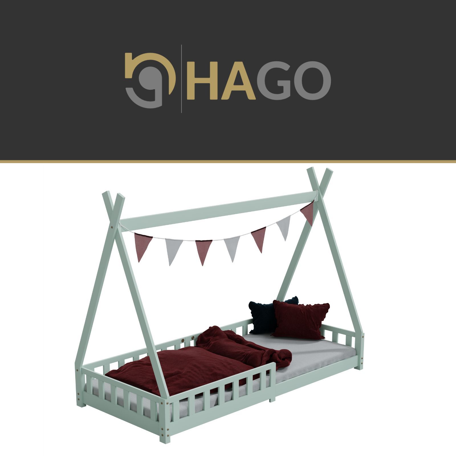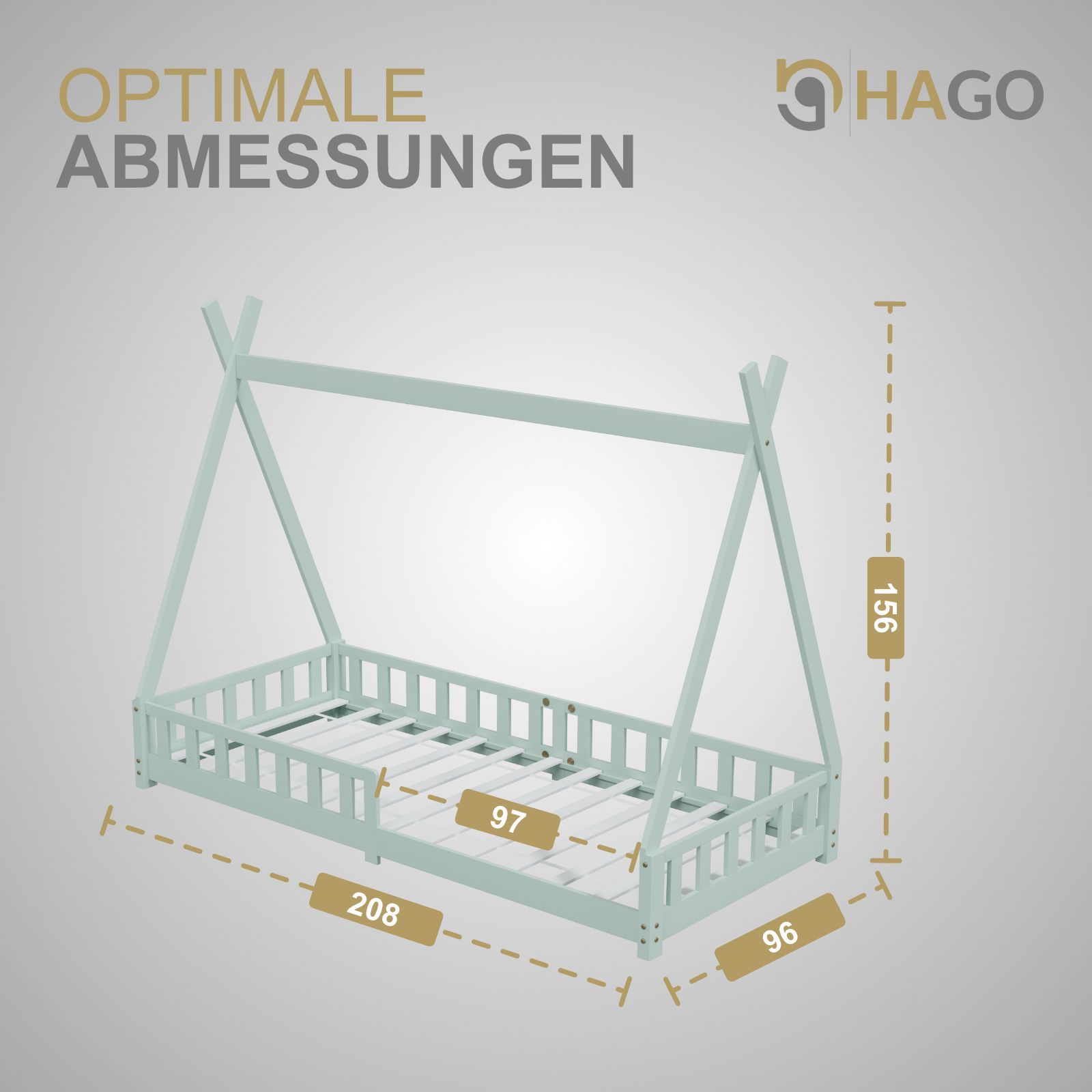 HAGO Kinderbett Tipi Bett Holzhaus 200x90 Rausfallschutz Lattenrost Kiefer Mint