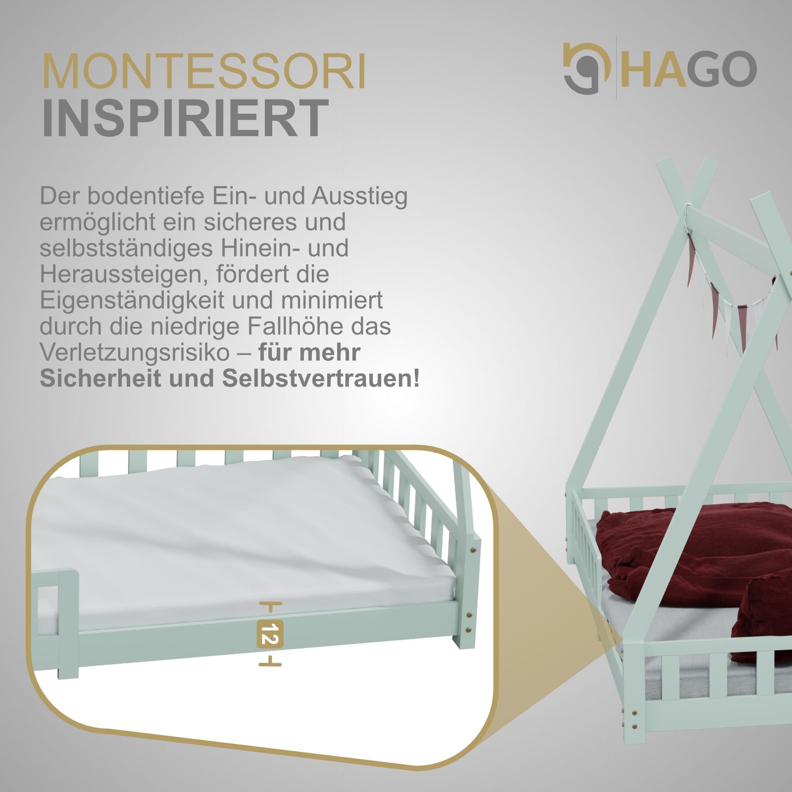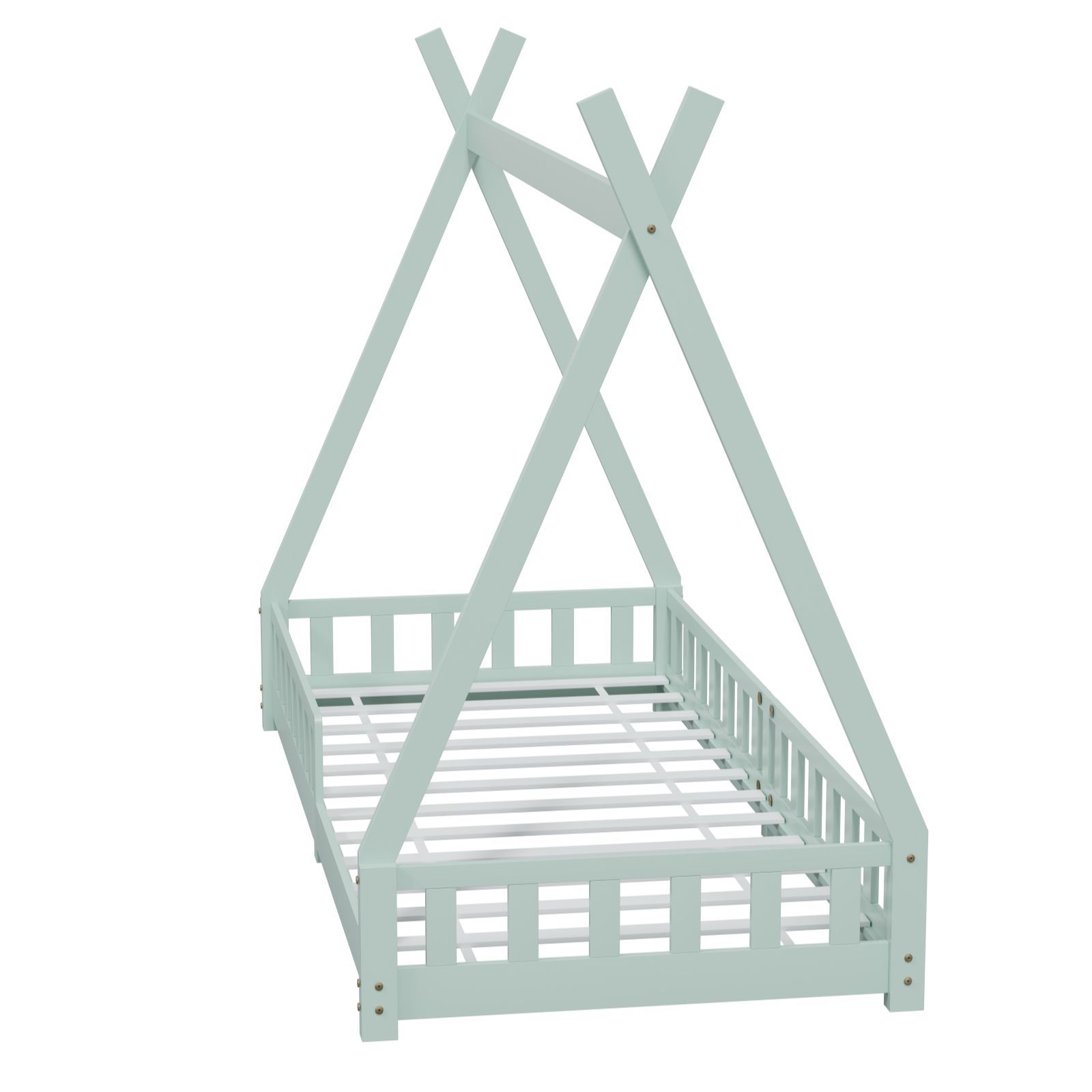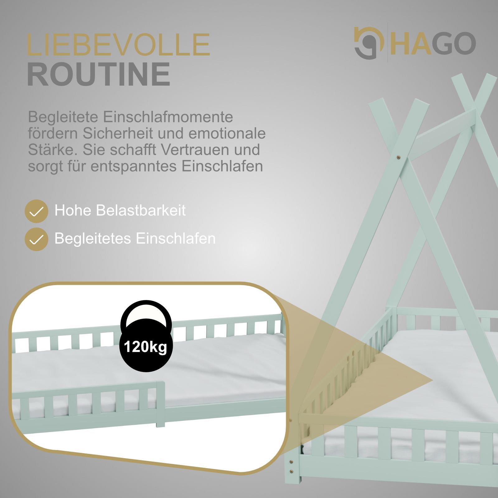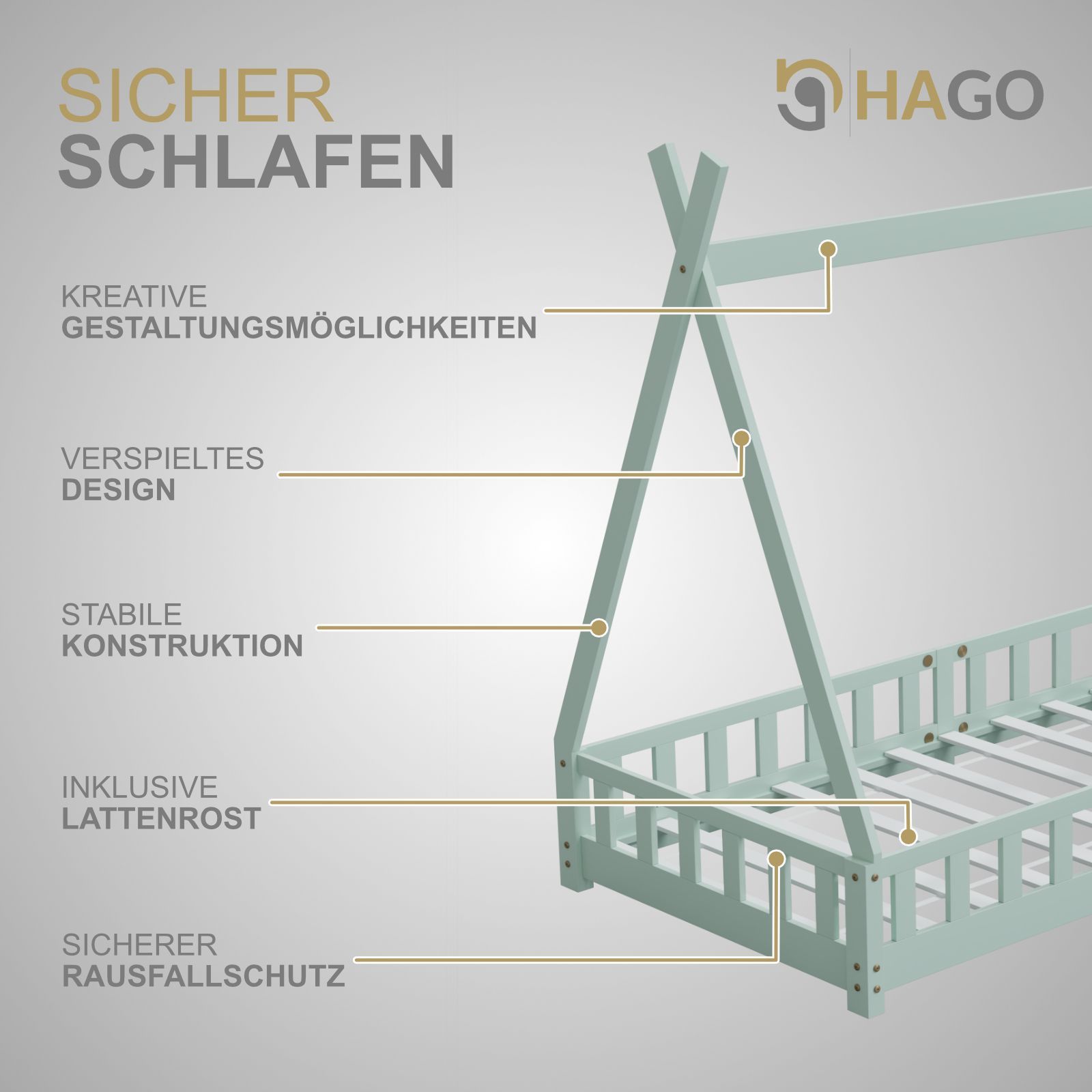 HAGO Kinderbett Tipi Bett Holzhaus 200x90 Rausfallschutz Lattenrost Kiefer Mint