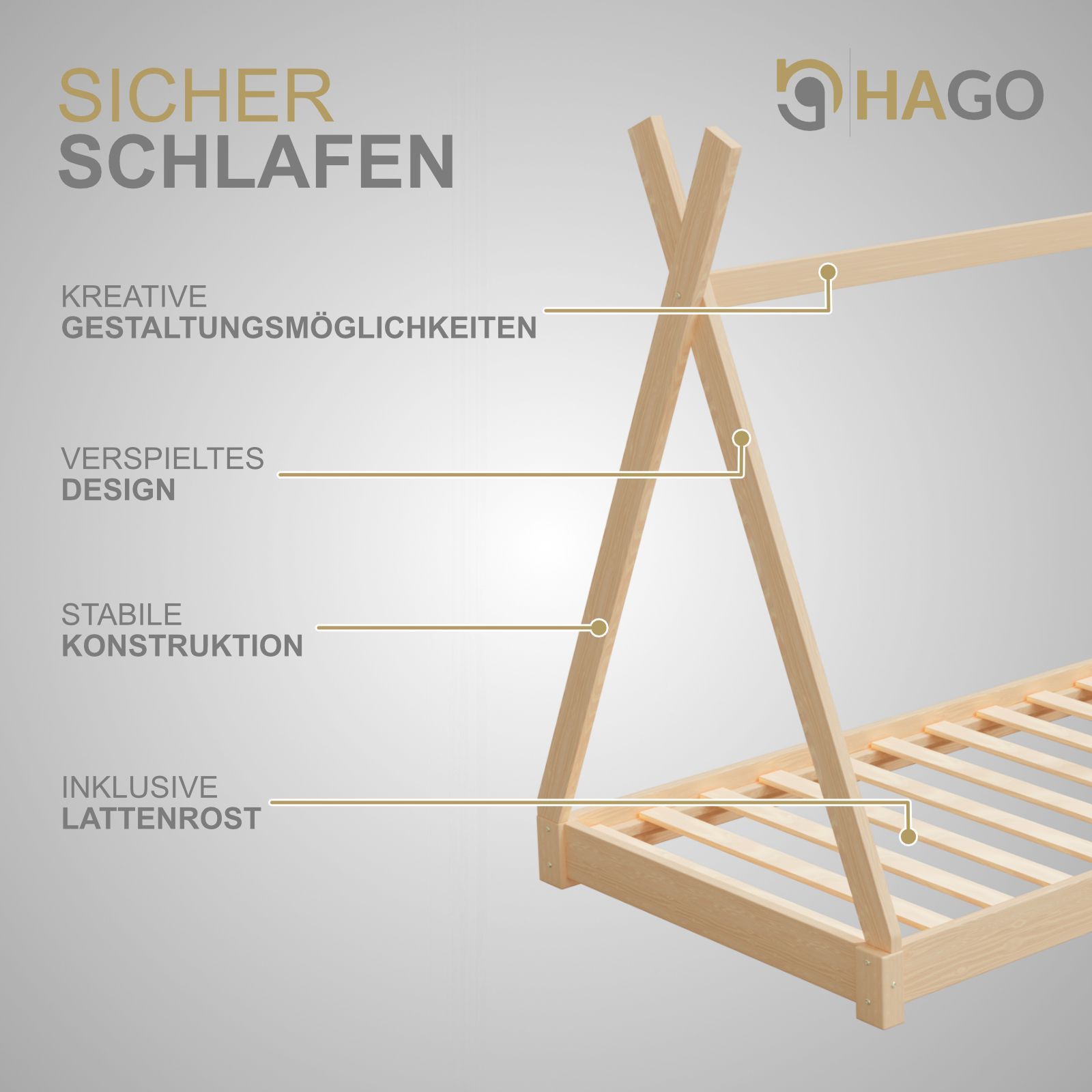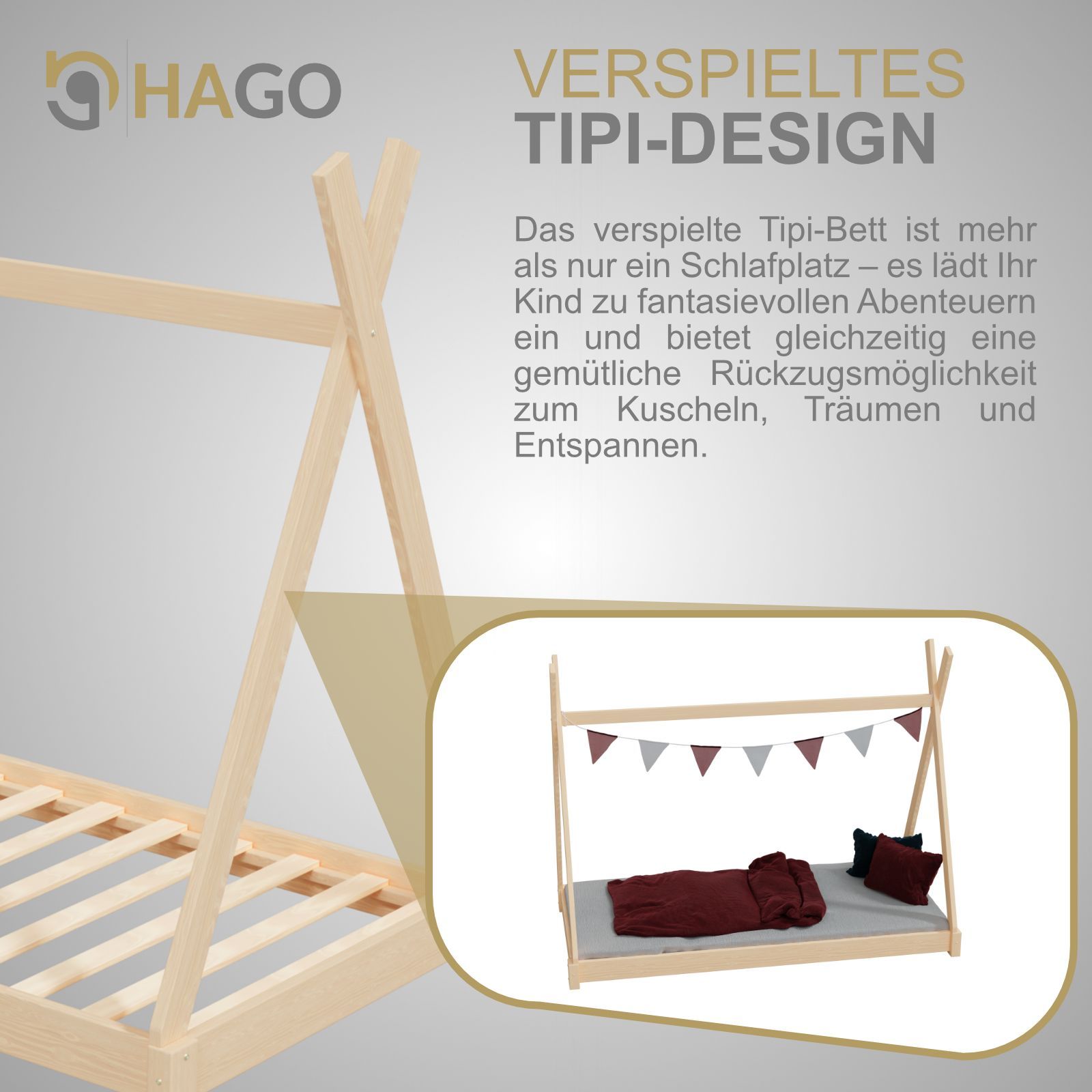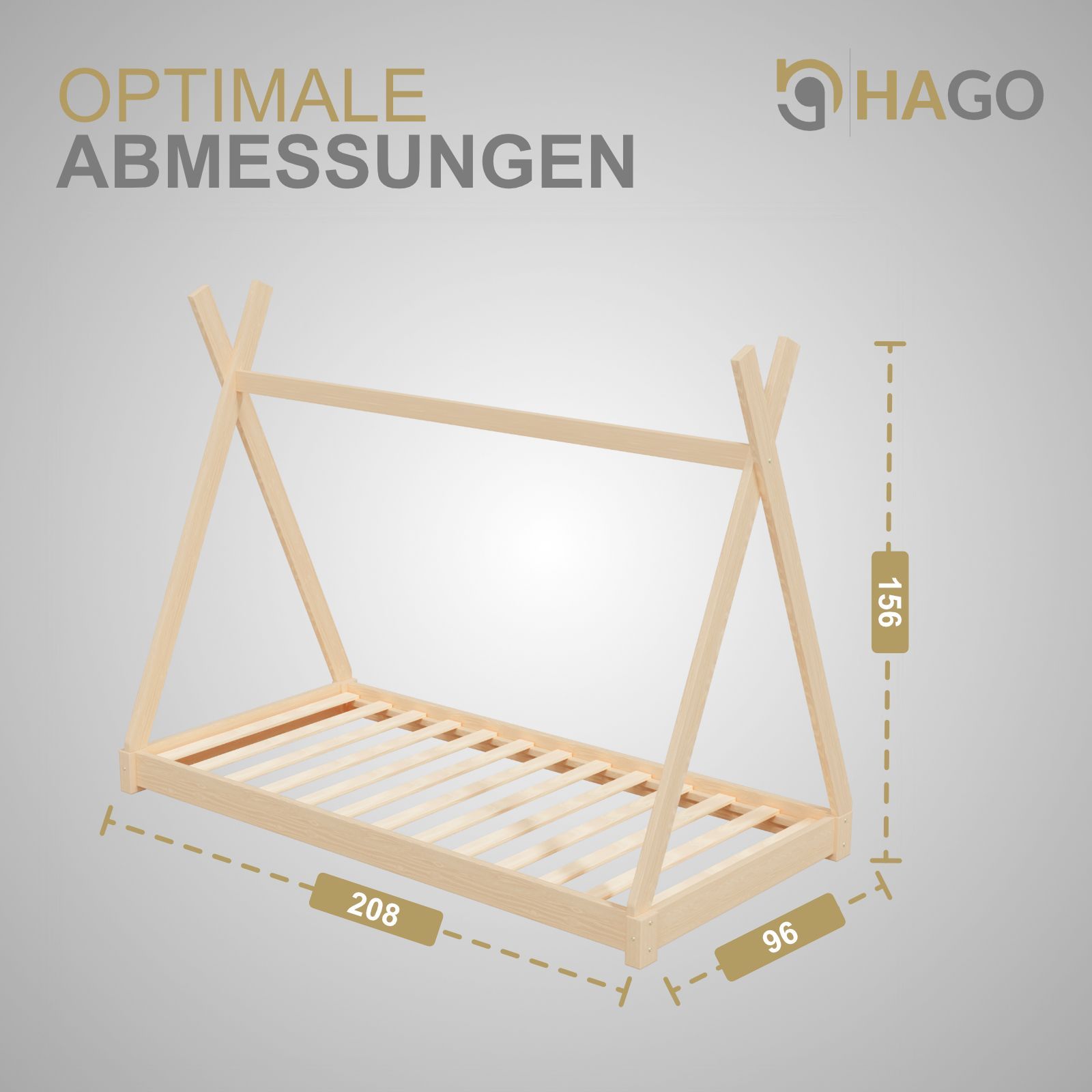 HAGO® Kinderbett Tipibett Holz 200x90cm Natur Bettgestell Tipi Lattenrost