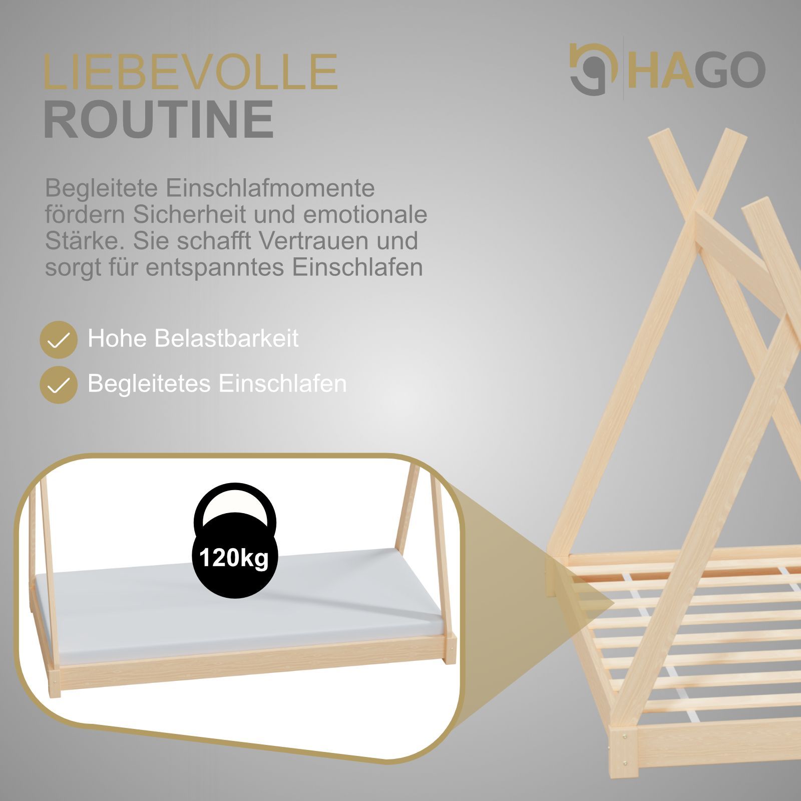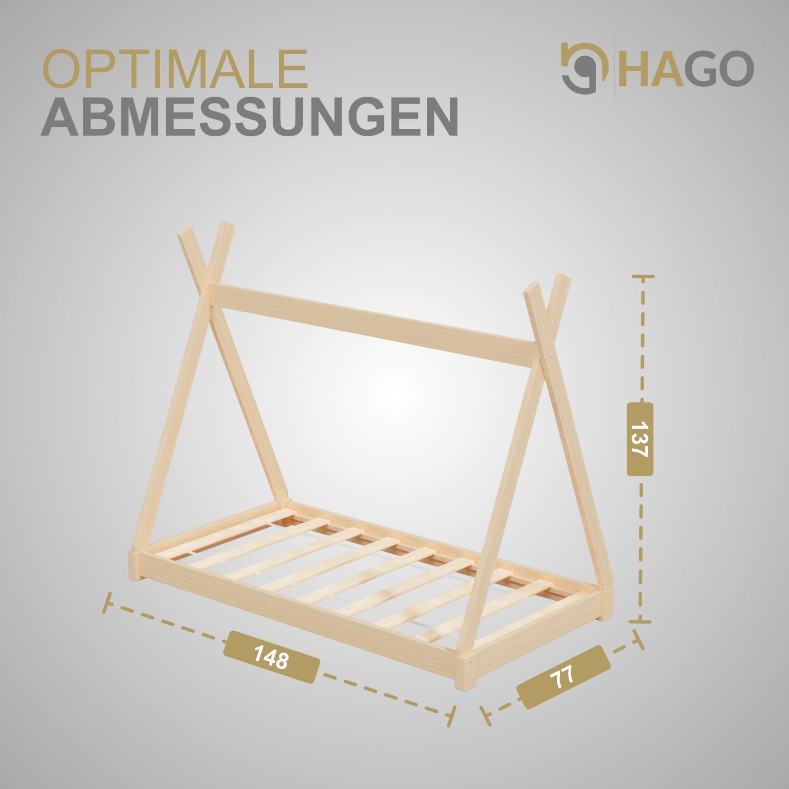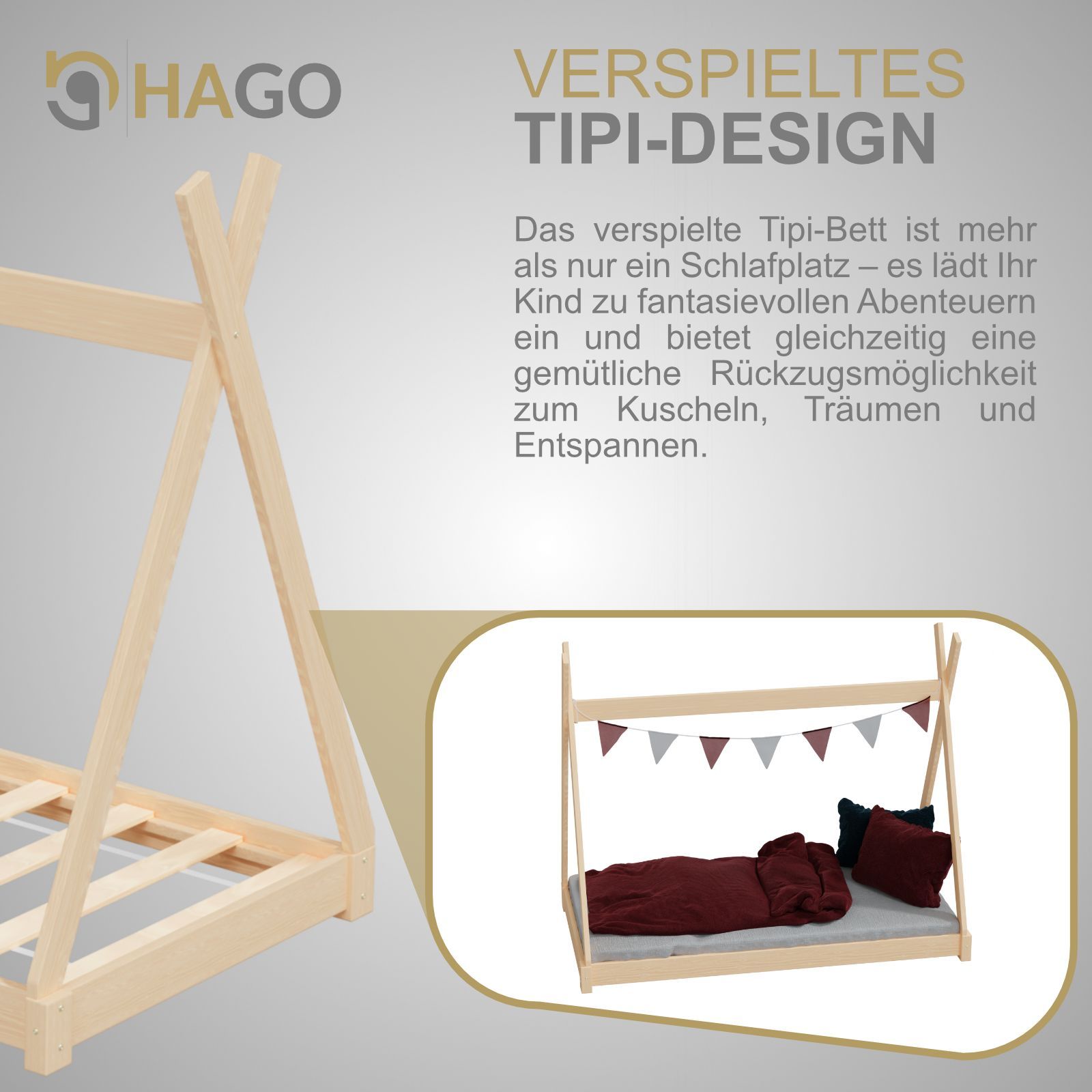 HAGO® Kinderbett Tipibett Holz Kiefer 140x70cm Bettgestell Tipi Lattenrost Natur