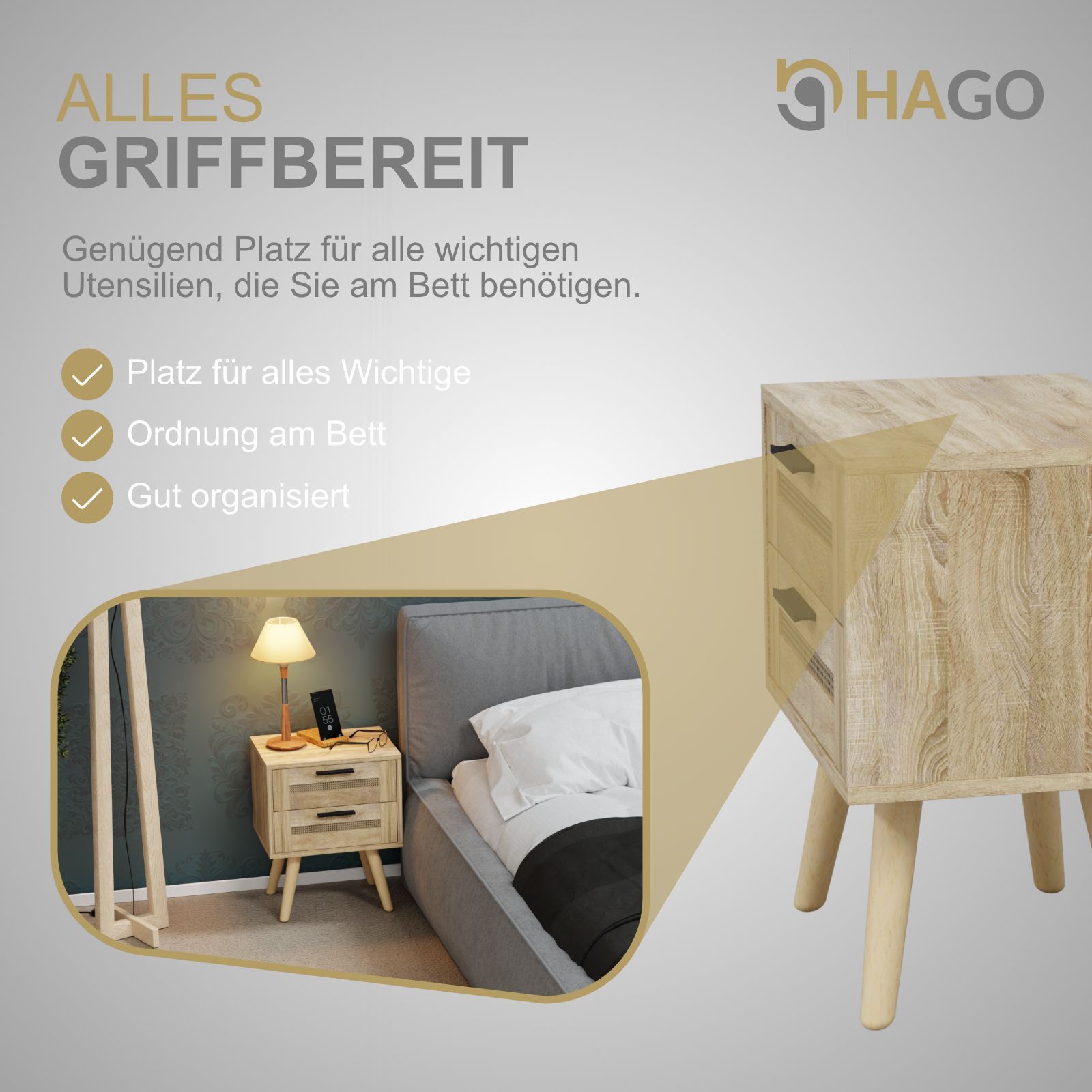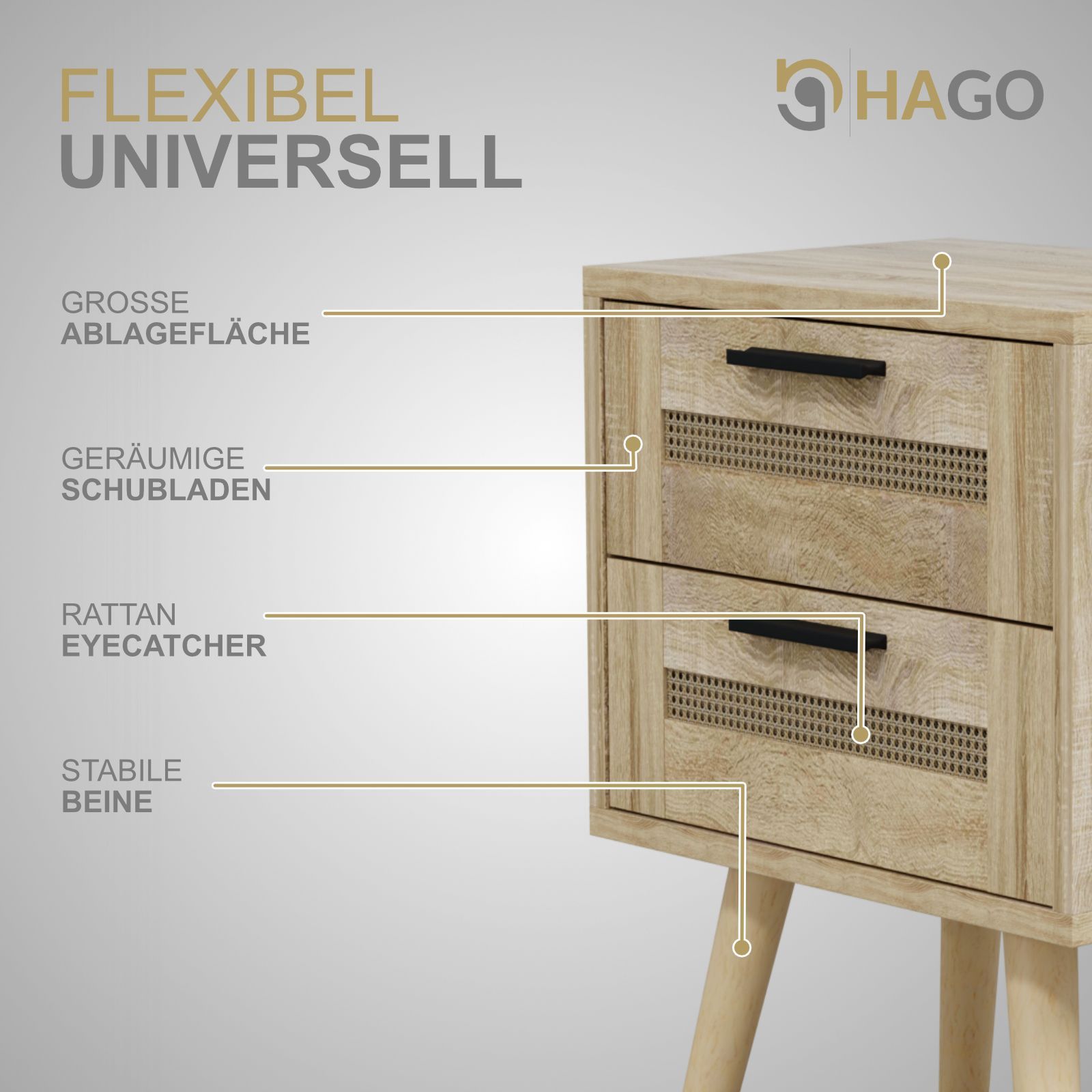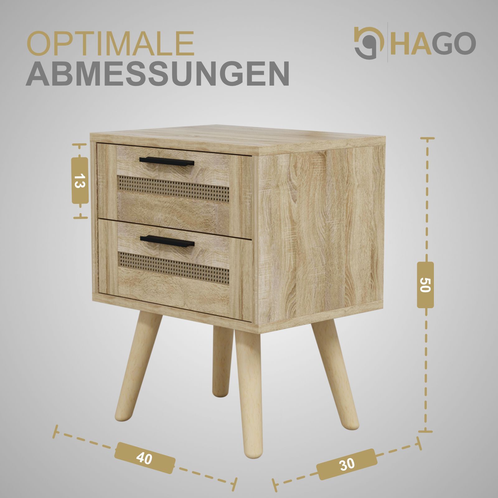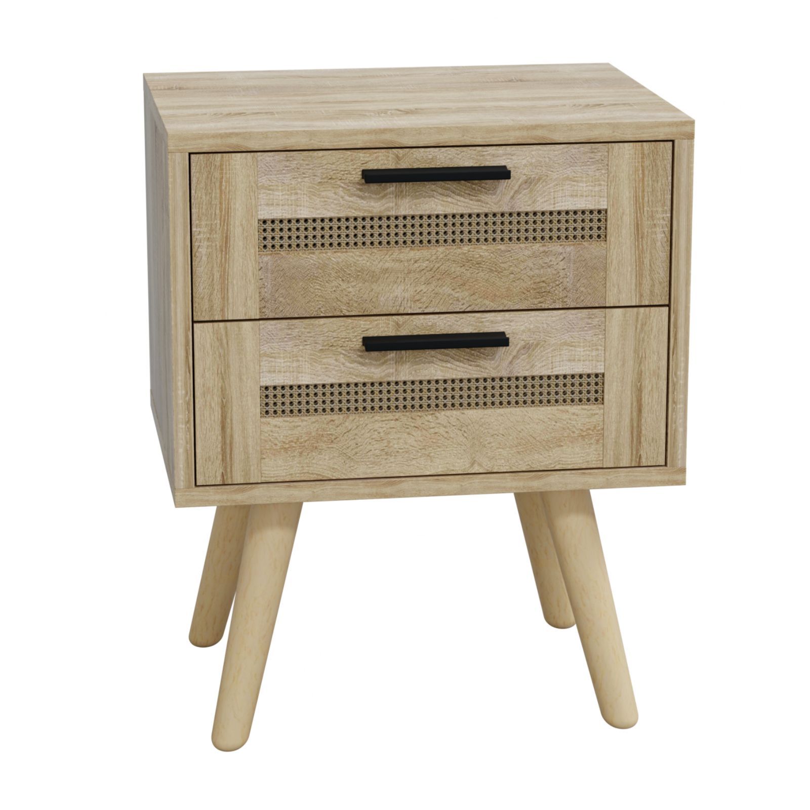 HAGO® Nachttisch Beistelltisch Nachtkommode Rattan Eiche Sonoma 40x30x50 2 Schublade