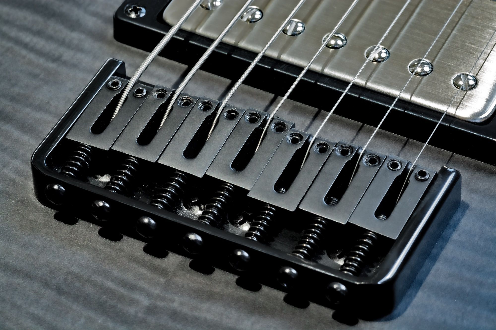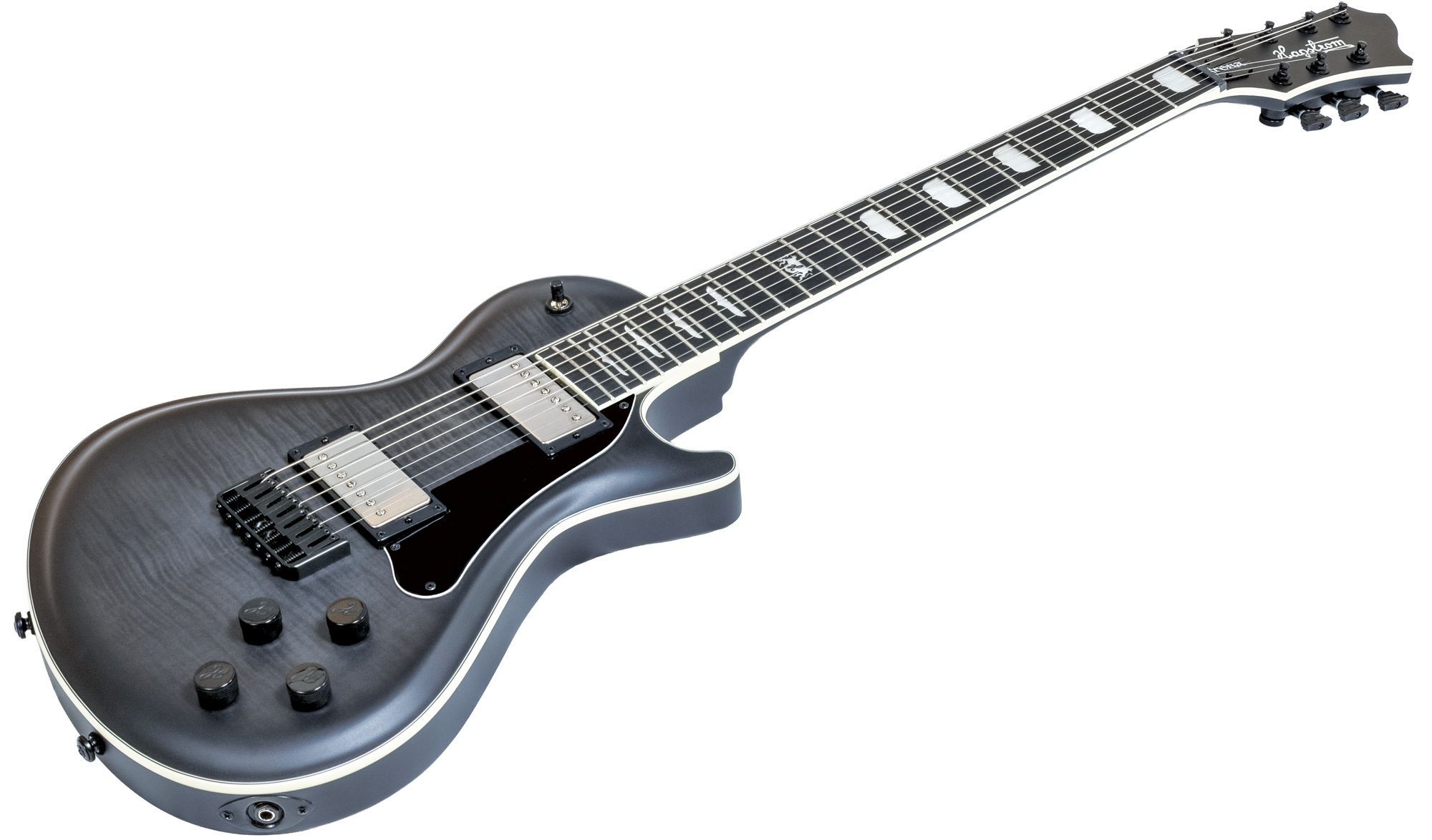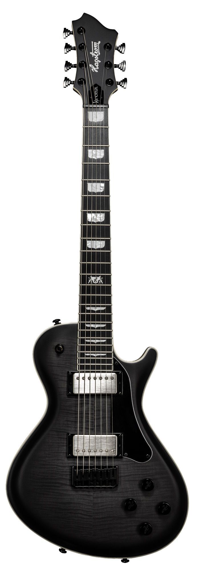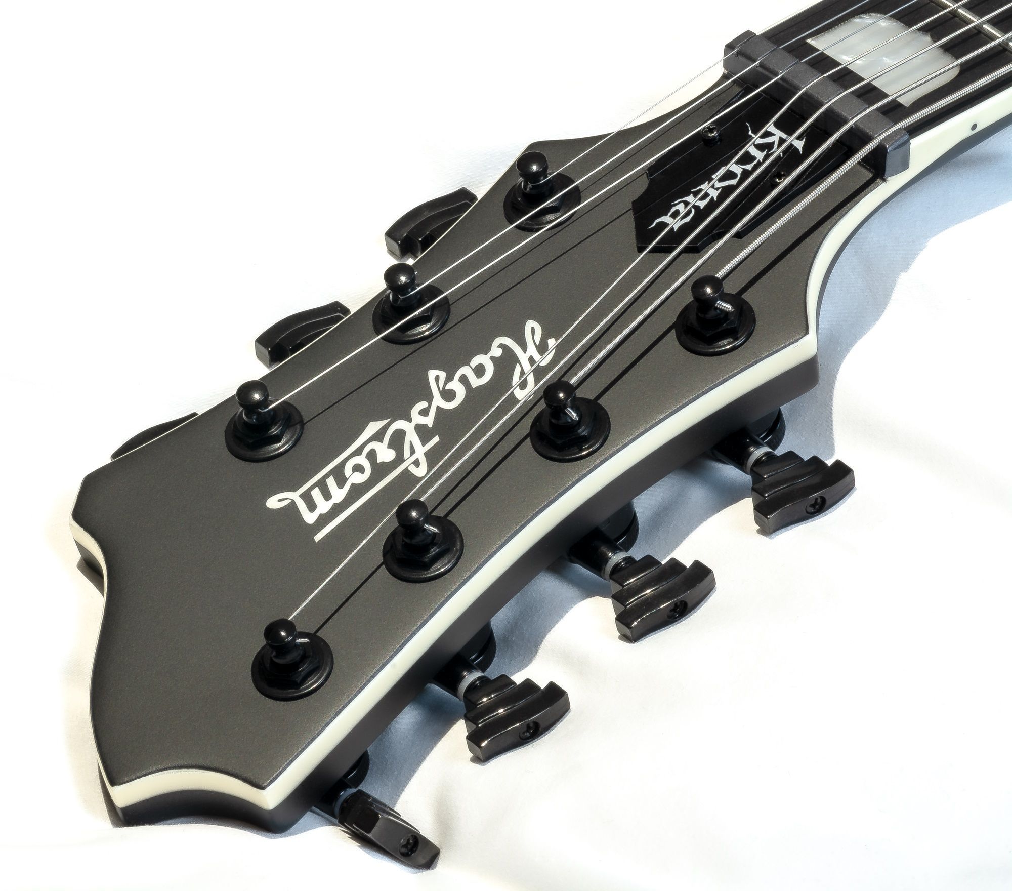 Hagstrom Krona 7 - Burnt Charcol Decke: Riegelahorn Korpus: Mahagoni Hals: Mahagoni Halsprofil: Slim C Griffbrett: Resinator Griffbrettradius: 15' Mensur: 64,8 cm (25,5') Sattelbreite: 48 mm Sattel: GraphTech Inlays: Pearloid Hagstrom Crest, Shield of Arms im 12. Bund 22 Medium Jumbo Bünde Tonabnehm