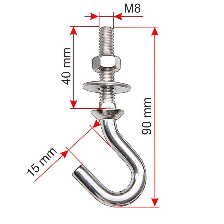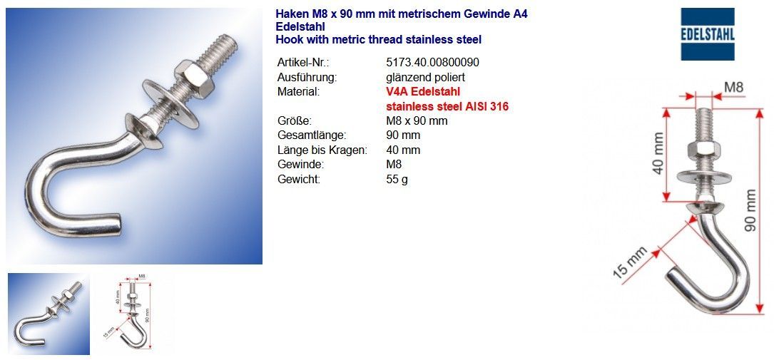 Haken M8 x 90 mm mit metrischem Gewinde A4 Edelstahl