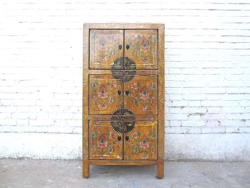 Halbhohe Asia Kommode antikgelber Korpus bunt bemalte Pinie. Luxury Park