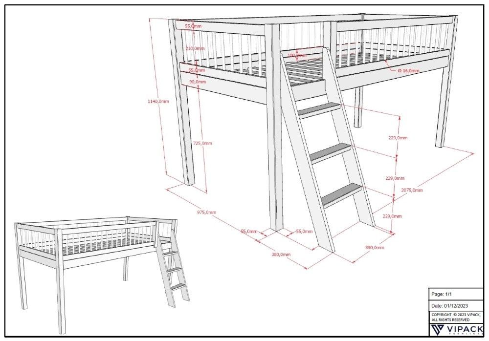 VIPACK Halbhohes Bett Kinderbett 90x200 Kindermöbel Lattenrost Spielbett Buche natur