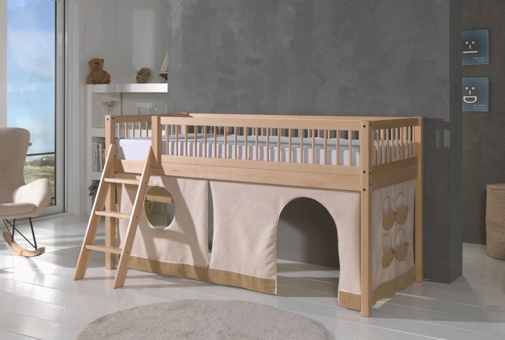 VIPACK Halbhohes Bett Kinderbett 90x200 Vorhangset Lattenrost Spielbett Buche massiv Natur