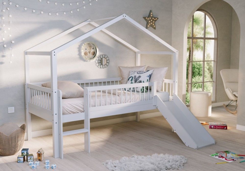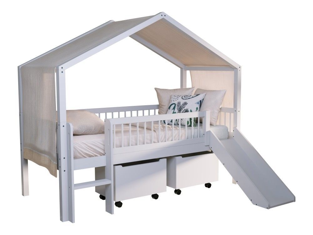 VIPACK Halbhohes Hausbett Rollboxen Rutsche Lattenrost 90x200 Himmel Buche massiv Weiß
