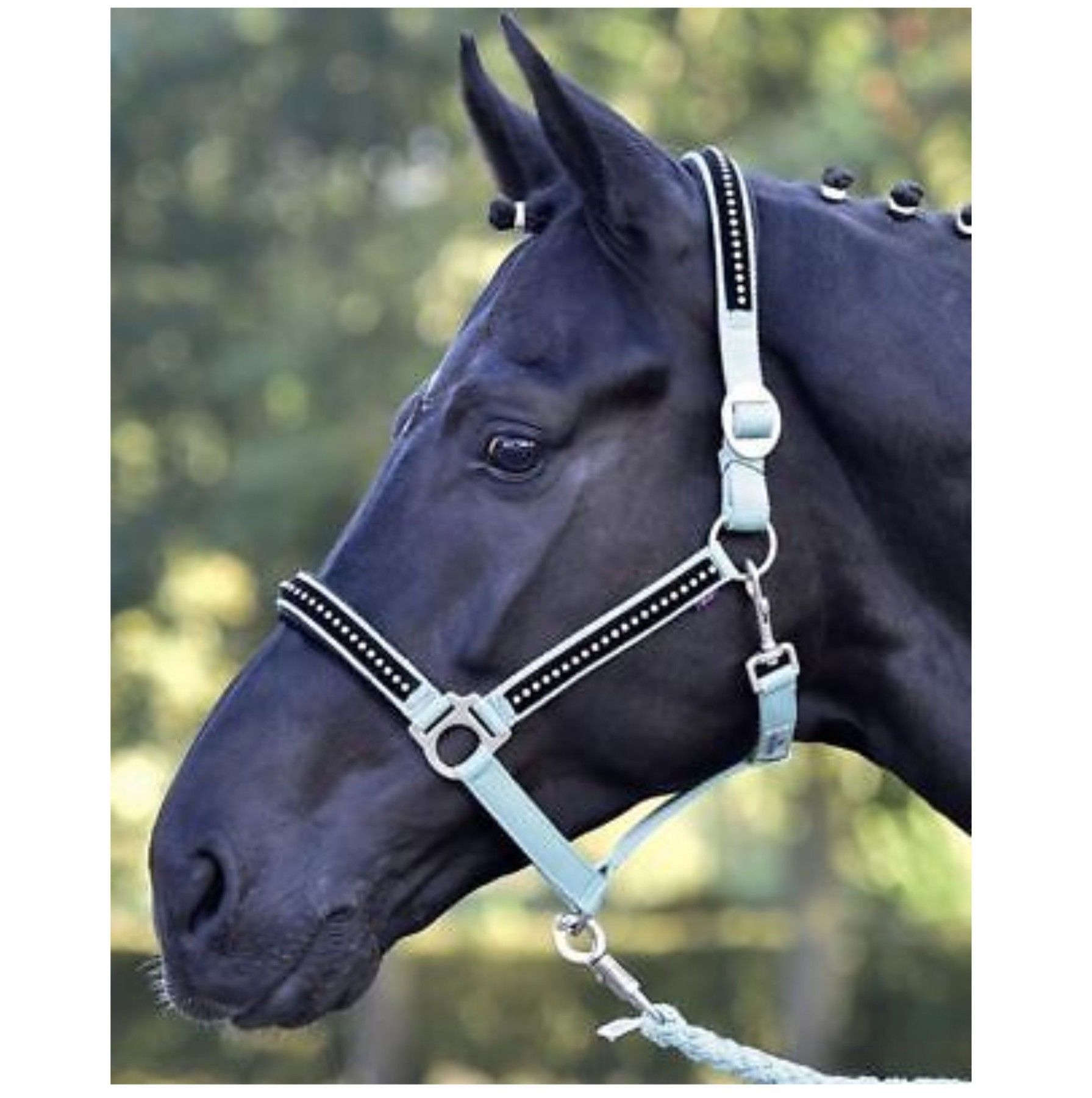Busse Halfter Strass · doppelt gelegtes, robustes Gurthalfter · mit Strasssteinen an Nasen-, Backen- und Genickriemen verziert · an Nase und Genick super weich gepolstert · Genickstück seitlich stufenlos verstellbar · Kehlriemen mit Karabinerhaken · mattiert