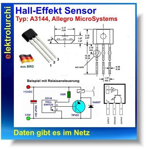 Sie bieten hier auf folgende Artikel NEU 3 Stück Hall-Effekt-Sensor A3144, Magnetsensor, Magnetfeldsensor,TLE,Arduino komp. Integrierter Schaltkreis zur Erfassung von Magnetfeldern mittels des Halleffekts. Hinweis: Der Sensor alleine eignet sich NICHT um einen Schaltvorgang auszuführen. Das Signal i