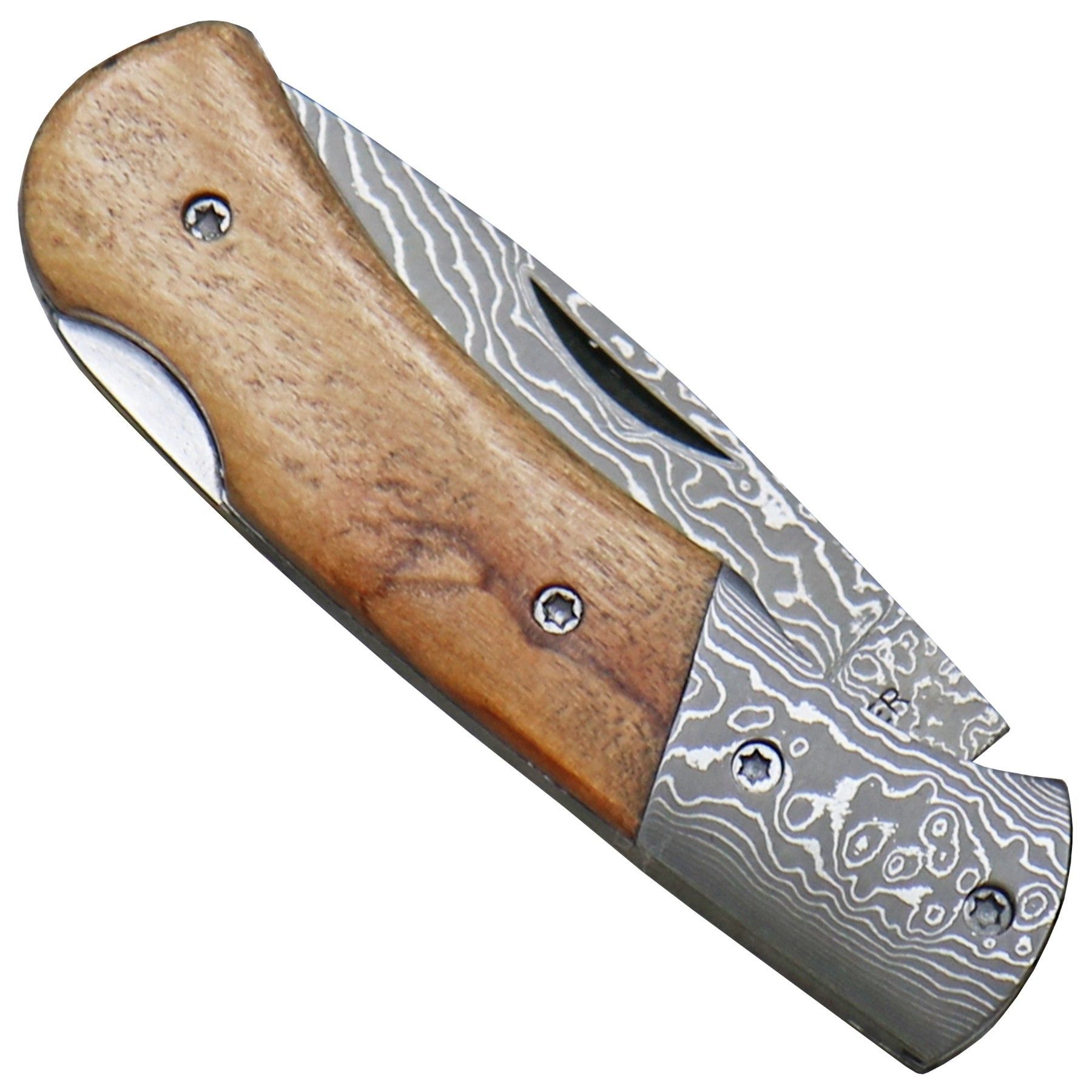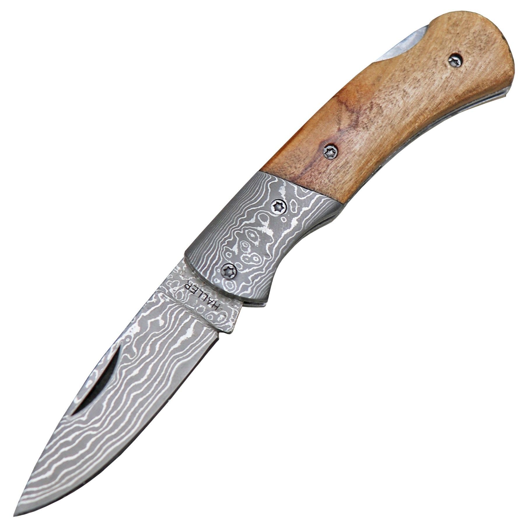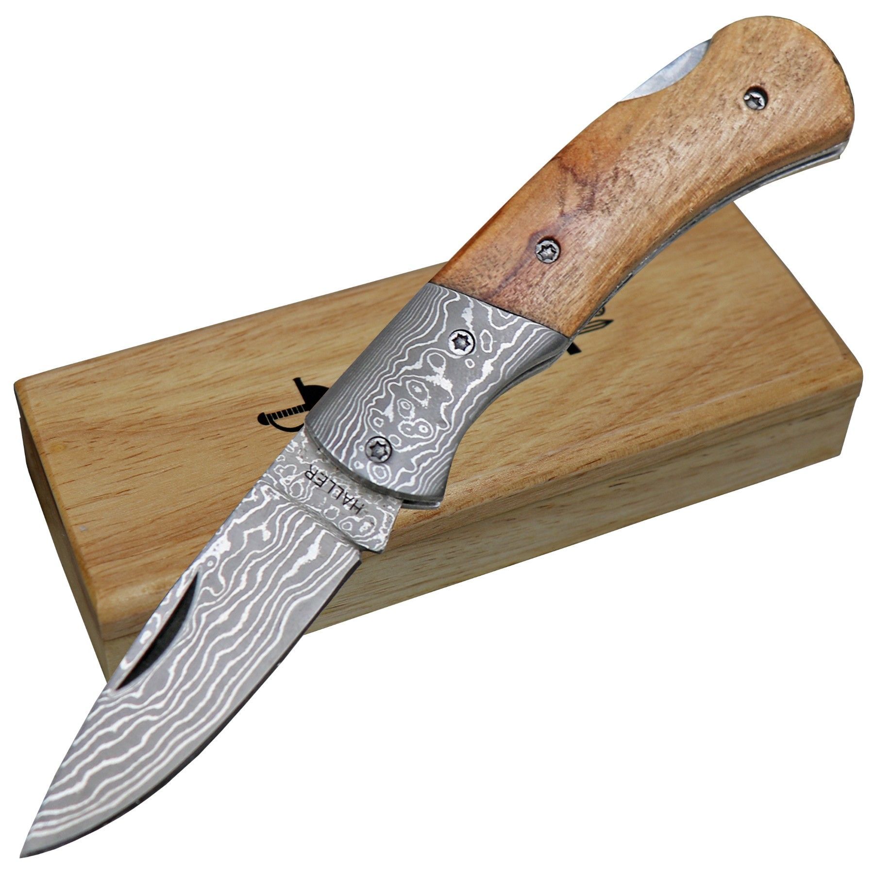 Haller Damast kleines Damast Taschenmesser Backlock Olivenholzgriff Holz Geschenkbox