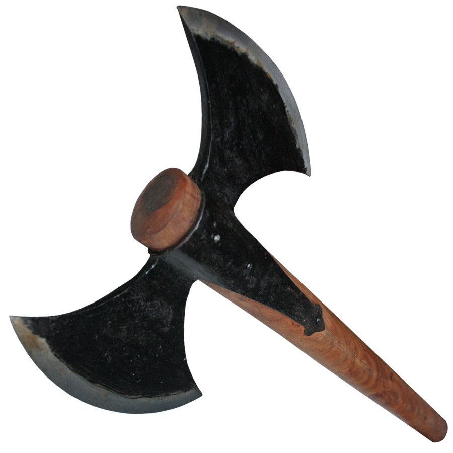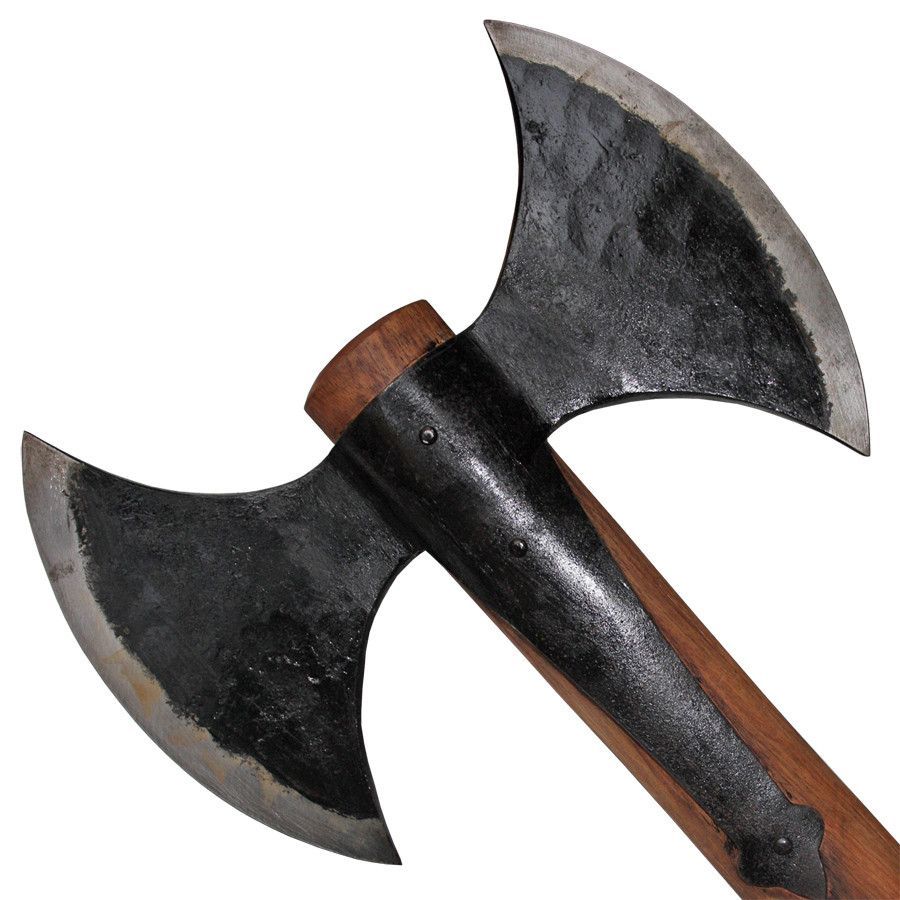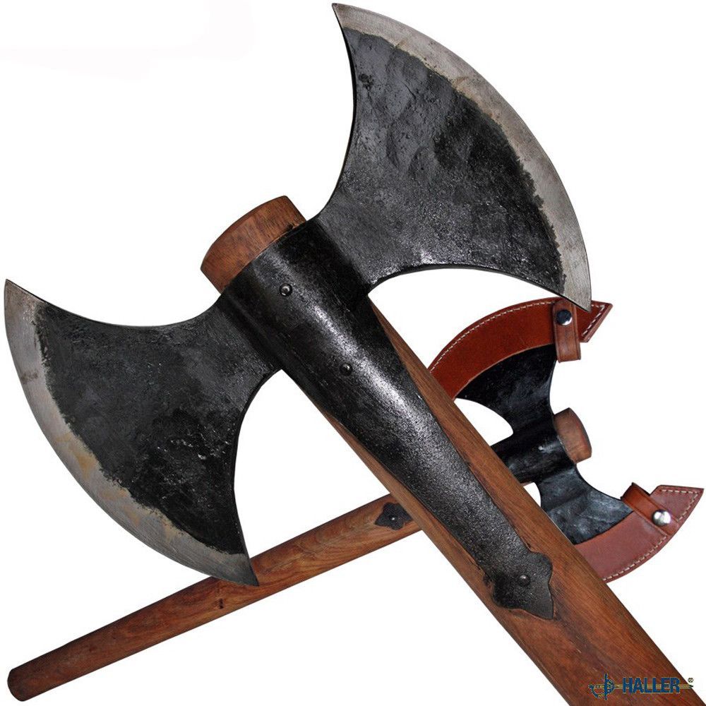 Haller Haller Wikinger Doppel Axt geschmiedet mit Lederschutz, dunkler Holzstiel, Historie