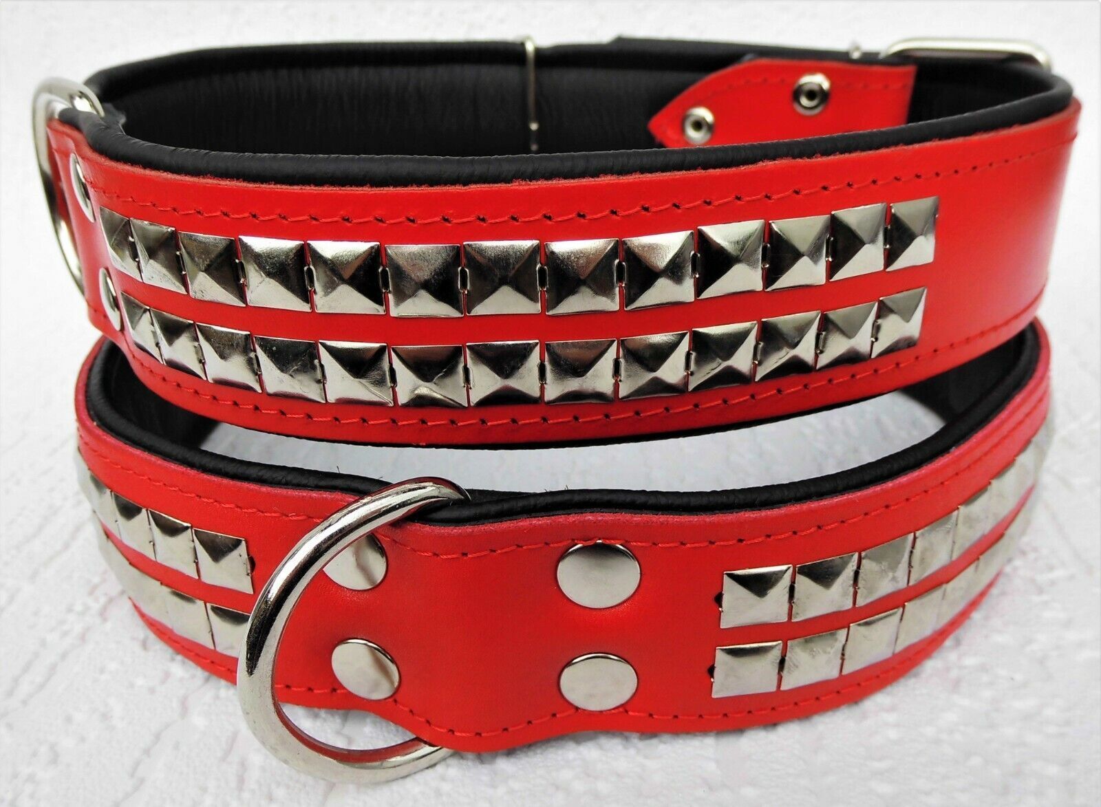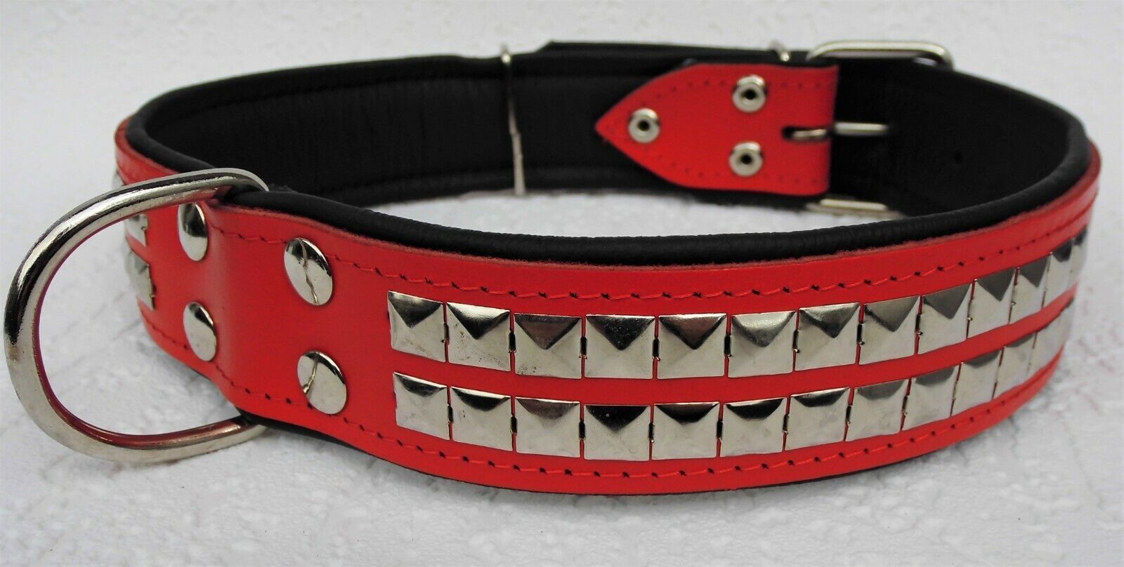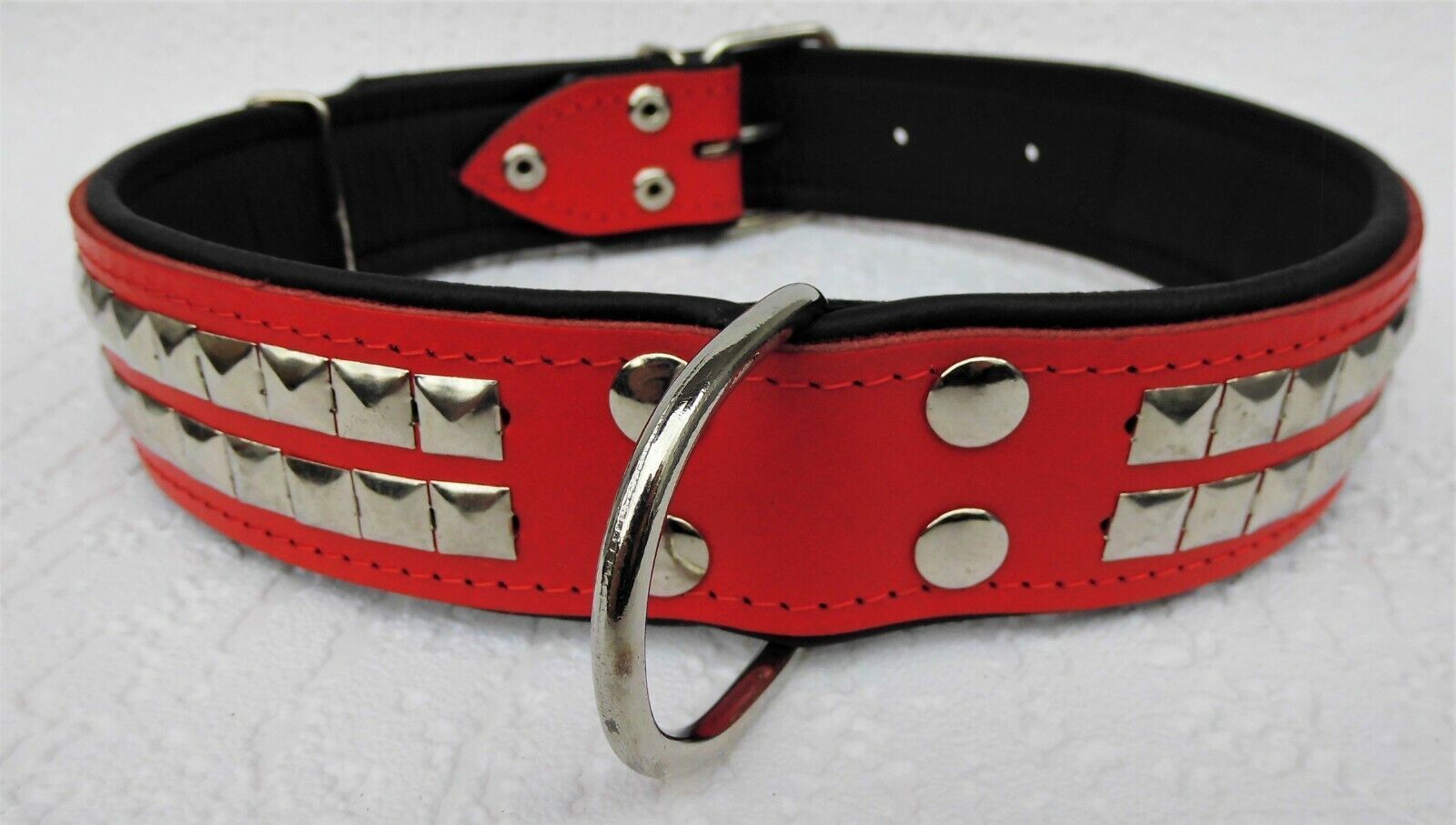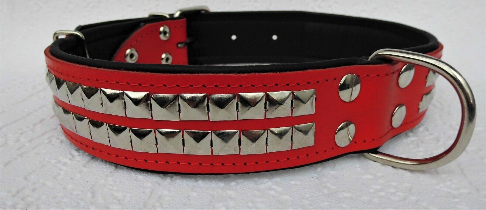 Lederhalsband grosse Zierwürfel doppelt Maße: Gesamtlänge : 75 cm Halsumfang : 52 - 66 cm Breit : 40 mm Messen Sie hierzu bitte den Hals ihres Hundes. Material : - 100 % hochwertiges Leder, sehr robust - ROT verziert mit grossen Zierwürfel - vernäht und gepolstert mit weichem Leder Bitte beachten Si