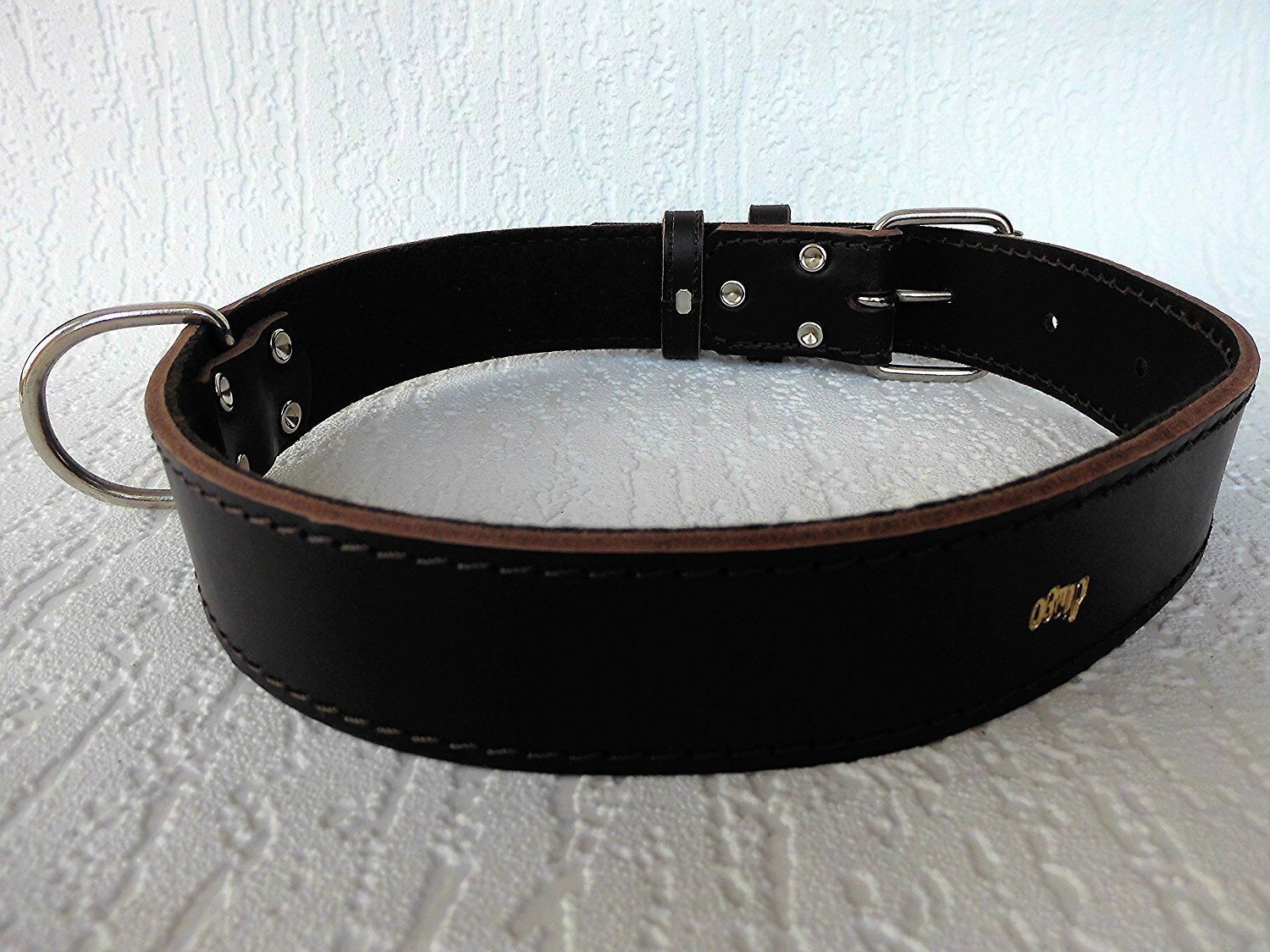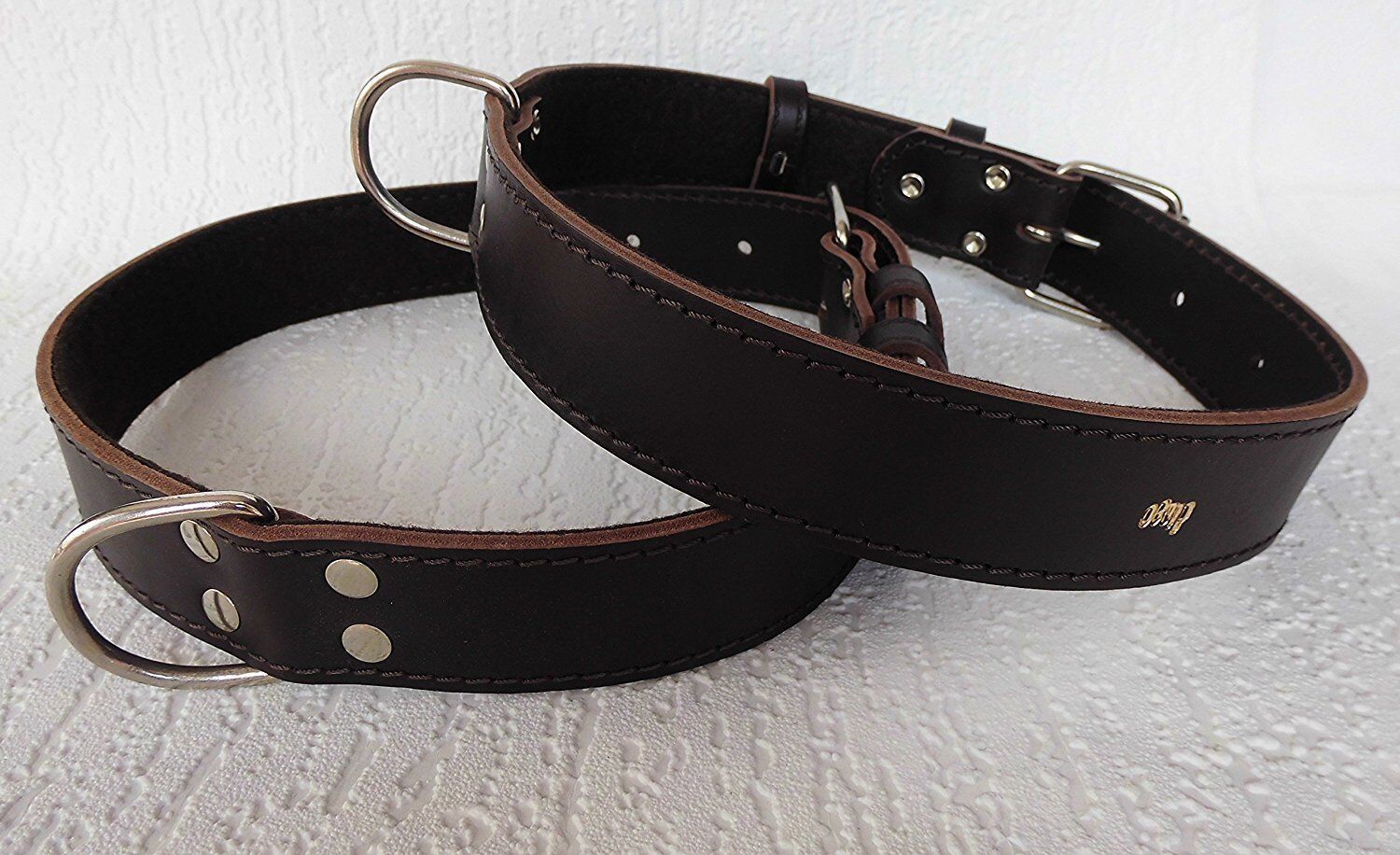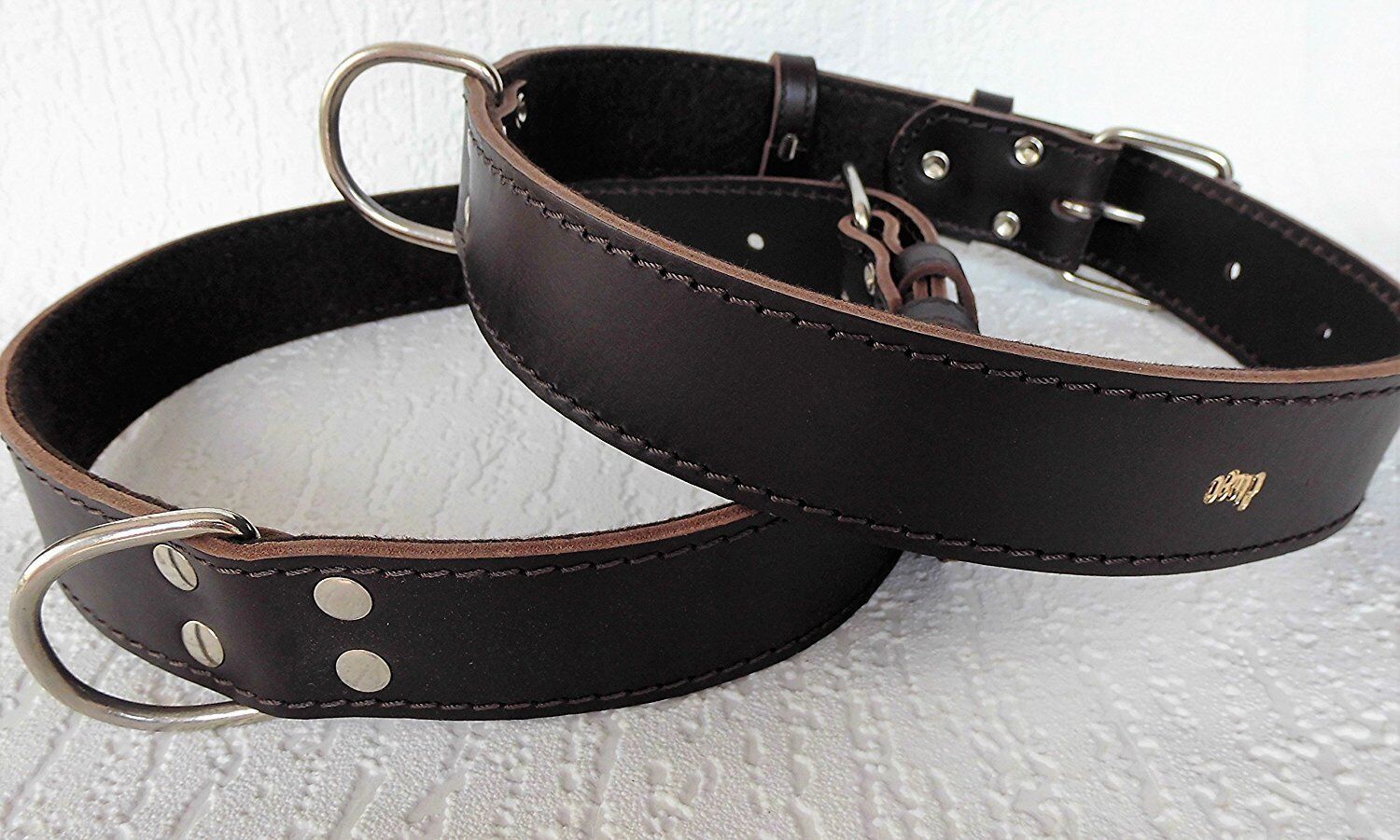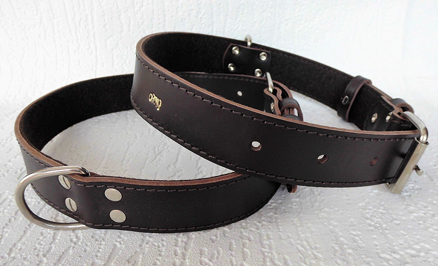 Lederhalsband ***Braun*** Maße: Gesamtlänge : 87 cm Halsumfang : 60 - 75 cm (erste und letzte Loch) Breit : 50 mm Messen Sie hierzu bitte den Hals ihres Hundes. Material : - 100 % hochwertiges Leder, sehr robust - vernäht und gepolstert mit weichem Filz Bitte beachten Sie auch andere Angebote!