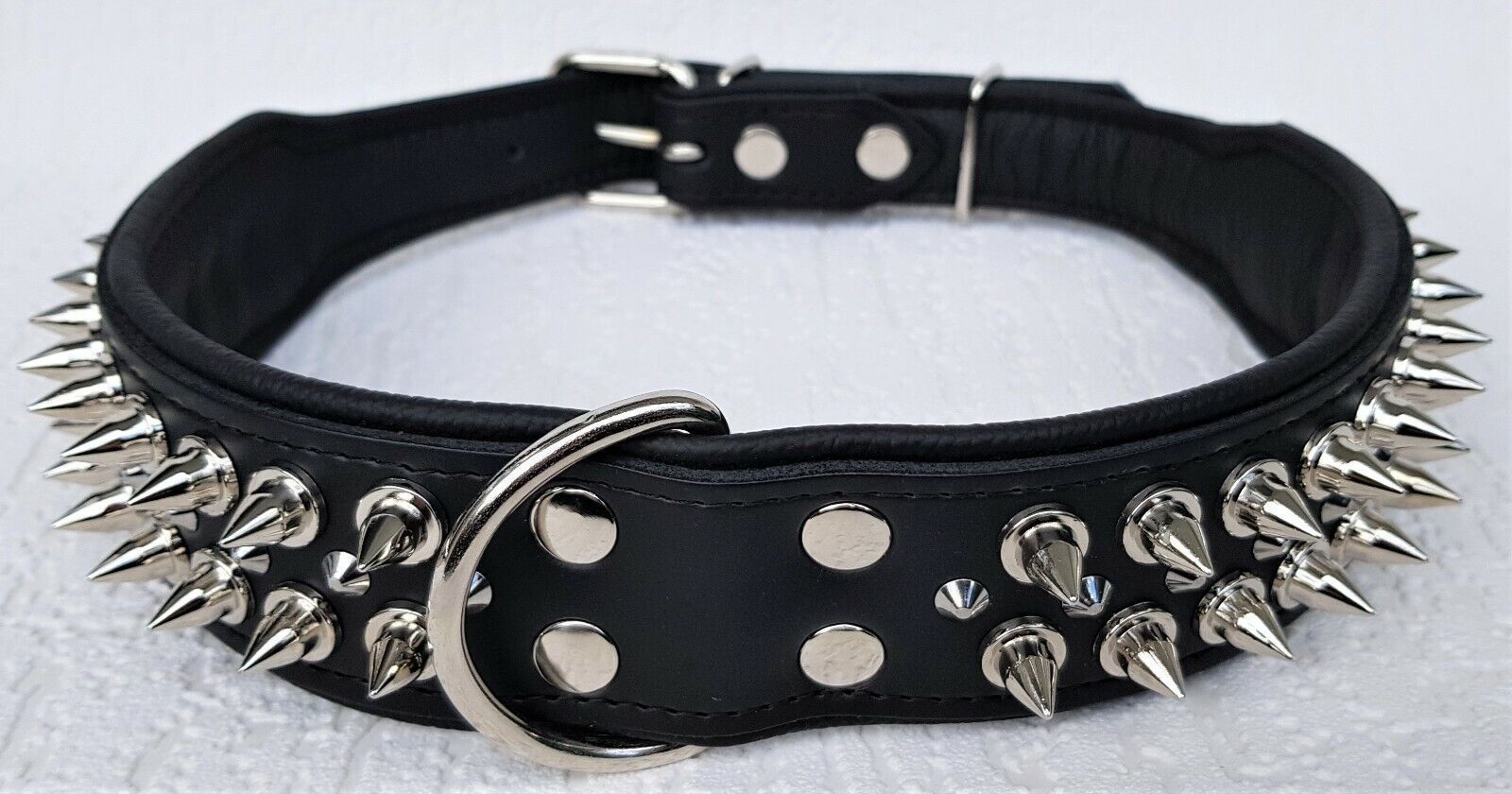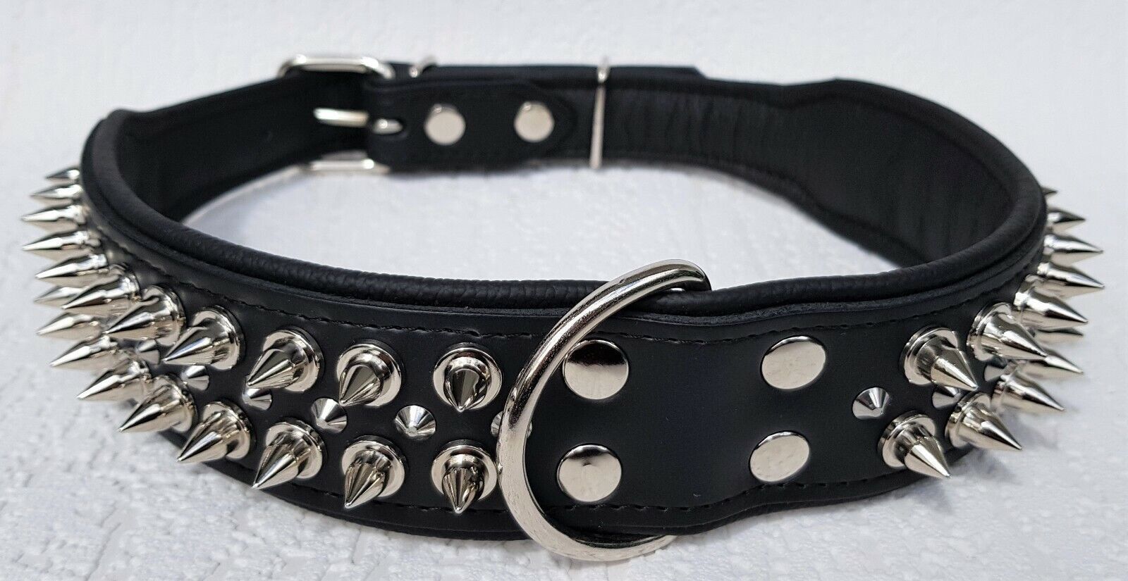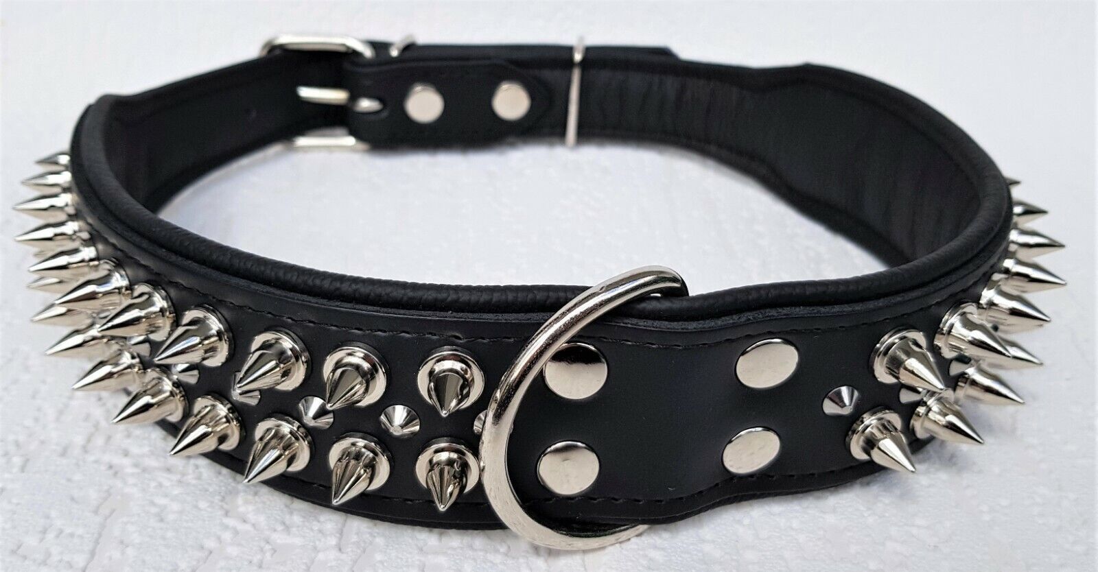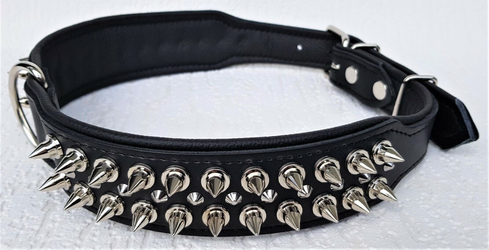 Lederhalsband mit STACHELN Maße: Gesamtlänge : 80 cm Halsumfang : 62 - 73 cm Breit : 50 mm Messen Sie hierzu bitte den Hals ihres Hundes. Material : - 100 % hochwertiges Leder, sehr robust - Schwarz verziert mit runden Stacheln - gefüttert mit Leder Bitte beachten Sie auch andere Angebote!