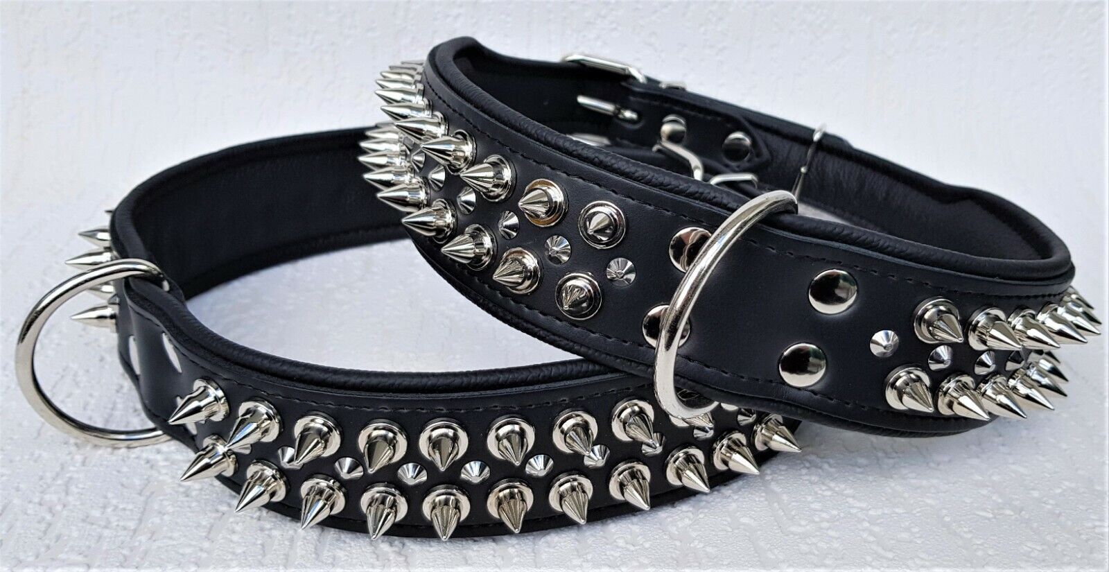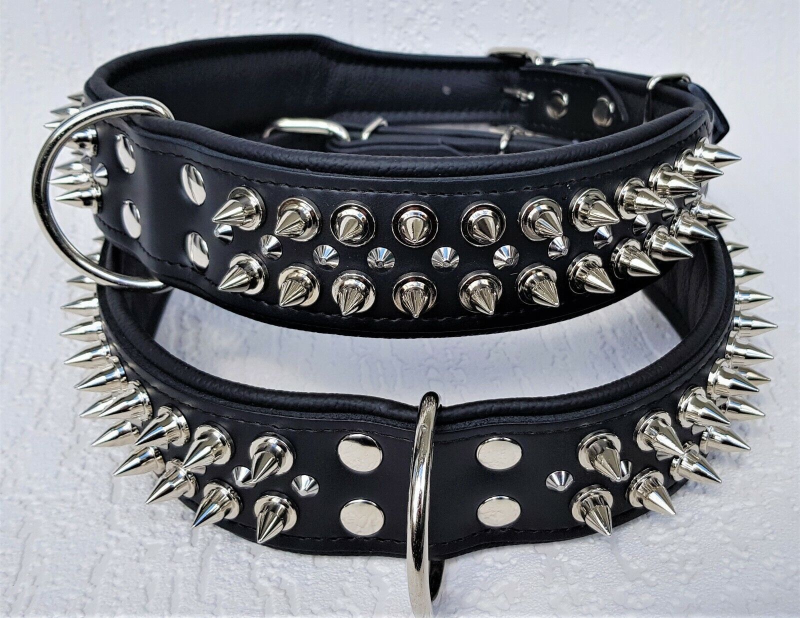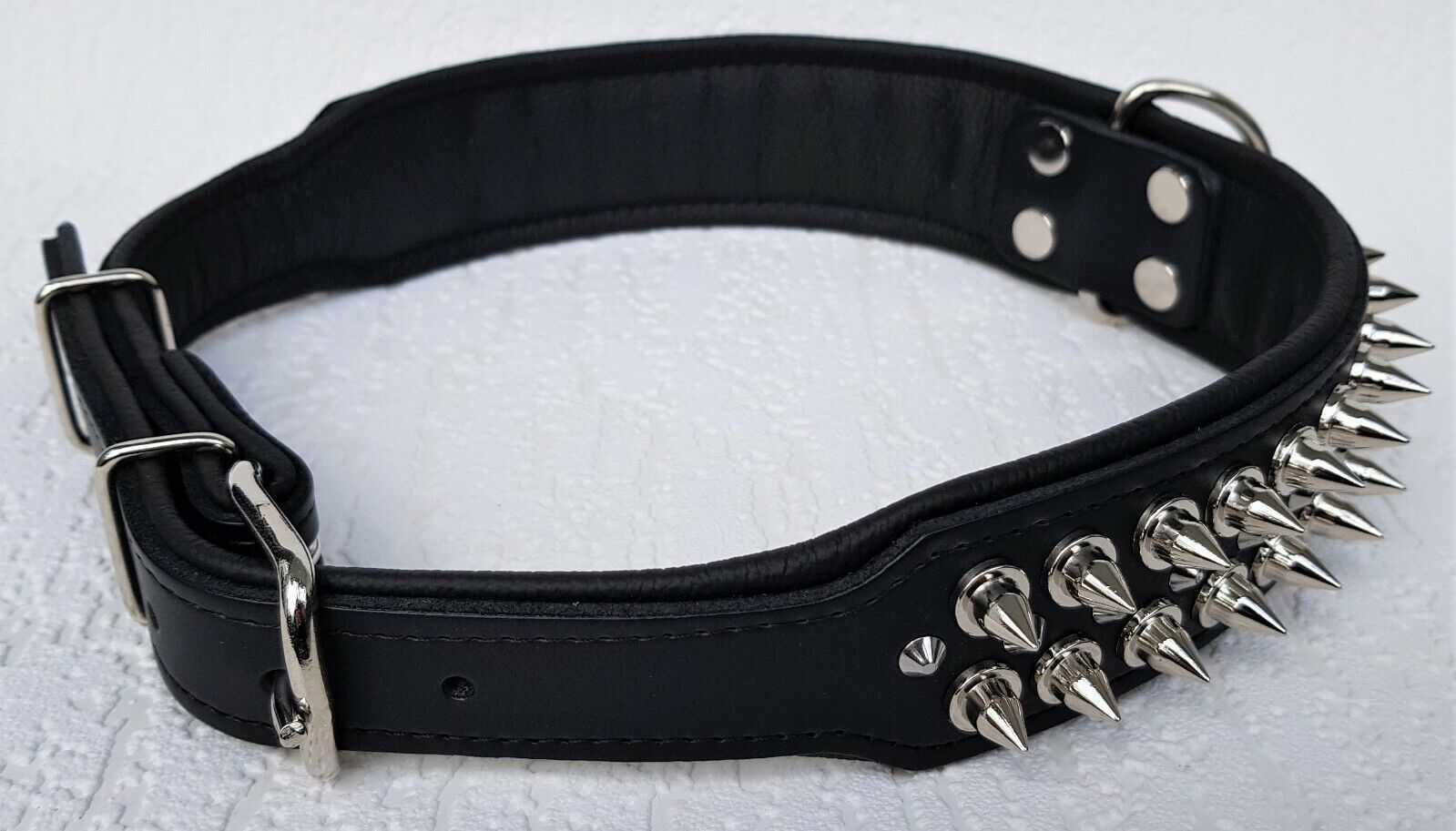 Lederhalsband mit STACHELN Maße: Gesamtlänge : 80 cm Halsumfang : 62 - 73 cm Breit : 50 mm Messen Sie hierzu bitte den Hals ihres Hundes. Material : - 100 % hochwertiges Leder, sehr robust - Schwarz verziert mit runden Stacheln - gefüttert mit Leder Bitte beachten Sie auch andere Angebote!